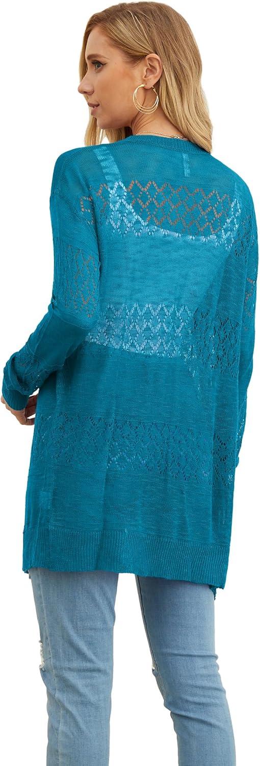 GRECERELLE Women's Lightweight Crochet Long Sleeve Loose Casual Open Front Cardigan Drape Sweaters Boho Summer Beach Coverups(Blue)