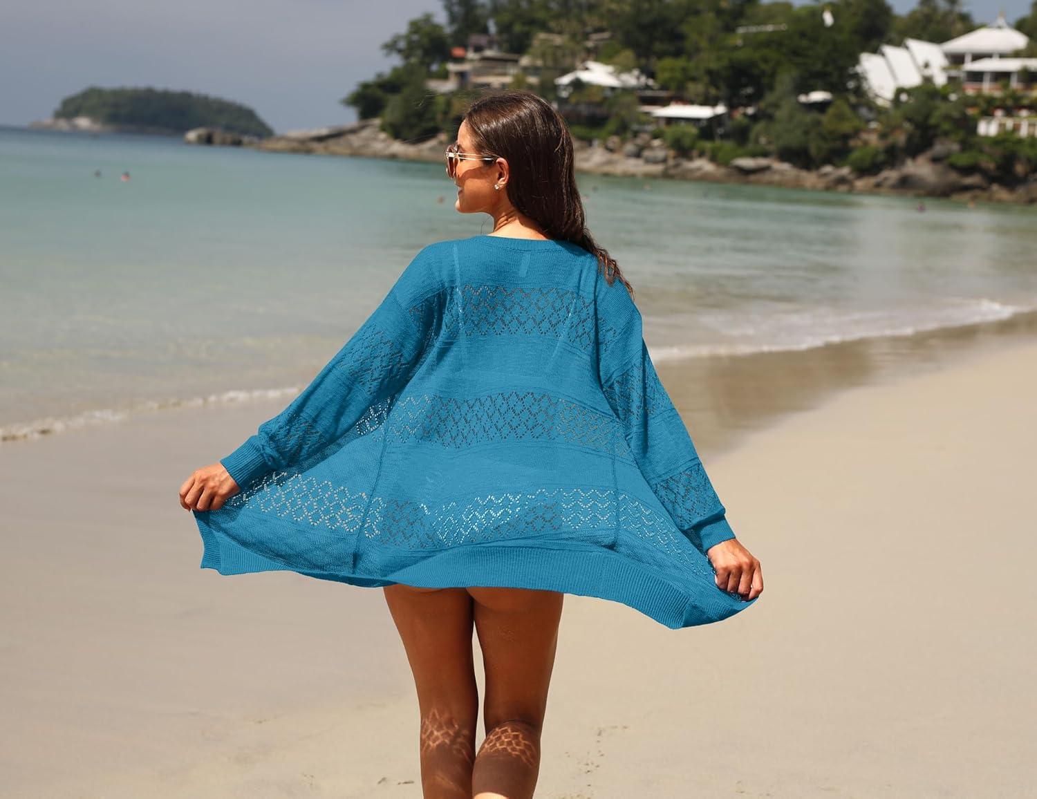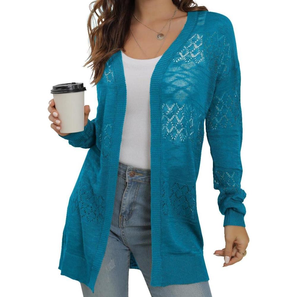 GRECERELLE Women’s Lightweight Crochet Long Sleeve Loose Casual Open Front Cardigan Drape Sweaters Boho Summer Beach Coverups(Blue)