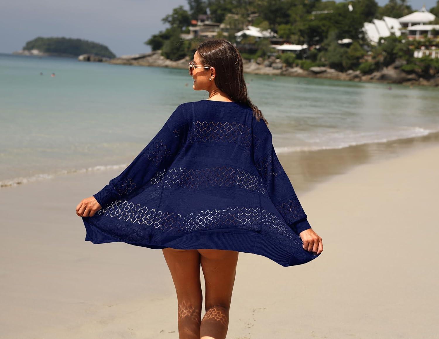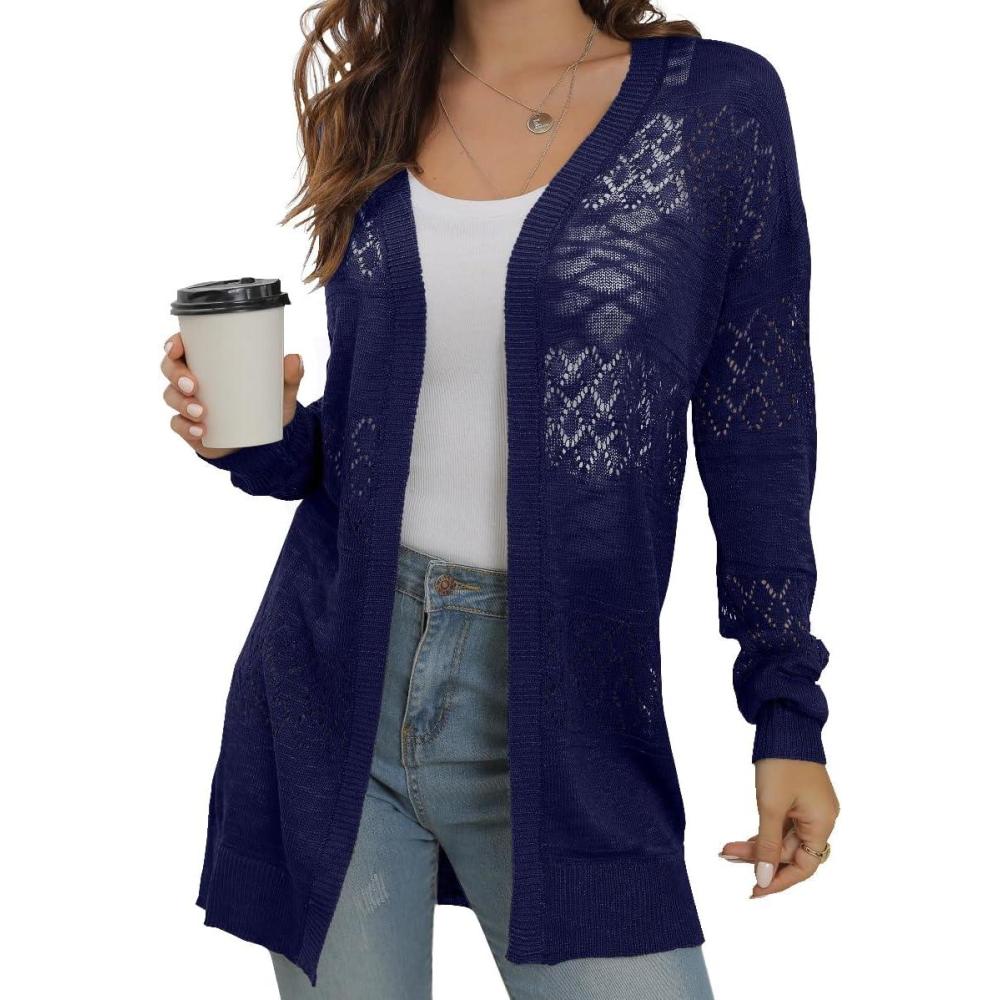 GRECERELLE Women’s Lightweight Crochet Long Sleeve Loose Casual Open Front Cardigan Drape Sweaters Boho Summer Beach Coverups(Navy Blue)