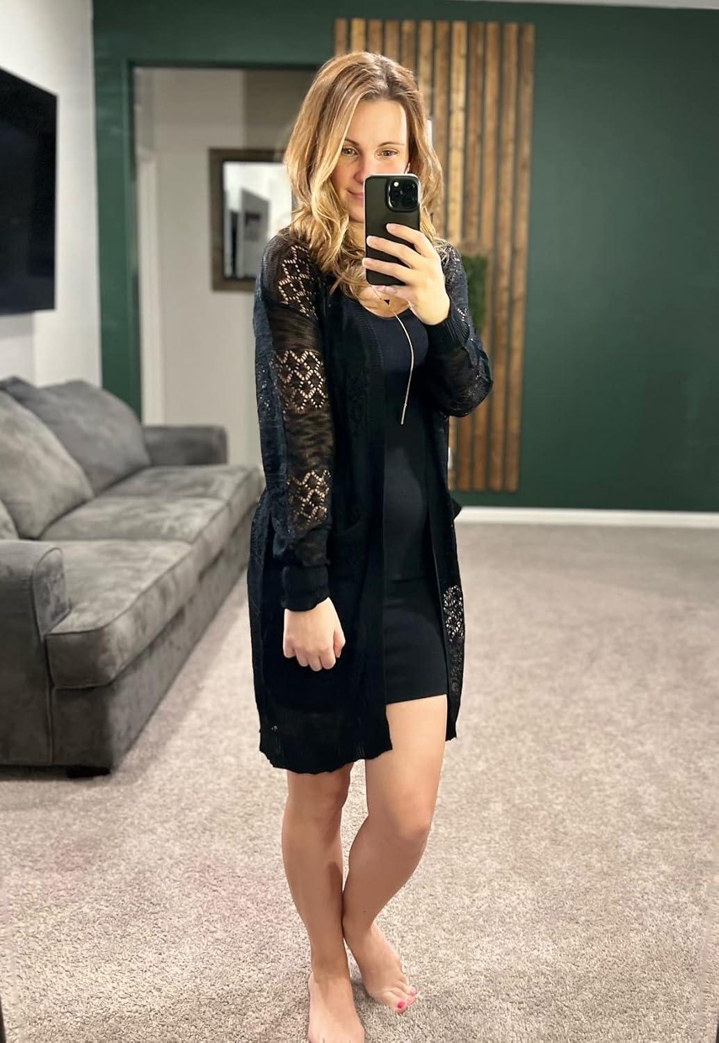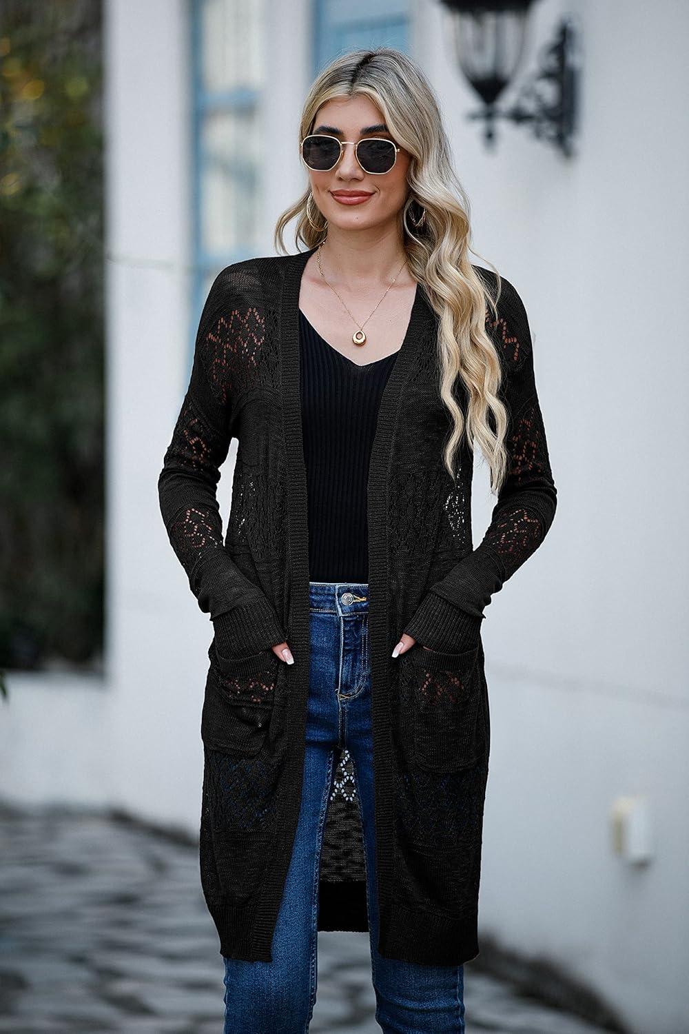 GRECERELLE Womens Lightweight Longer Length Cardigan Long Sleeve Casual Crochet Open-Front Sweater with Pockets(01 Long-black)