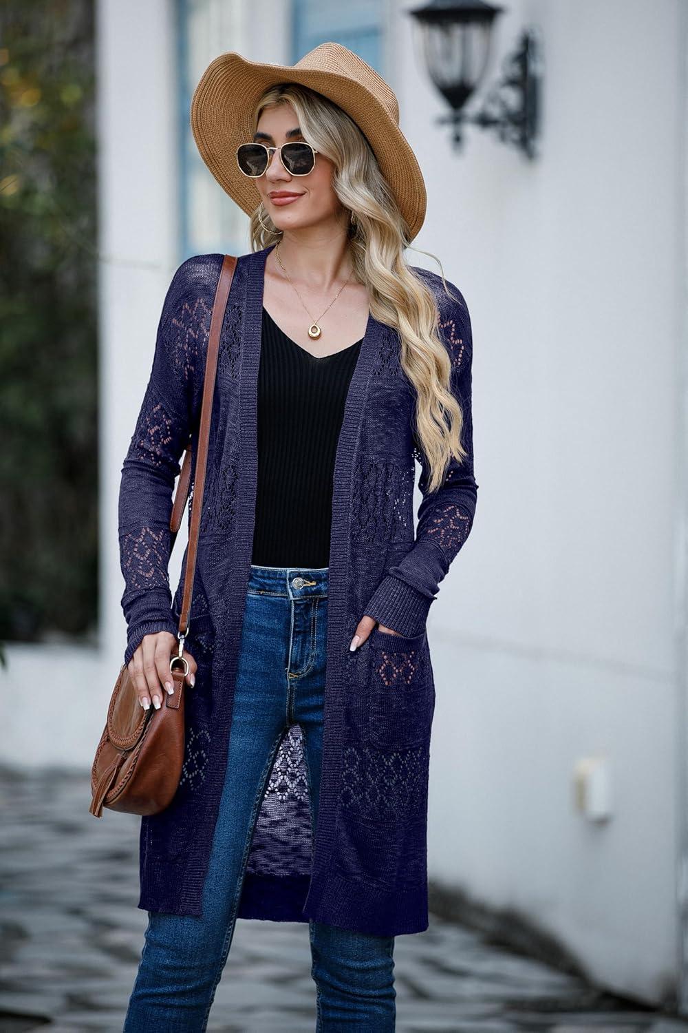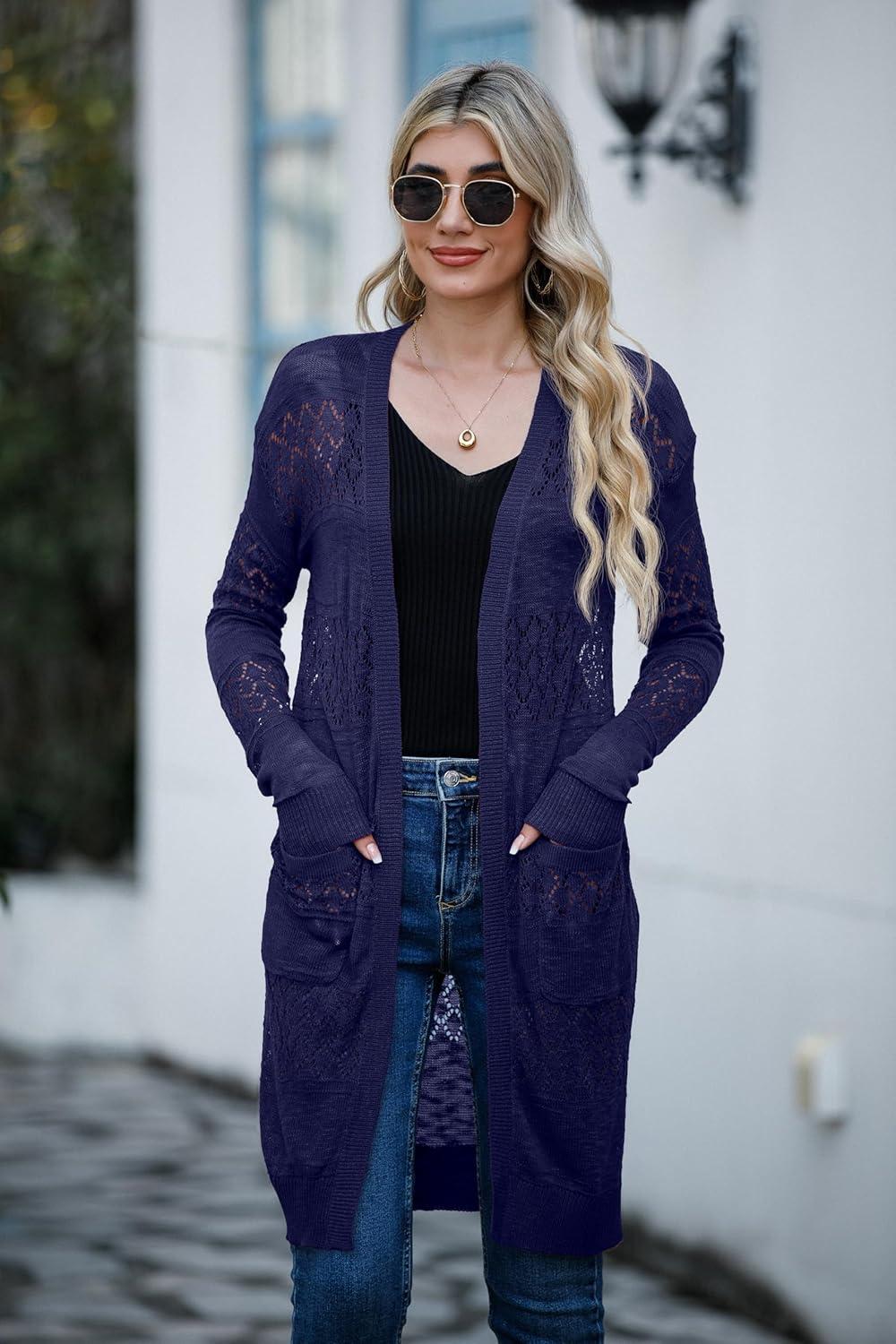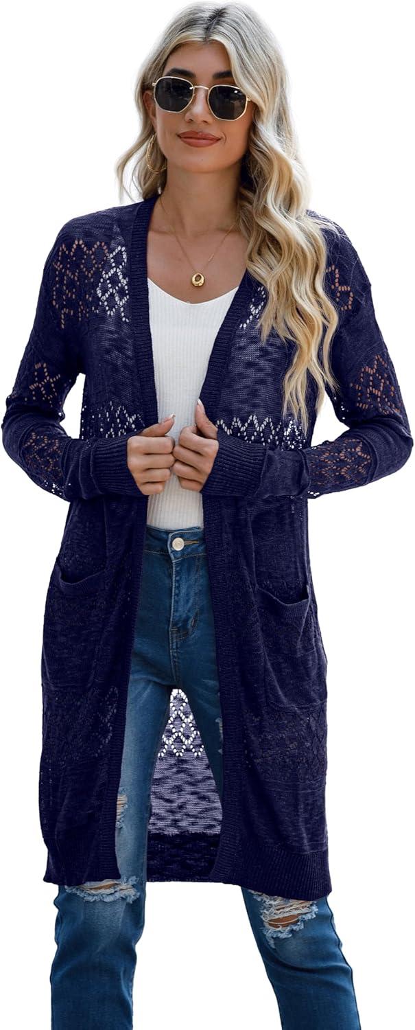 GRECERELLE Womens Lightweight Longer Length Cardigan Long Sleeve Casual Crochet Open-Front Sweater with Pockets(05 Long-navy Blue)