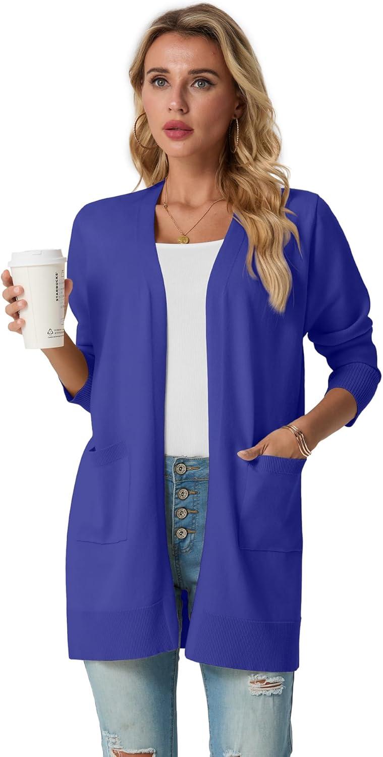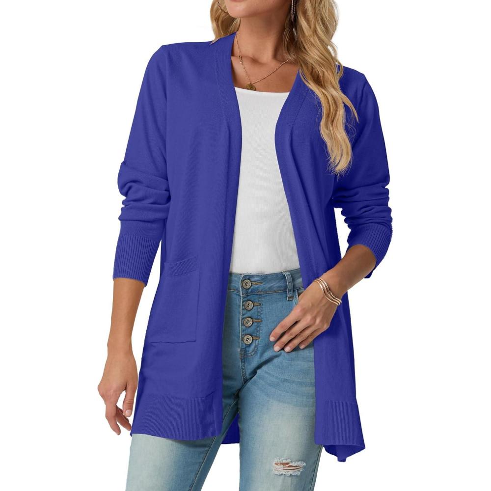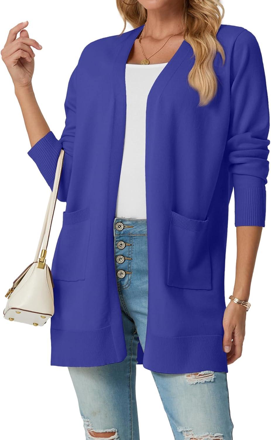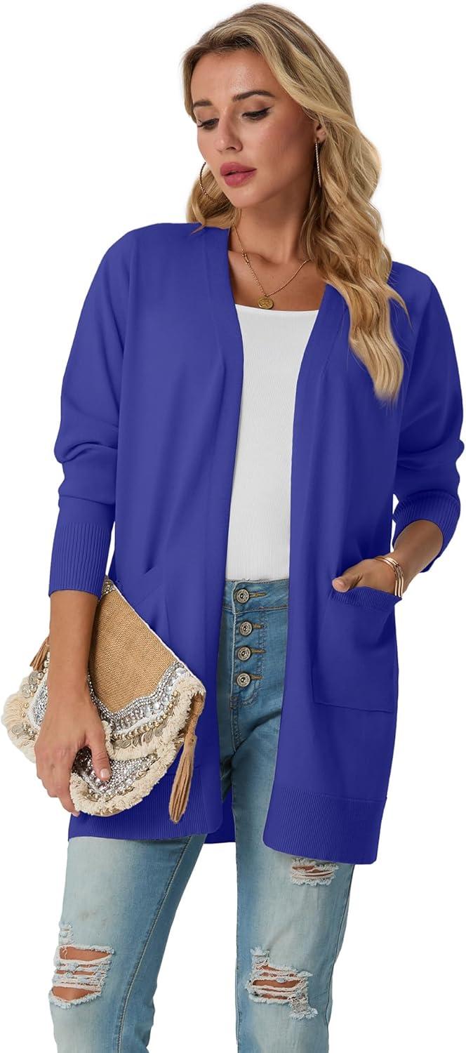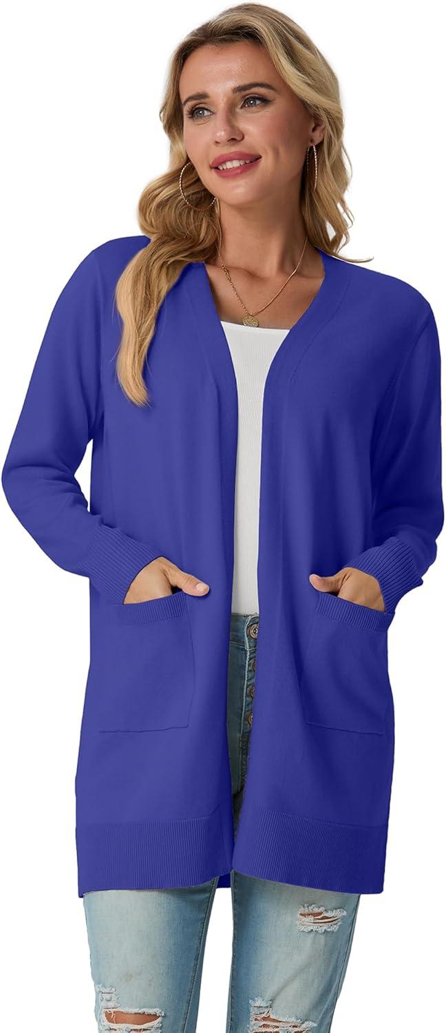 GRECERELLE Womens Lightweight Open Front Casual V-Neck Long Cardigan Sweater with Pockets, S-2XL(Bright Blue)