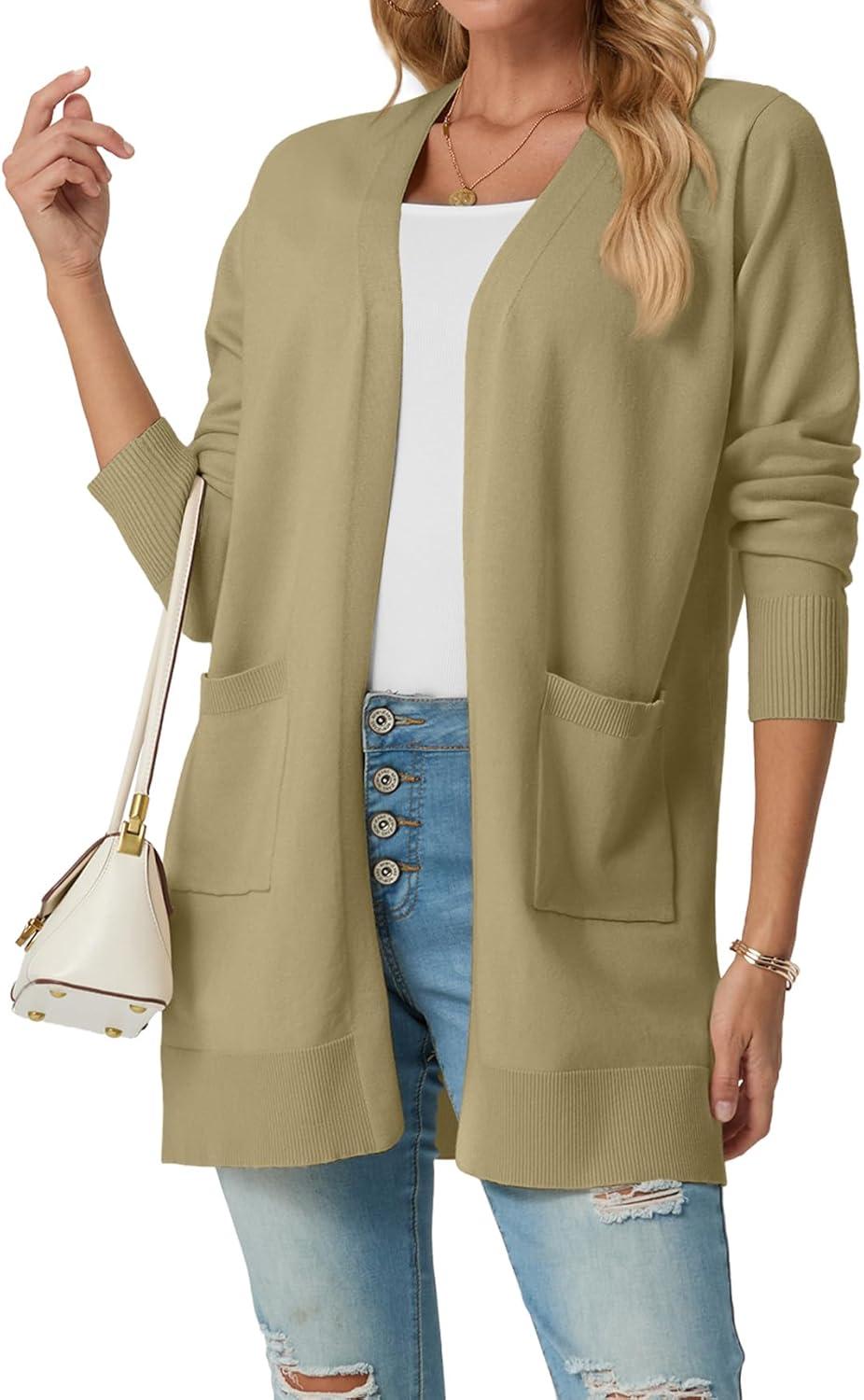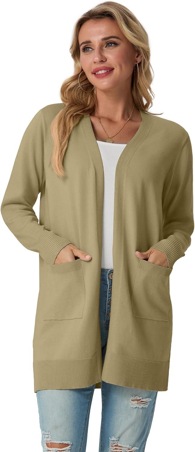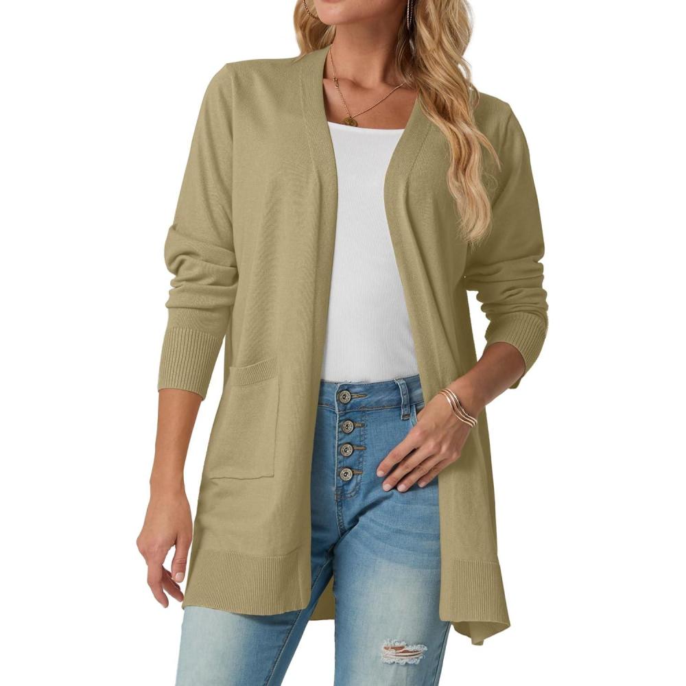 GRECERELLE Womens Lightweight Open Front Casual V-Neck Long Cardigan Sweater with Pockets, S-2XL(Khaki)