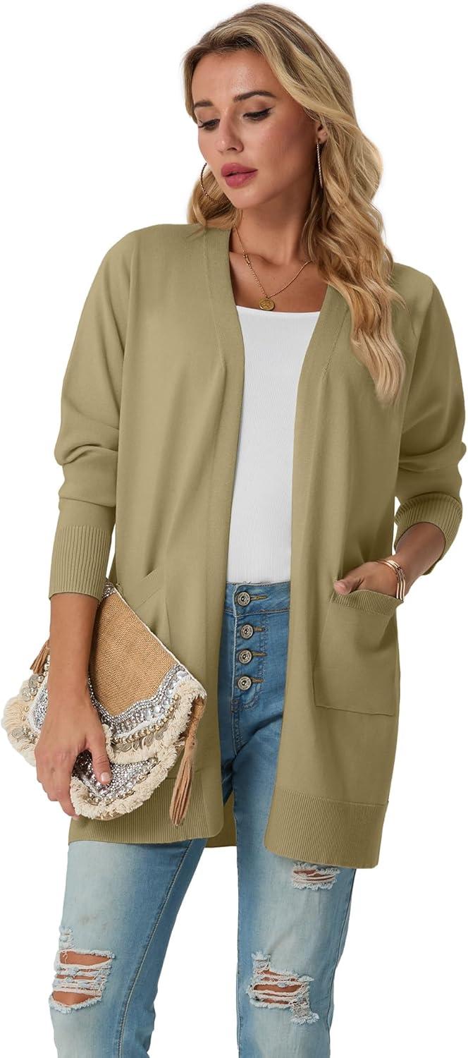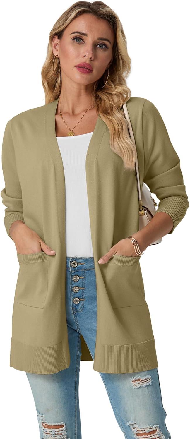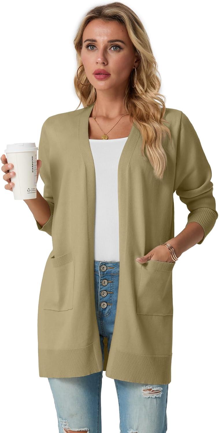 GRECERELLE Womens Lightweight Open Front Casual V-Neck Long Cardigan Sweater with Pockets, S-2XL(Khaki)