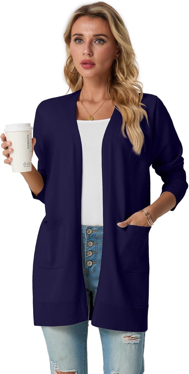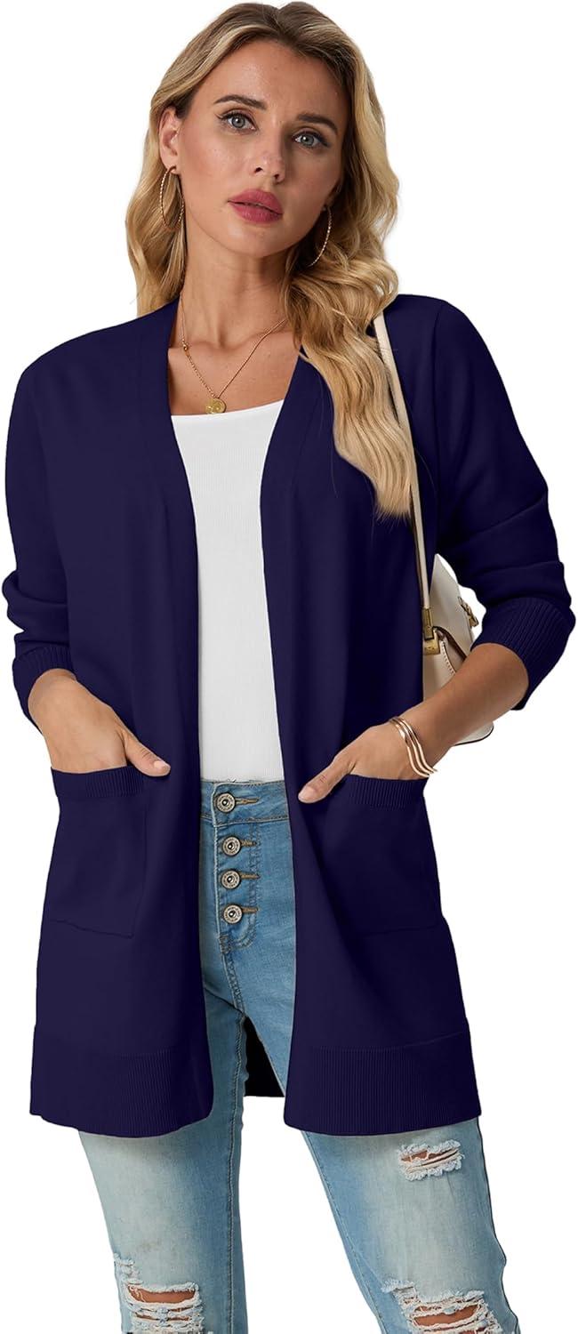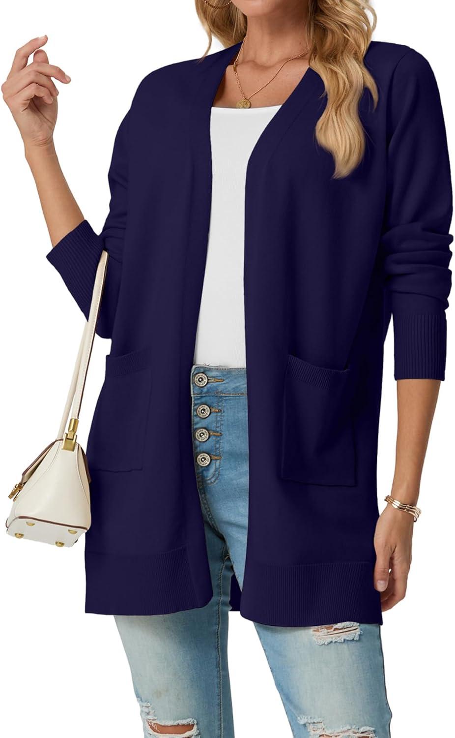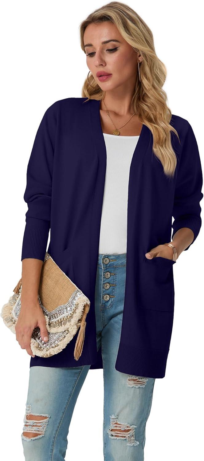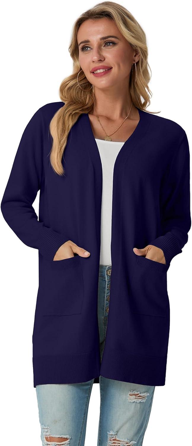 GRECERELLE Womens Lightweight Open Front Casual V-Neck Long Cardigan Sweater with Pockets, S-2XL(Navy Blue)