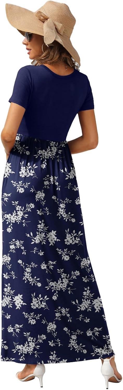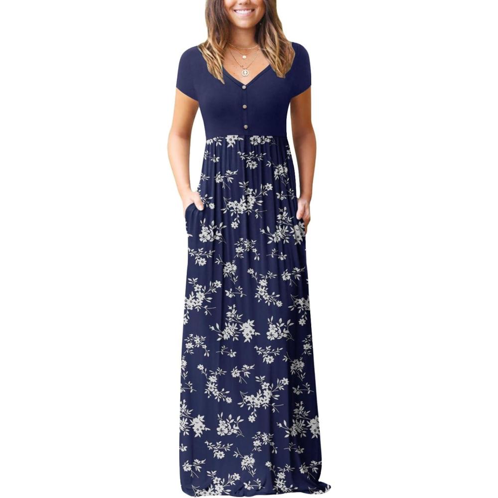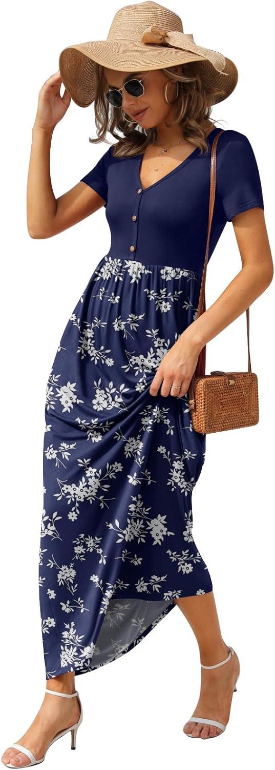 GRECERELLE Womens Long Maxi Dresses 2025 Short Sleeve V Neck Casual Summer Button Dress with Pockets(Blue Small Flower)