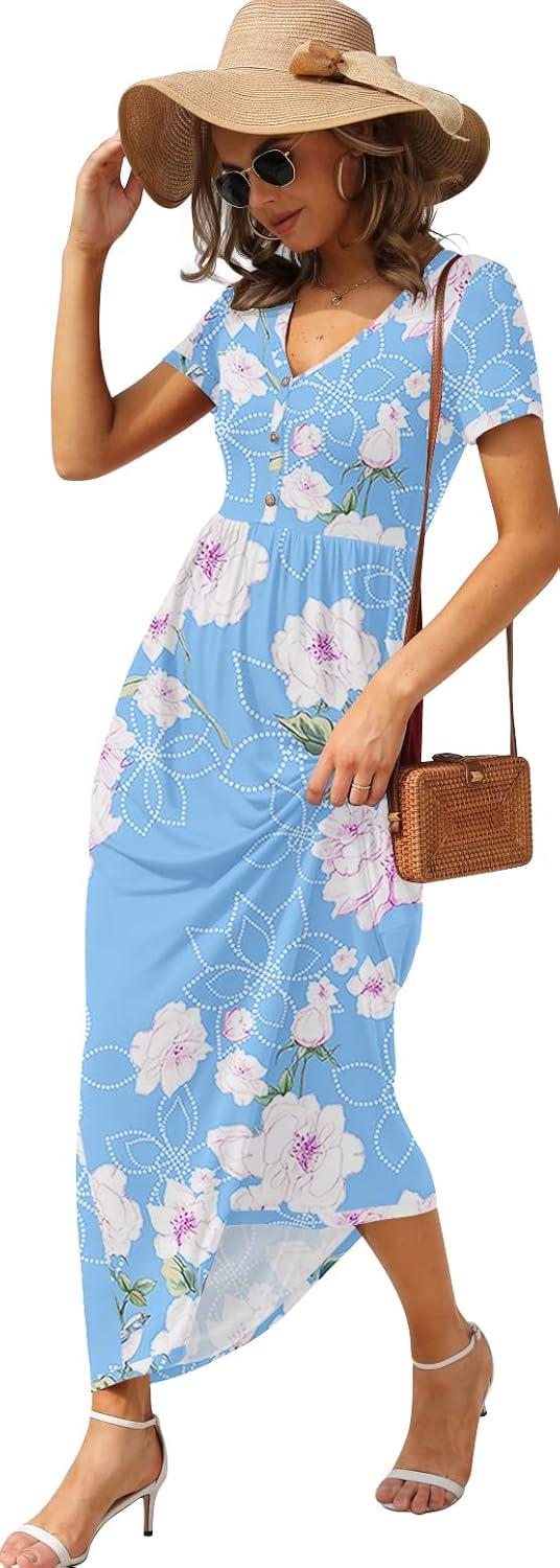 GRECERELLE Womens Long Maxi Dresses 2025 Short Sleeve V Neck Casual Summer Button Dress with Pockets(Flower Kapok Light Blue)