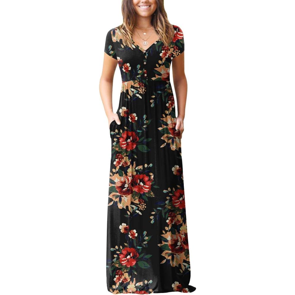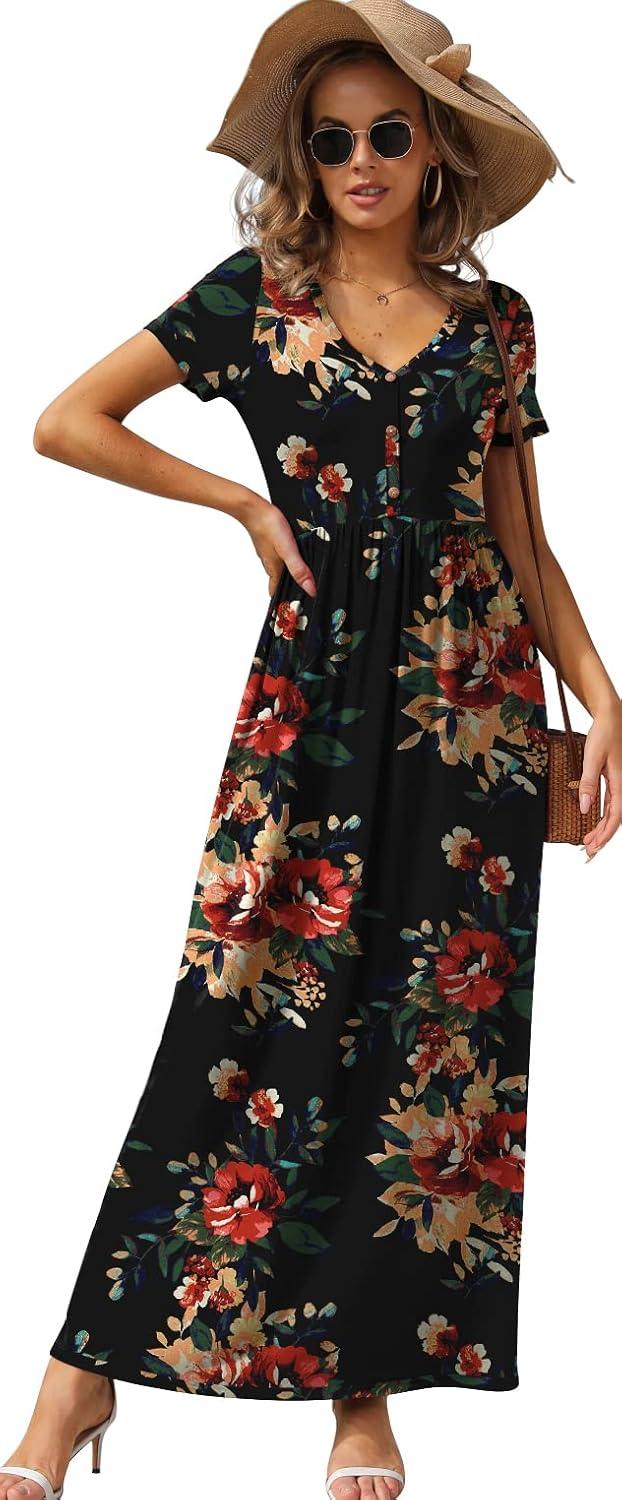 GRECERELLE Womens Long Maxi Dresses 2025 Short Sleeve V Neck Casual Summer Button Dress with Pockets(Flower Red Brown Black)