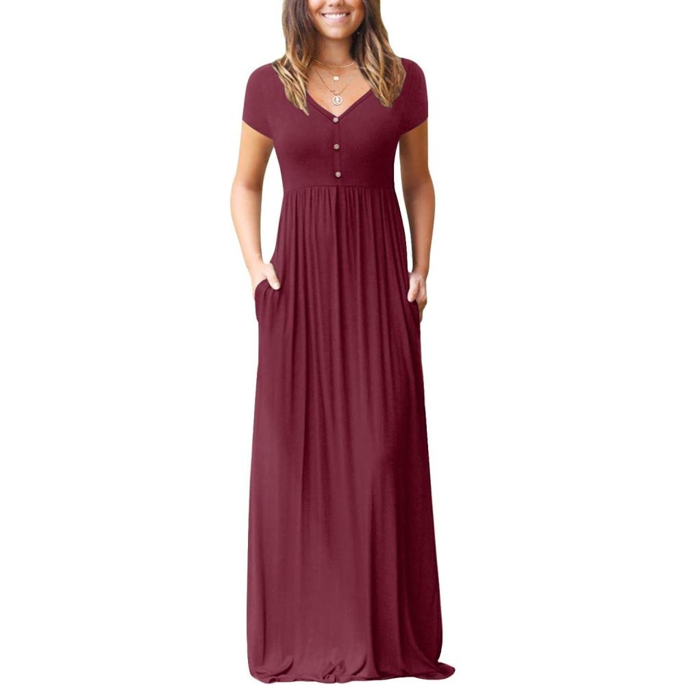 GRECERELLE Womens Long Maxi Dresses 2025 Short Sleeve V Neck Casual Summer Button Dress with Pockets(Wine Red)