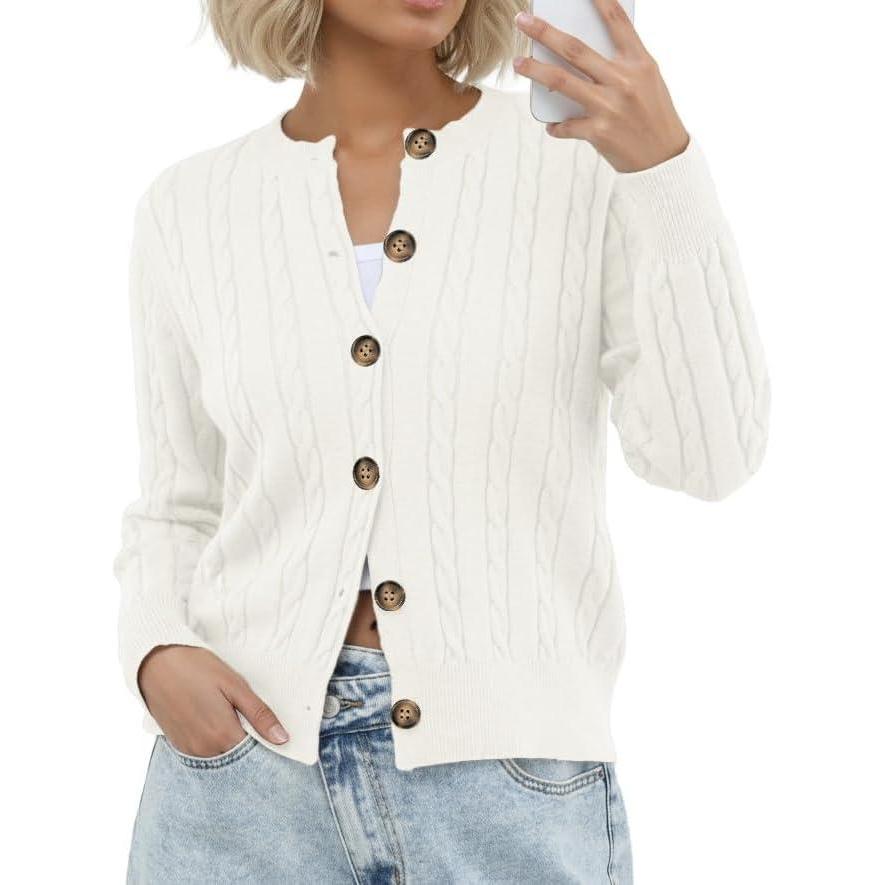 GRECERELLE Women’s Long Sleeve Cable Knit Button Down Crew Neck Casual Cardigan Sweater, S-2XL(White)