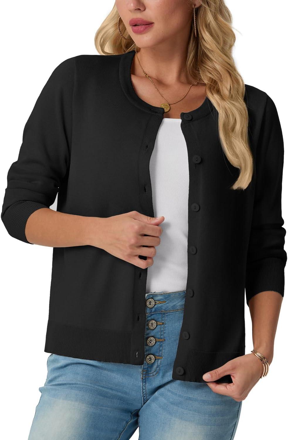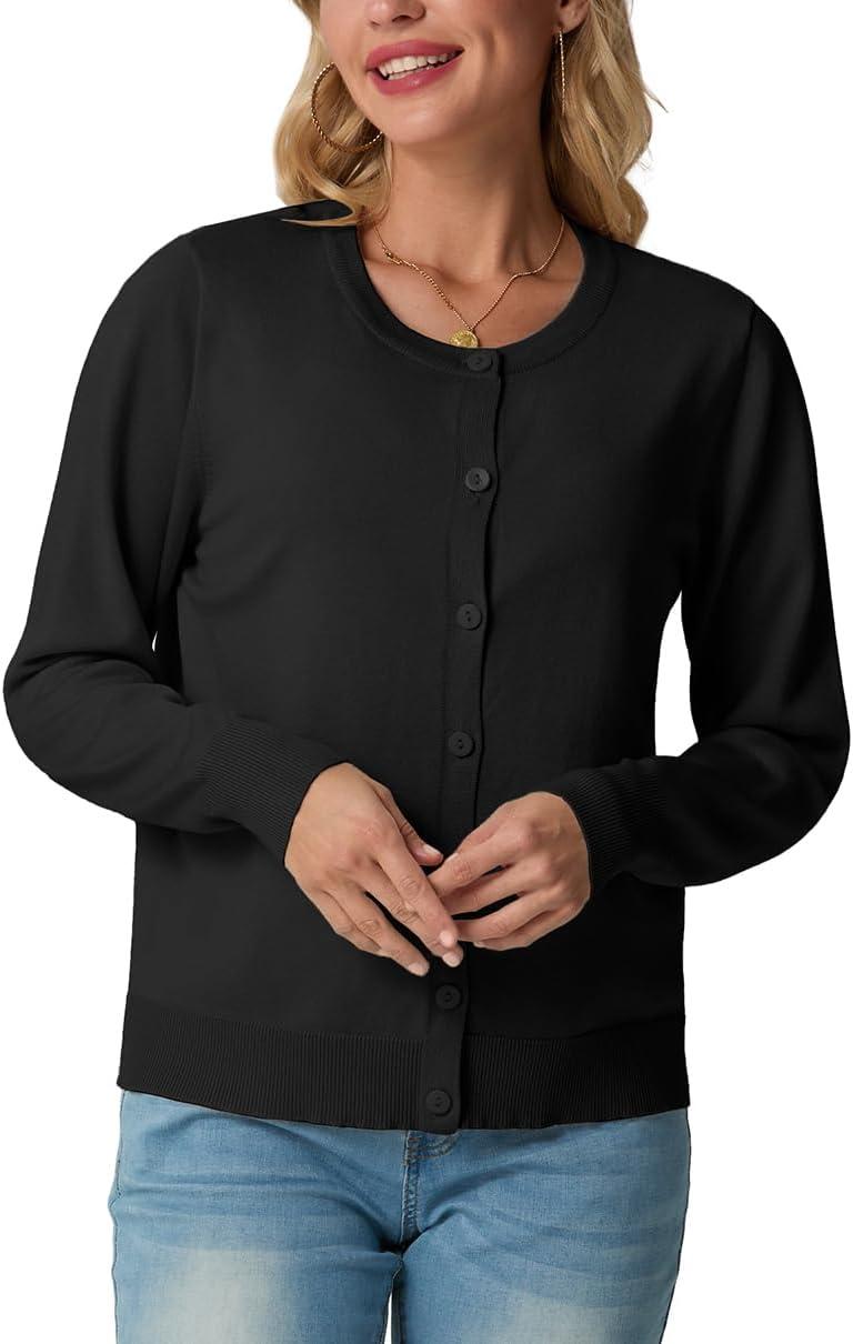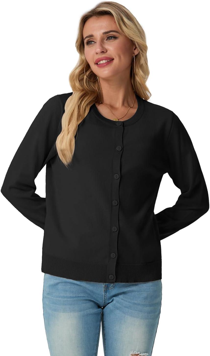 GRECERELLE Women’s Long Sleeve Lightweight Crewneck Casual Cardigan Sweater, S-2XL(A-black)