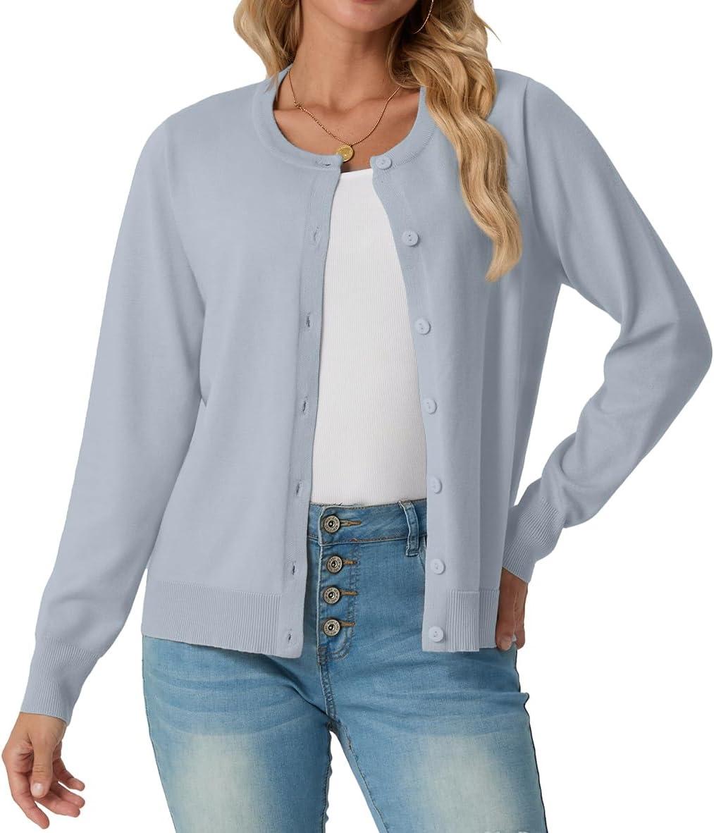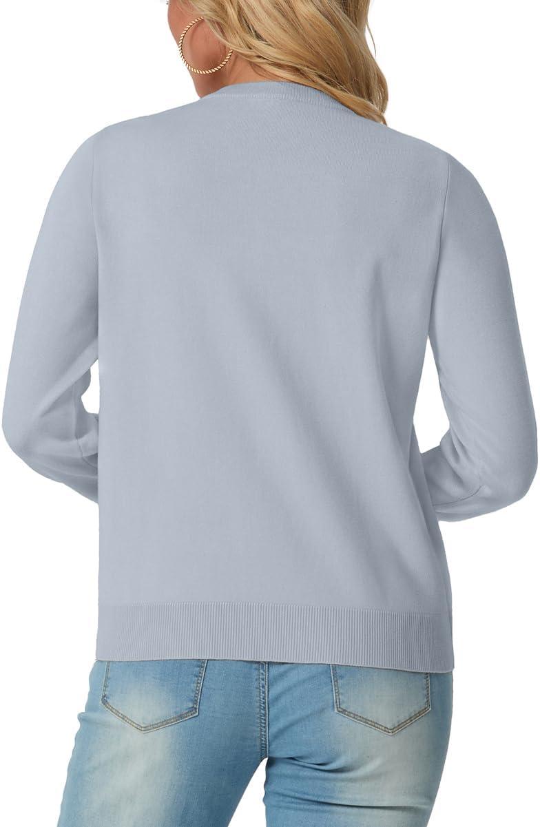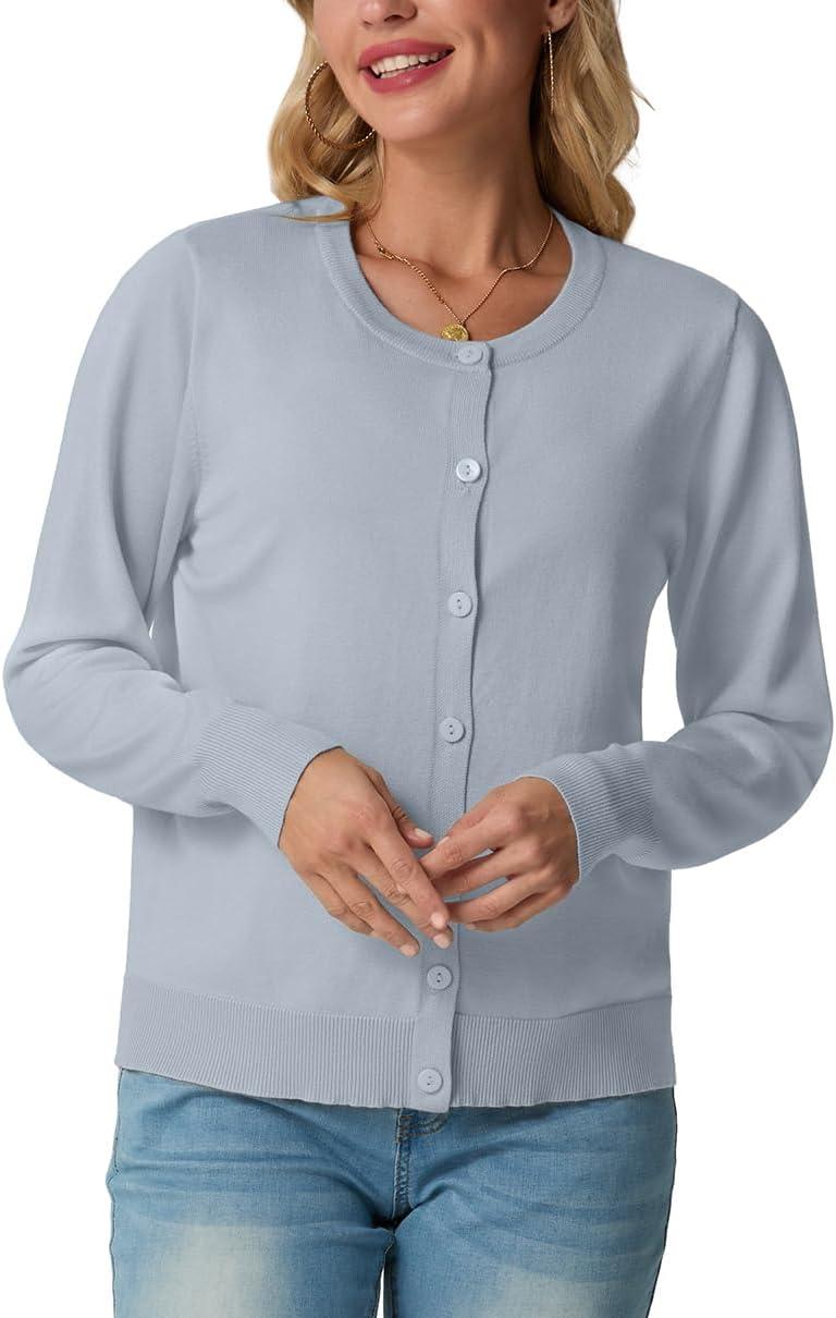 GRECERELLE Women’s Long Sleeve Lightweight Crewneck Casual Cardigan Sweater, S-2XL(Grey Blue)