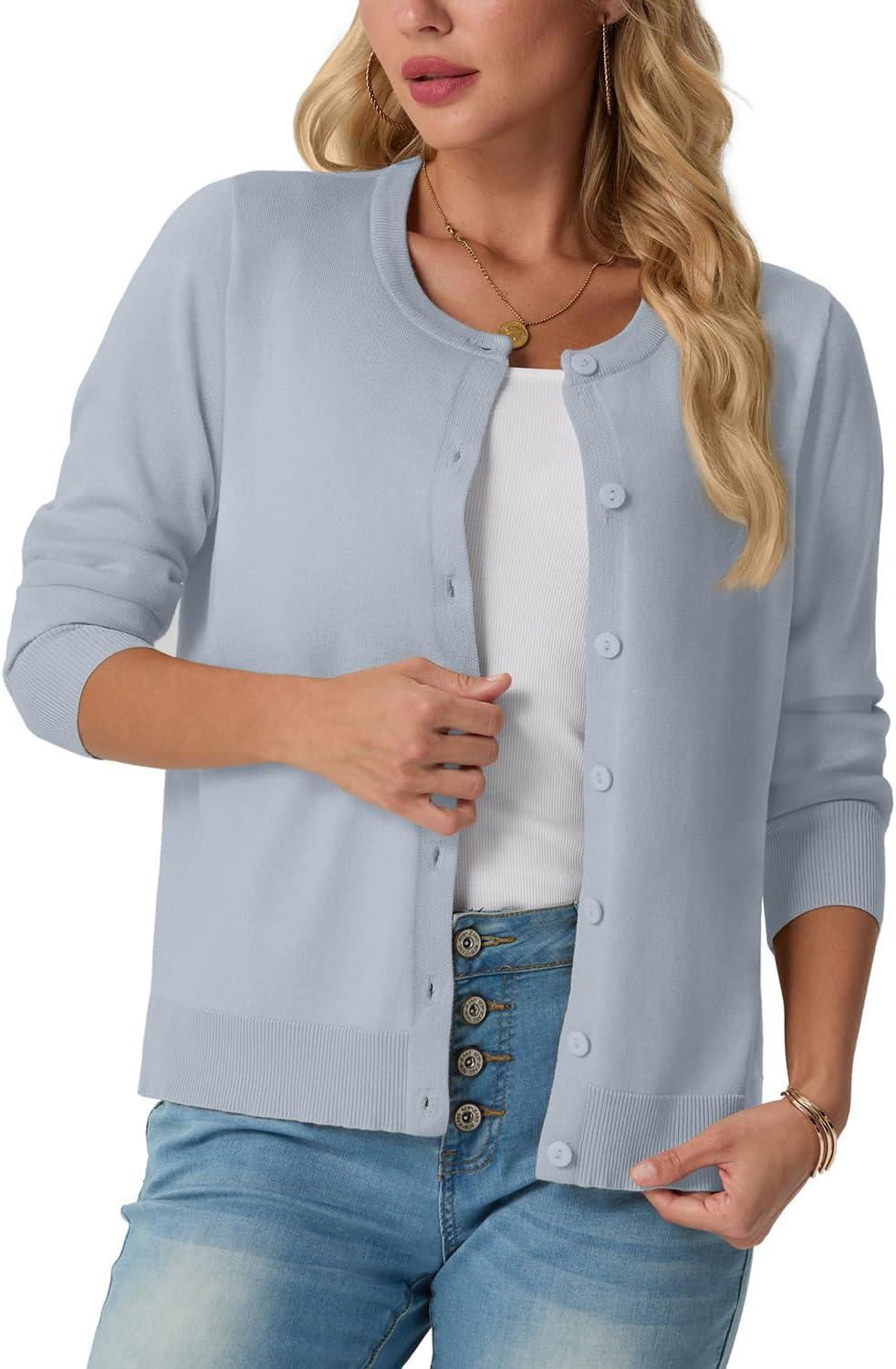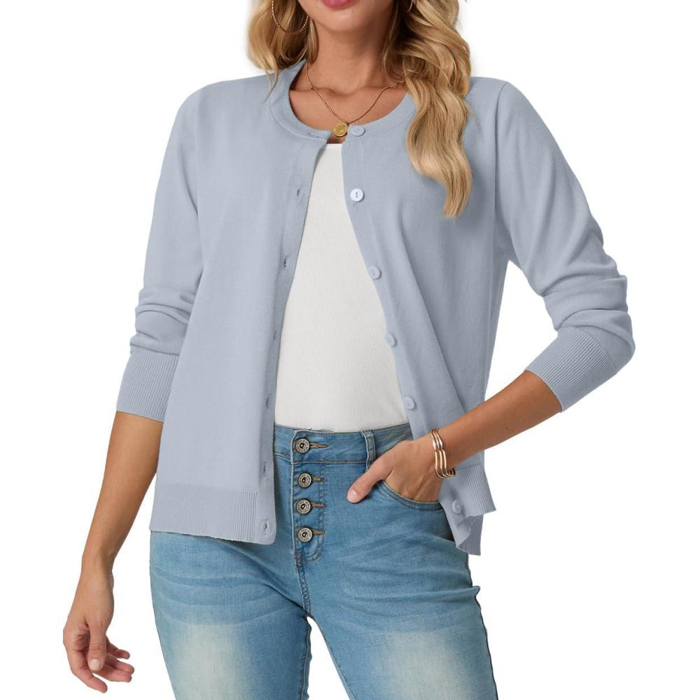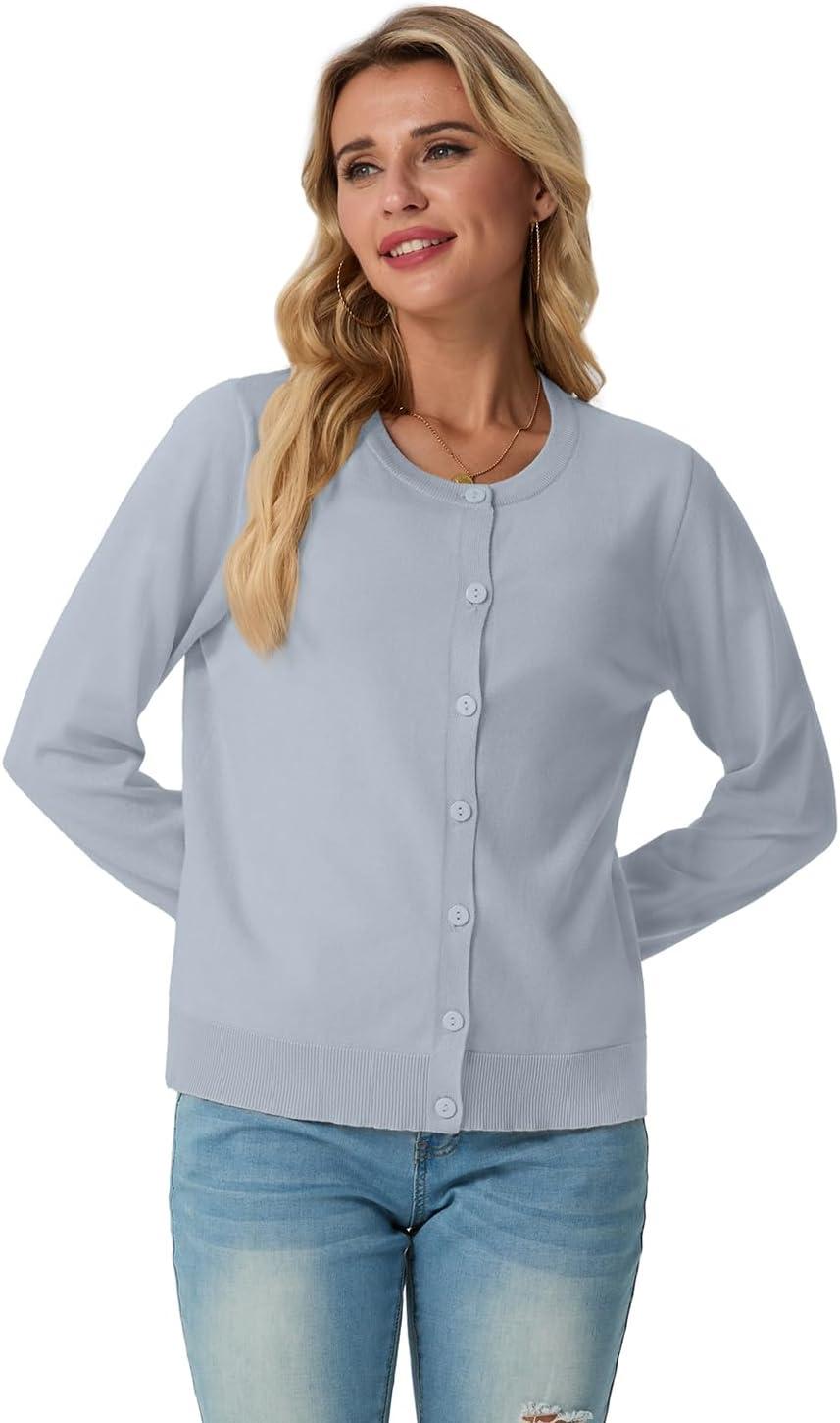 GRECERELLE Women’s Long Sleeve Lightweight Crewneck Casual Cardigan Sweater, S-2XL(Grey Blue)