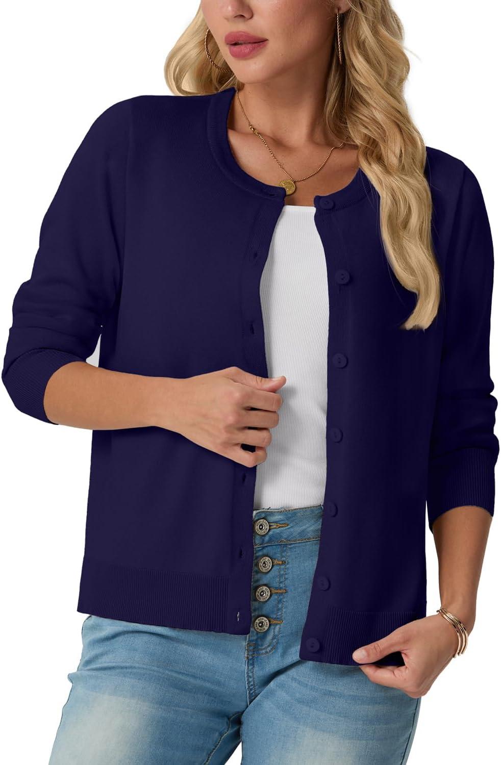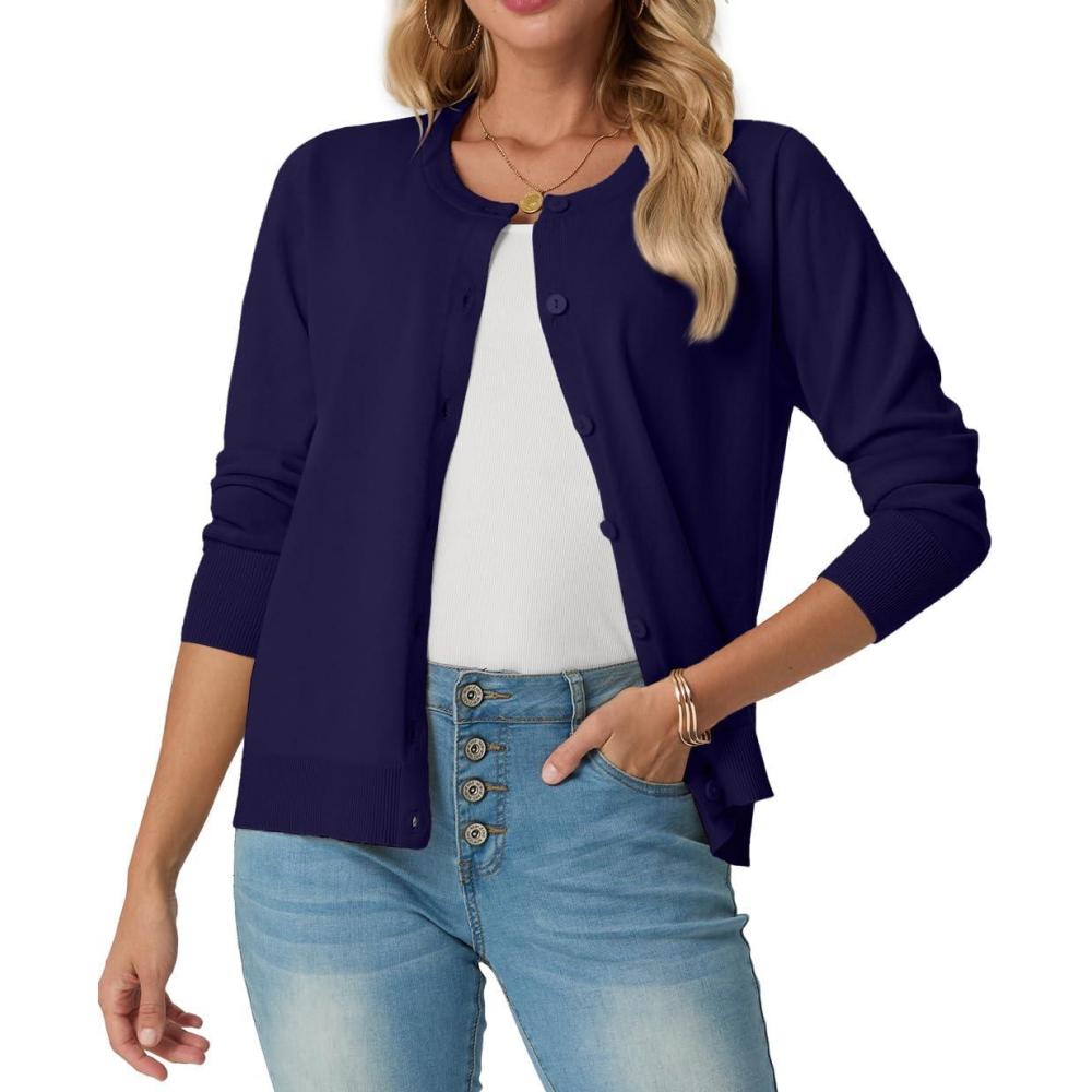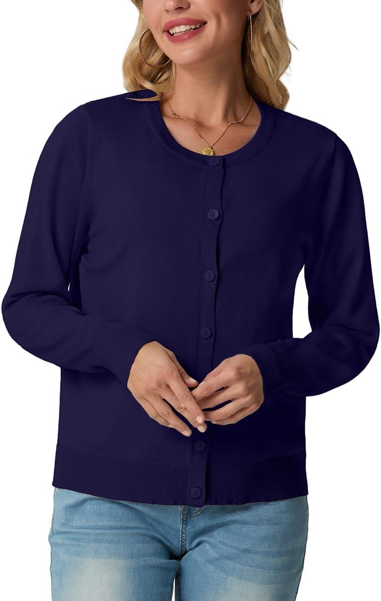 GRECERELLE Women’s Long Sleeve Lightweight Crewneck Casual Cardigan Sweater, S-2XL(Navy Blue)