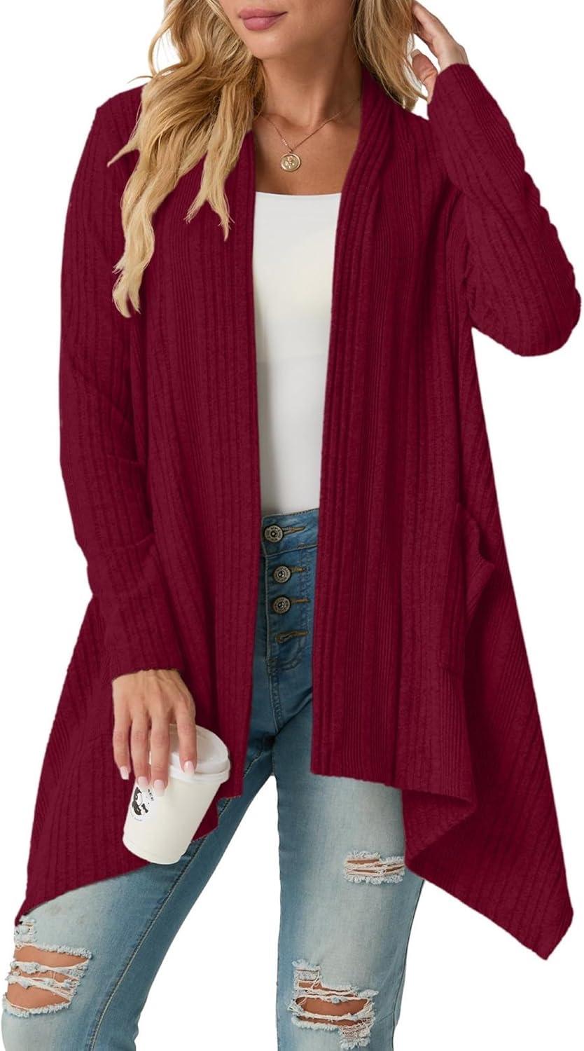 GRECERELLE Women’s Long Sleeve Lightweight Draped Open Front Casual Cardigan Sweater with Pockets (S-2XL)(Burgundy)