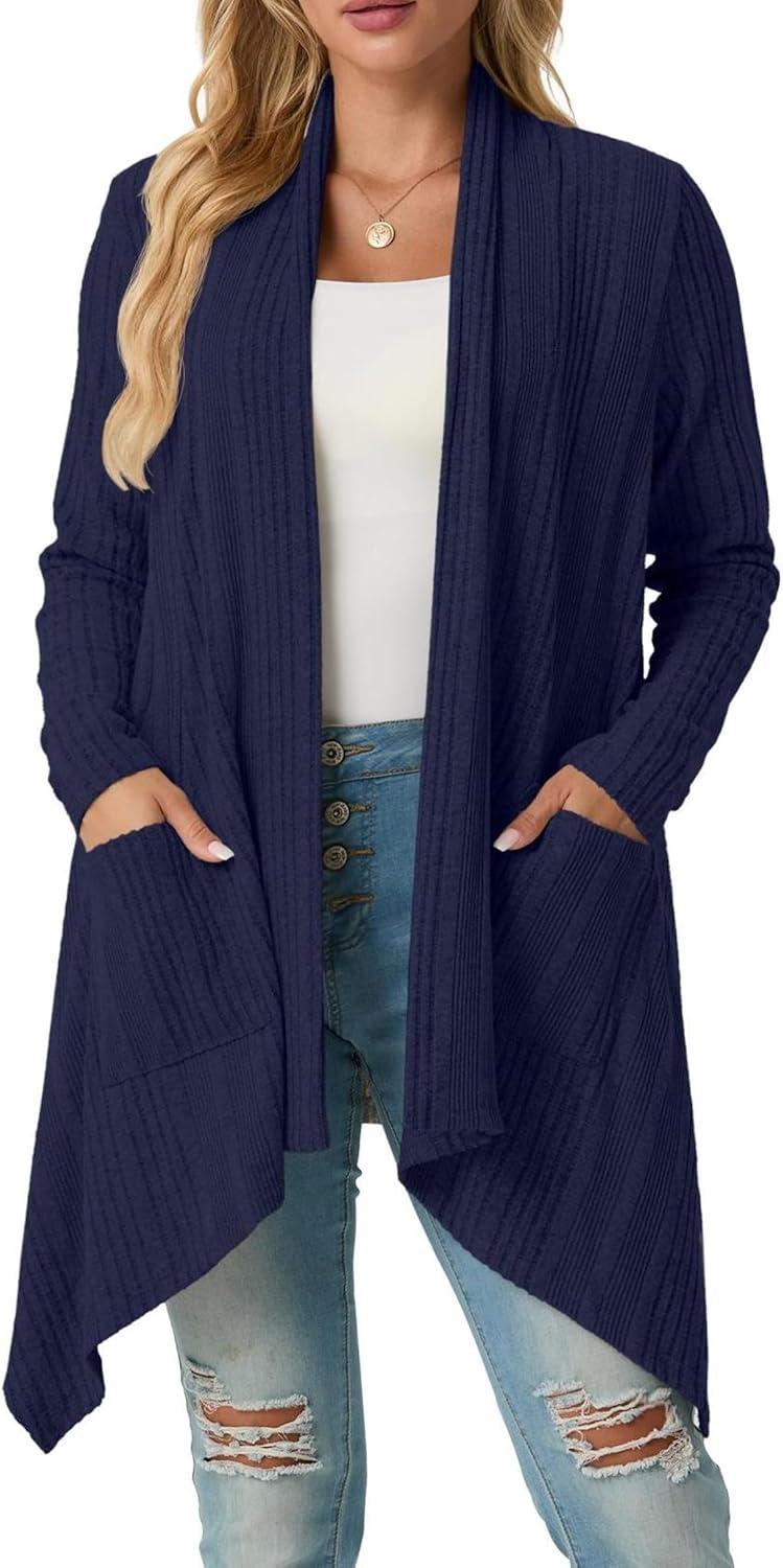 GRECERELLE Women’s Long Sleeve Lightweight Draped Open Front Casual Cardigan Sweater with Pockets (S-2XL)(Navy Blue)