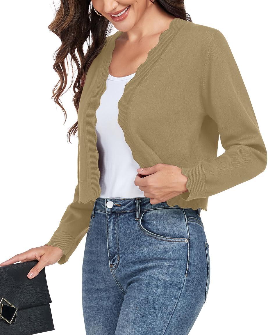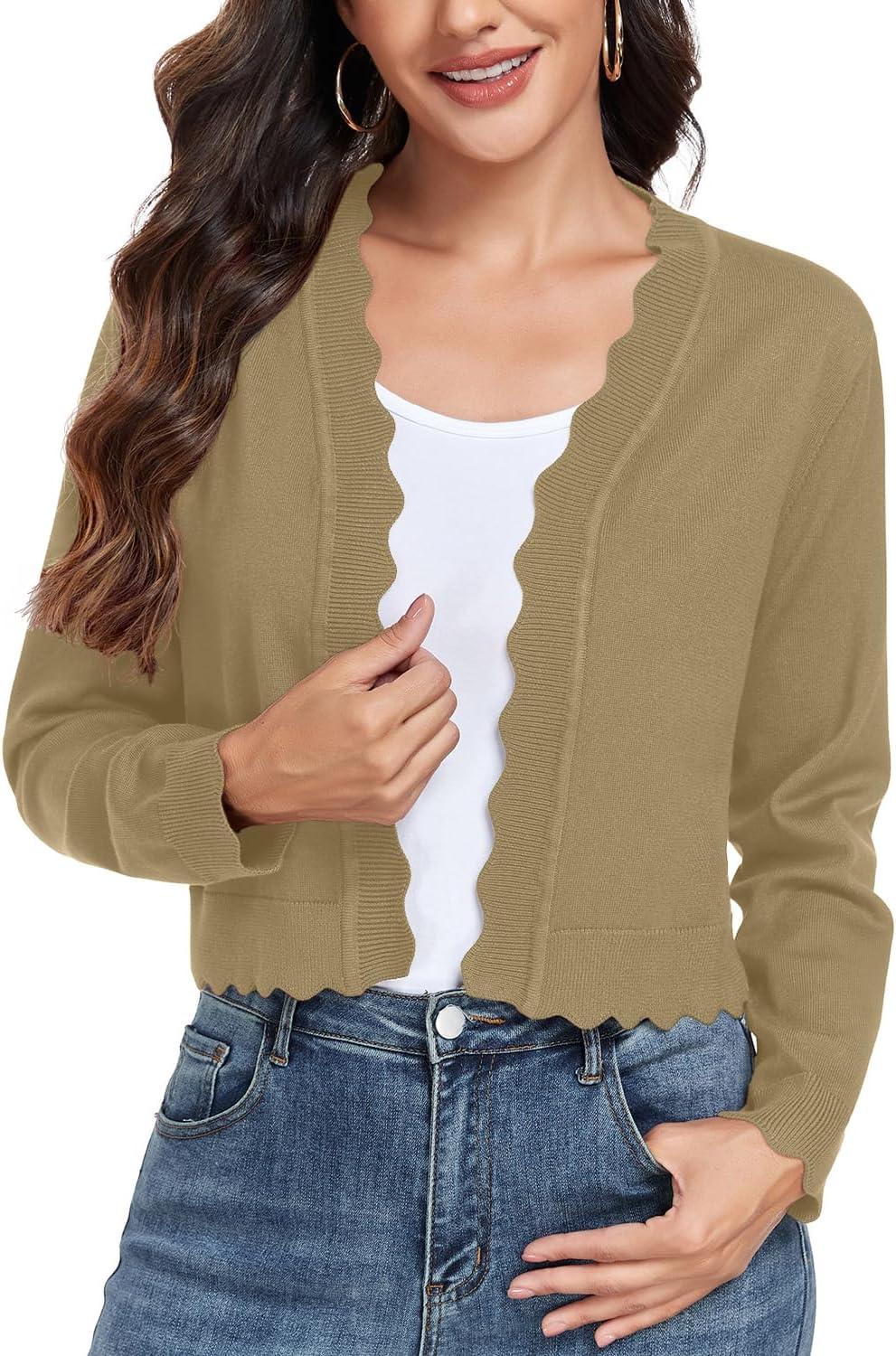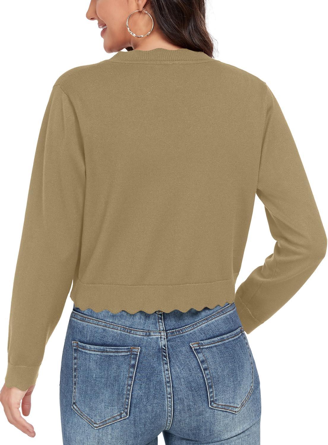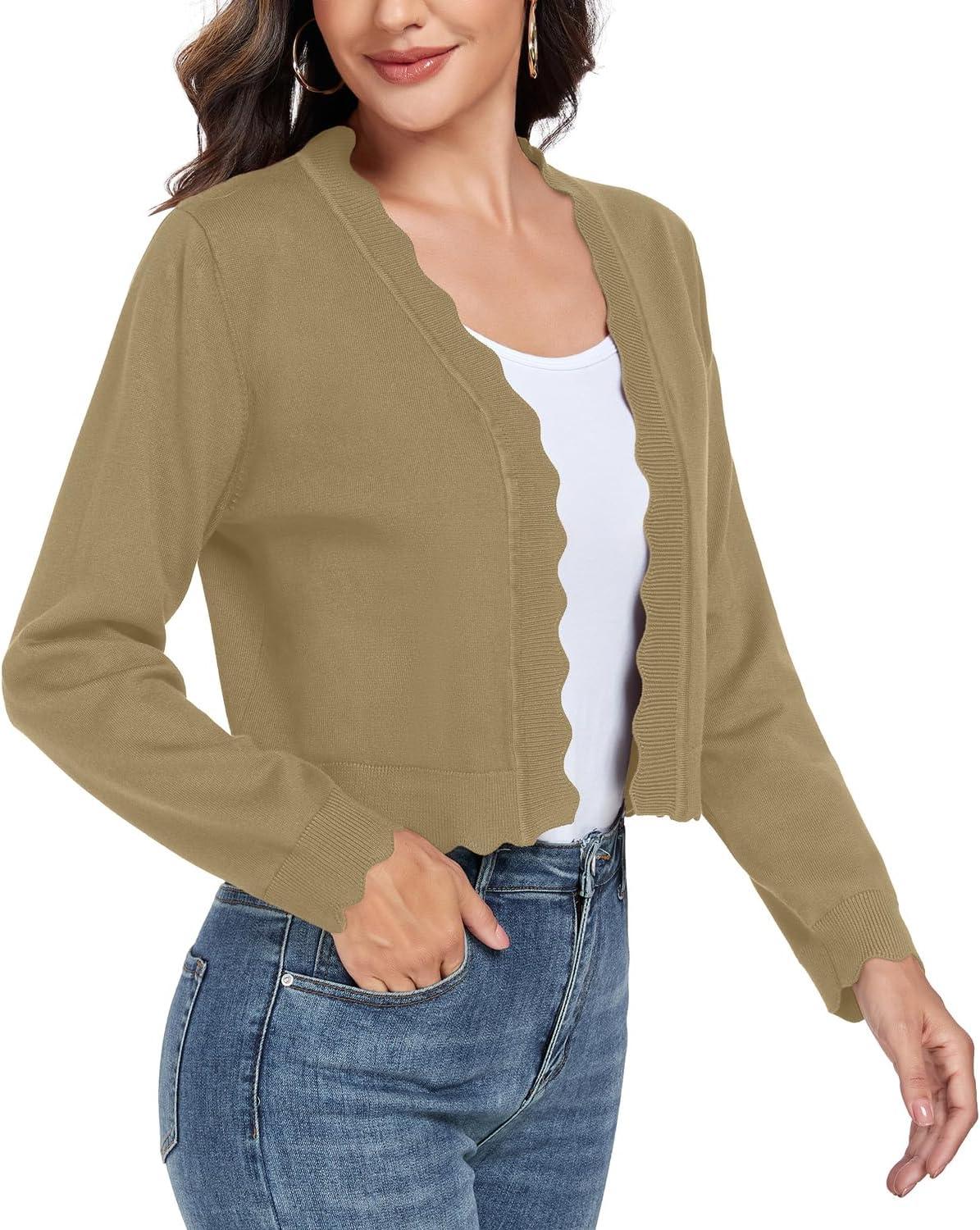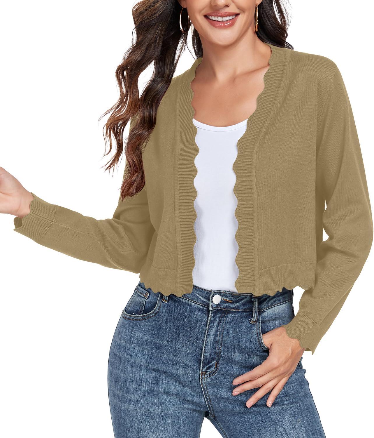 GRECERELLE Women’s Long Sleeve Lightweight Open Front Cropped Cardigan Knit Sweaters Bolero Shrugs (S-2XL)(Khaki)