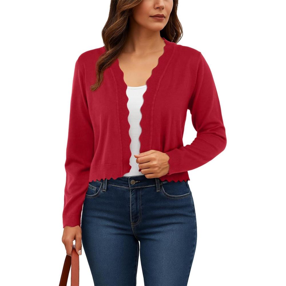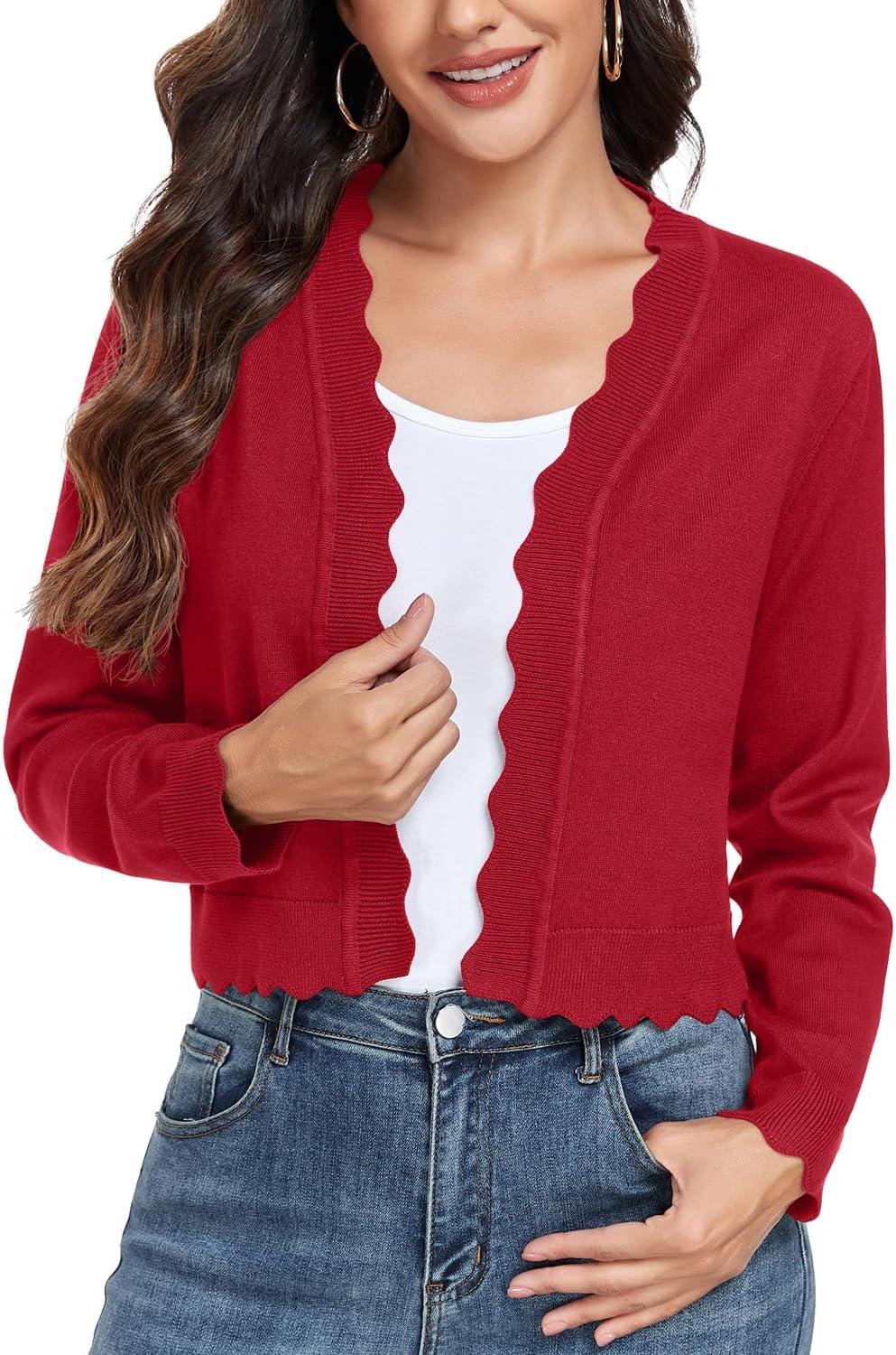 GRECERELLE Women’s Long Sleeve Lightweight Open Front Cropped Cardigan Knit Sweaters Bolero Shrugs (S-2XL)(Red)