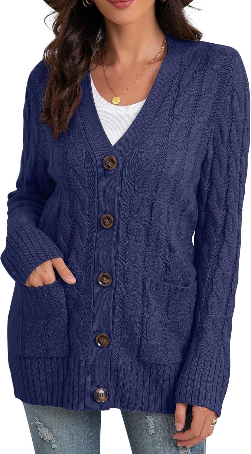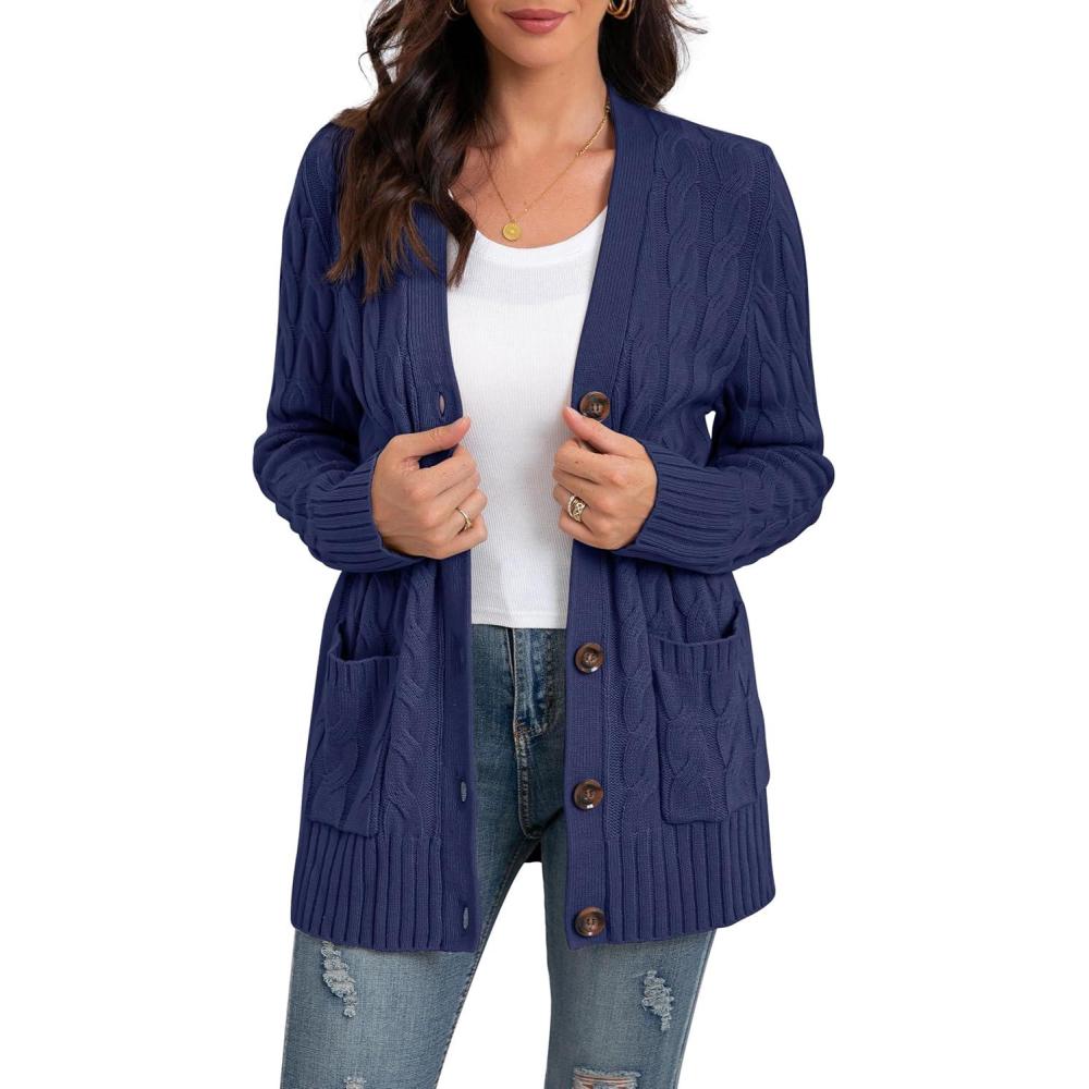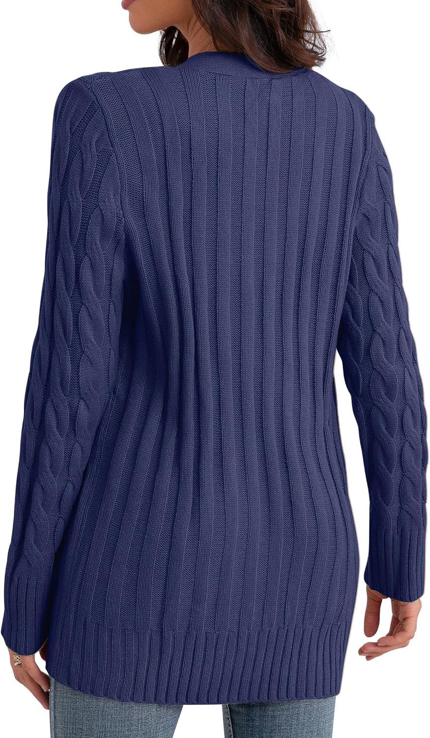 GRECERELLE Women's Long Sleeve Loose Knit Cable Open Front Button Down Cardigan Sweater Outerwear Coat with Pockets(05-navy Blue)