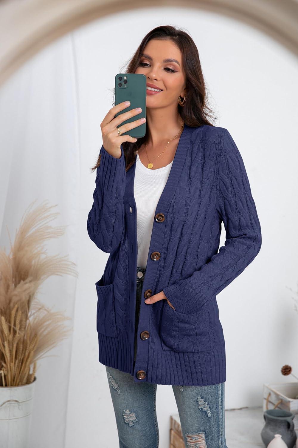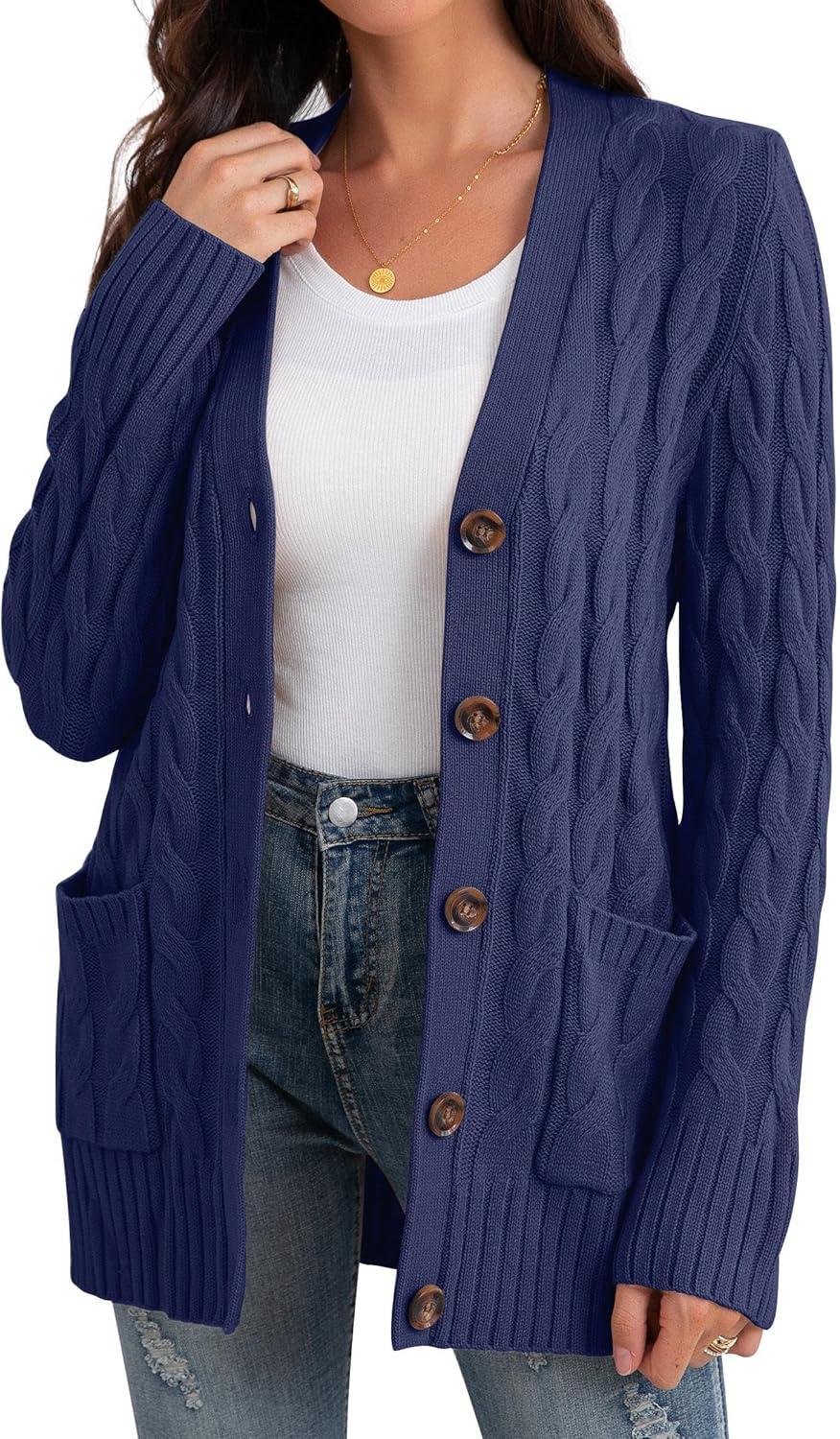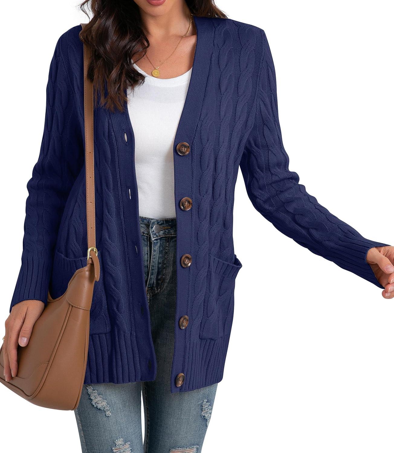 GRECERELLE Women's Long Sleeve Loose Knit Cable Open Front Button Down Cardigan Sweater Outerwear Coat with Pockets(05-navy Blue)