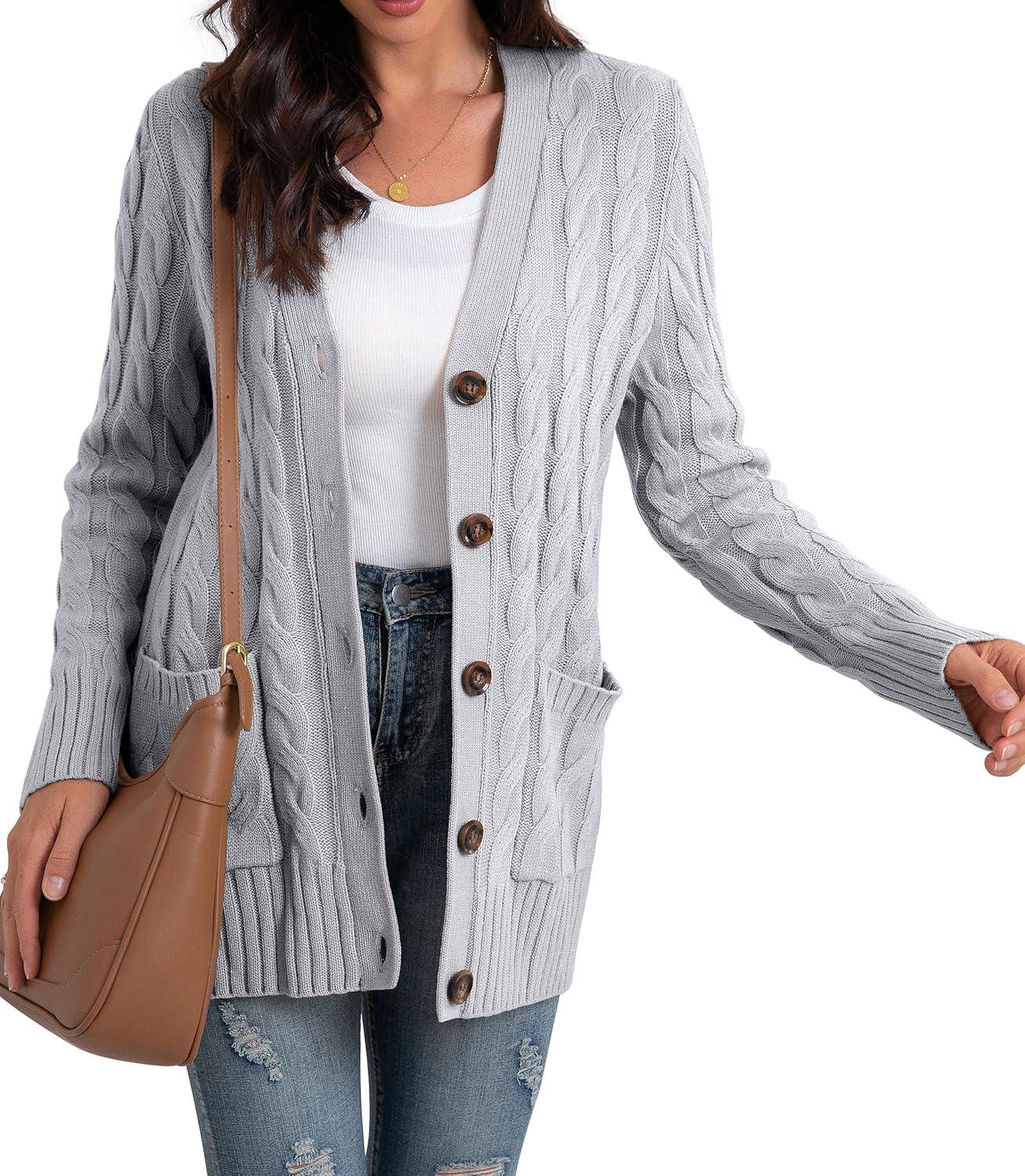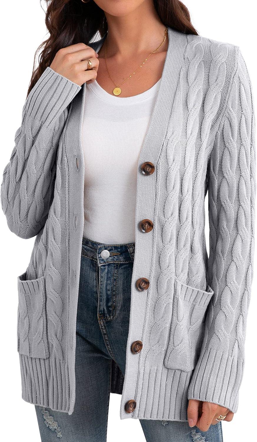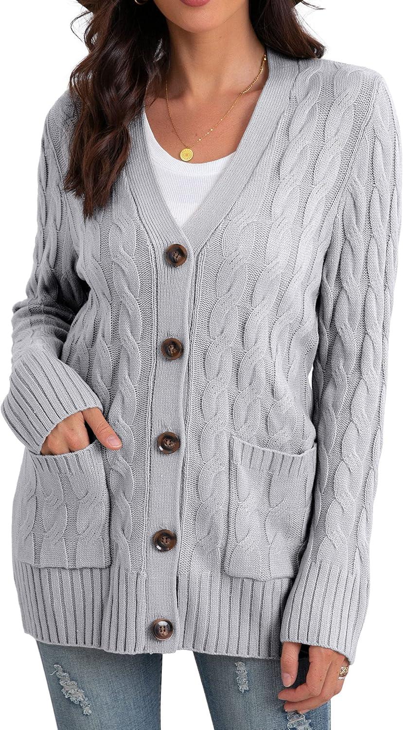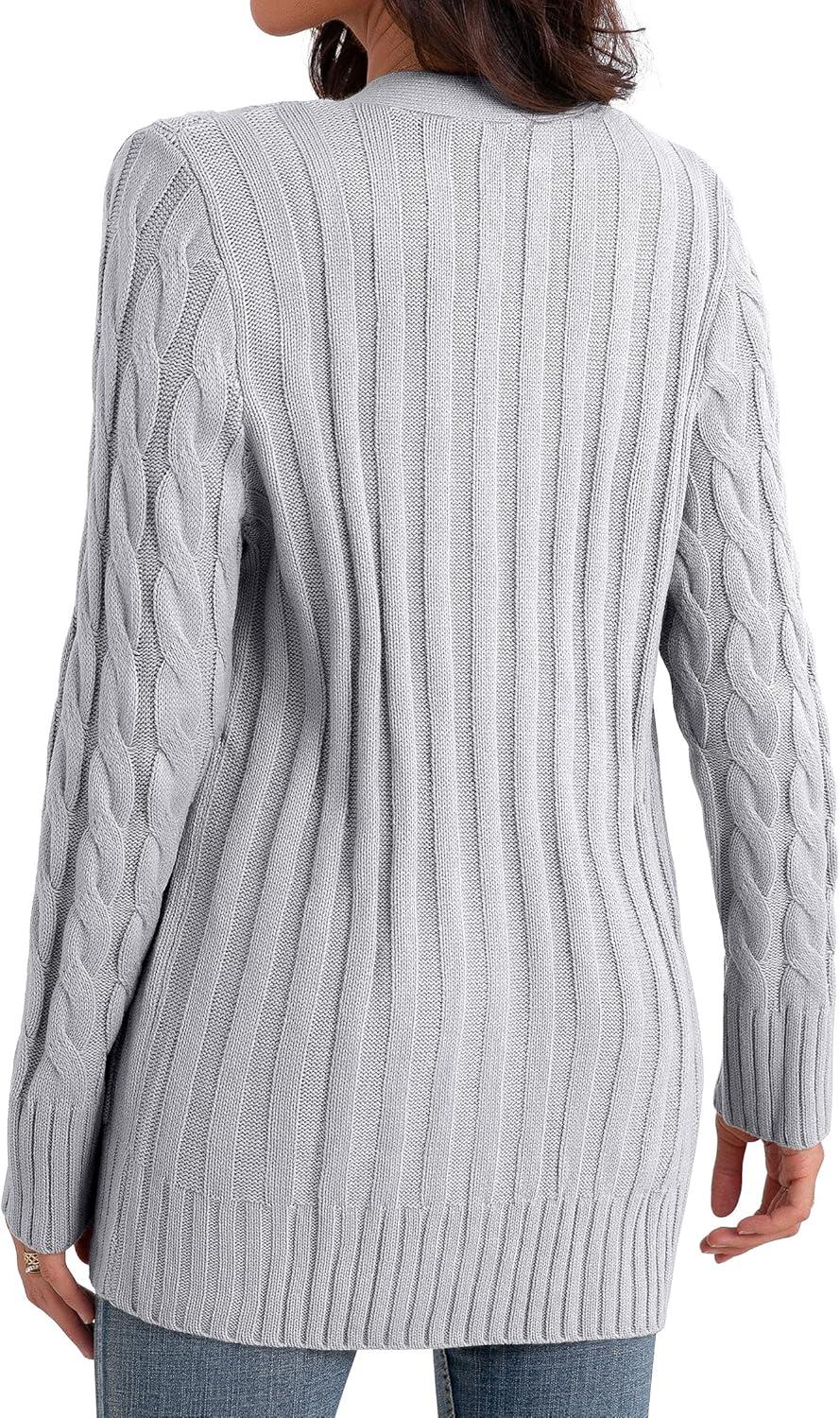 GRECERELLE Women's Long Sleeve Loose Knit Cable Open Front Button Down Cardigan Sweater Outerwear Coat with Pockets(11-gray)