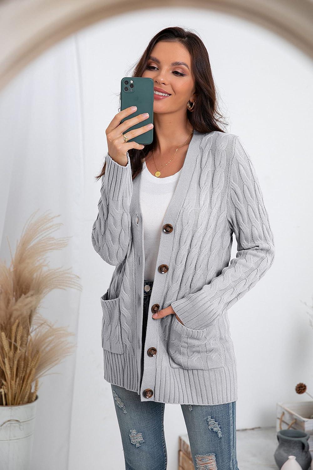 GRECERELLE Women’s Long Sleeve Loose Knit Cable Open Front Button Down Cardigan Sweater Outerwear Coat with Pockets(11-gray)