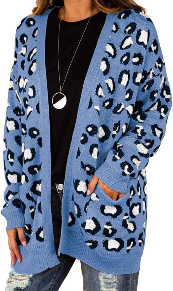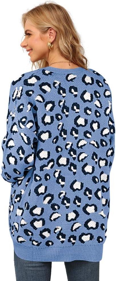 GRECERELLE Women’s Long Sleeve Loose Knit Cable Open Front Button Down Cardigan Sweater Outerwear Coat with Pockets(B-06 Leopard Print Light Blue)