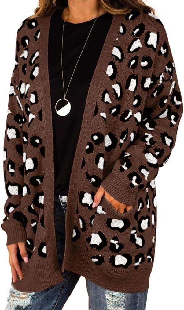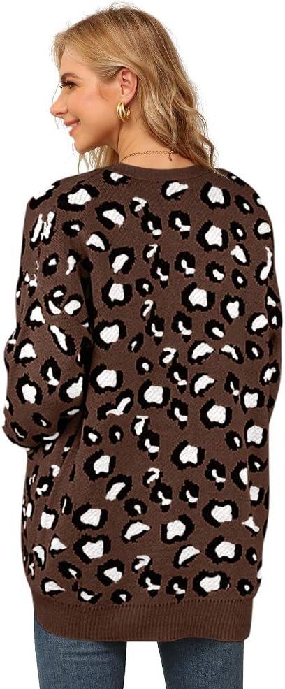 GRECERELLE Women's Long Sleeve Loose Knit Cable Open Front Button Down Cardigan Sweater Outerwear Coat with Pockets(B-07 Leopard Print Coffee)