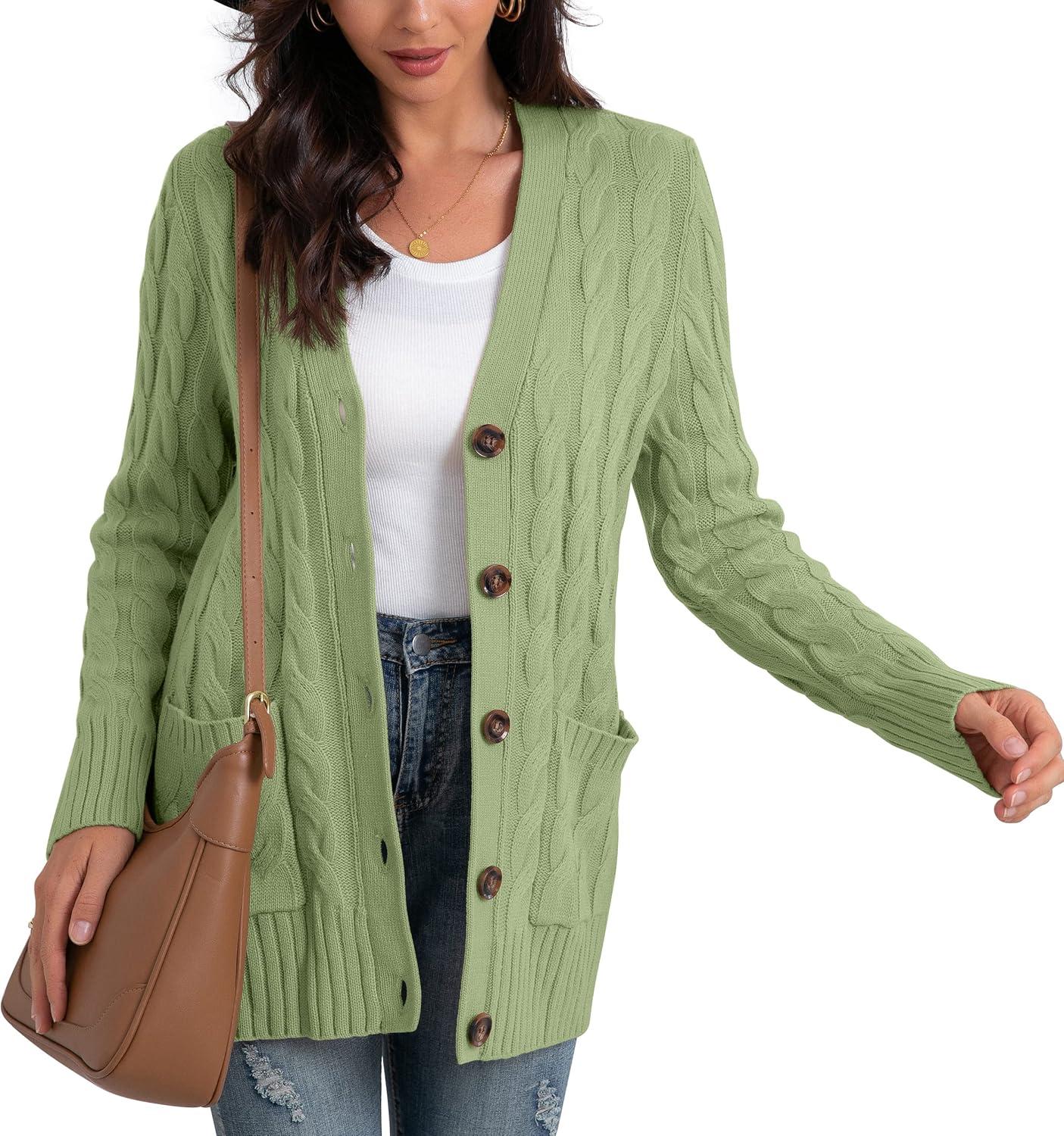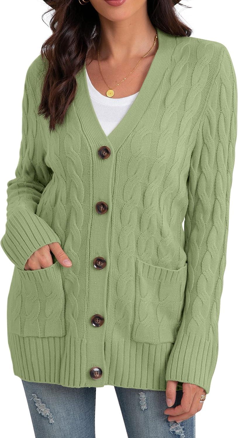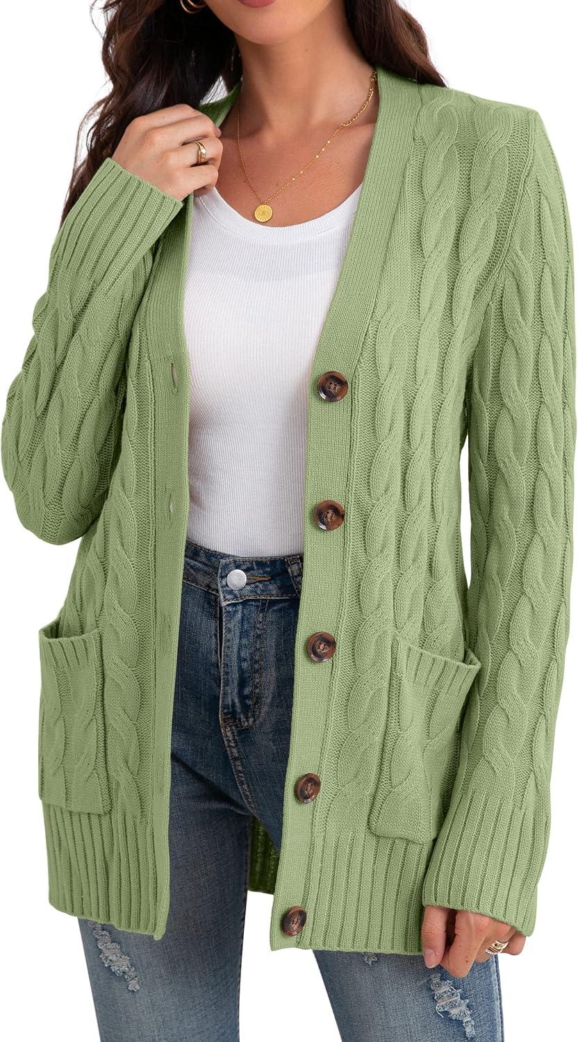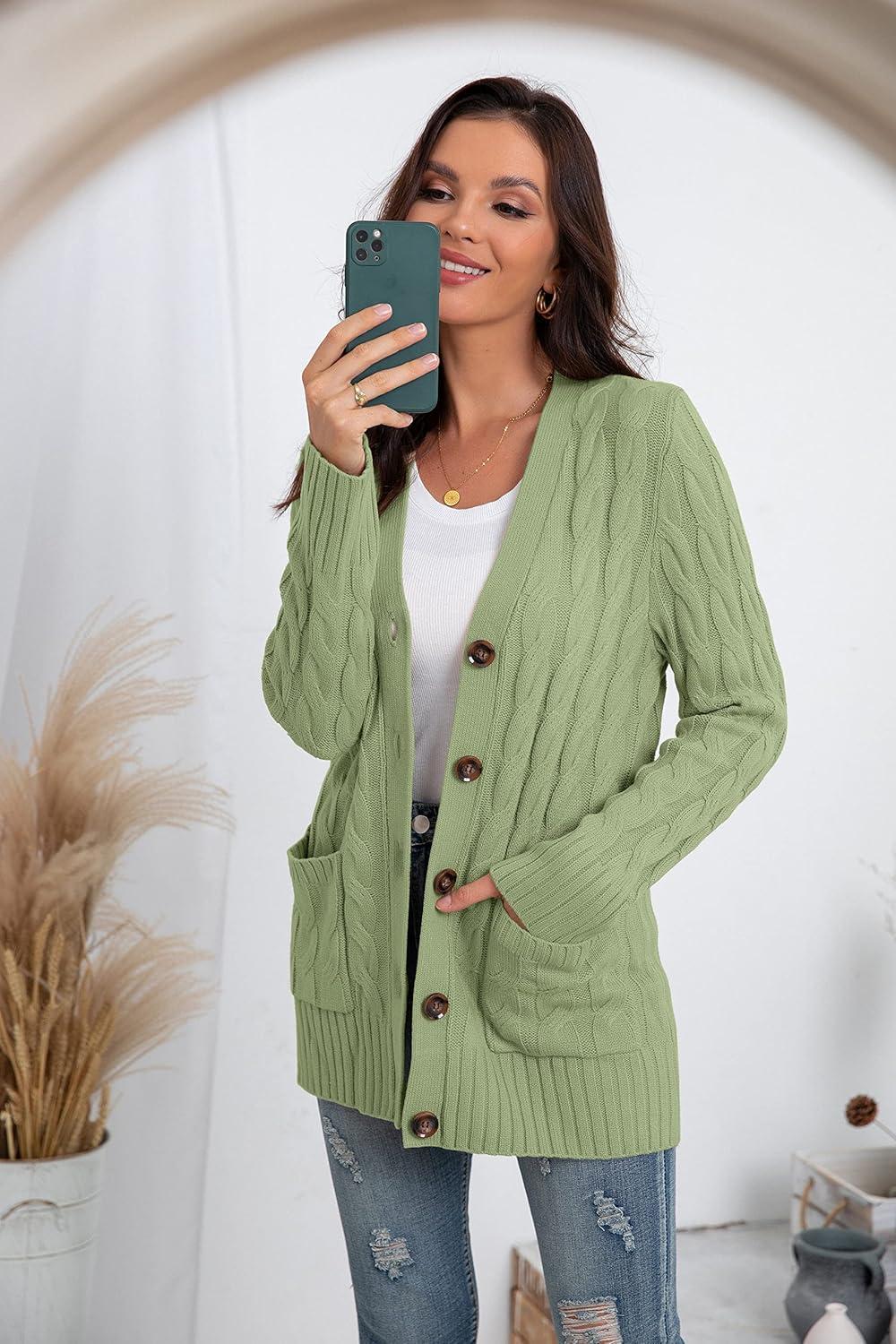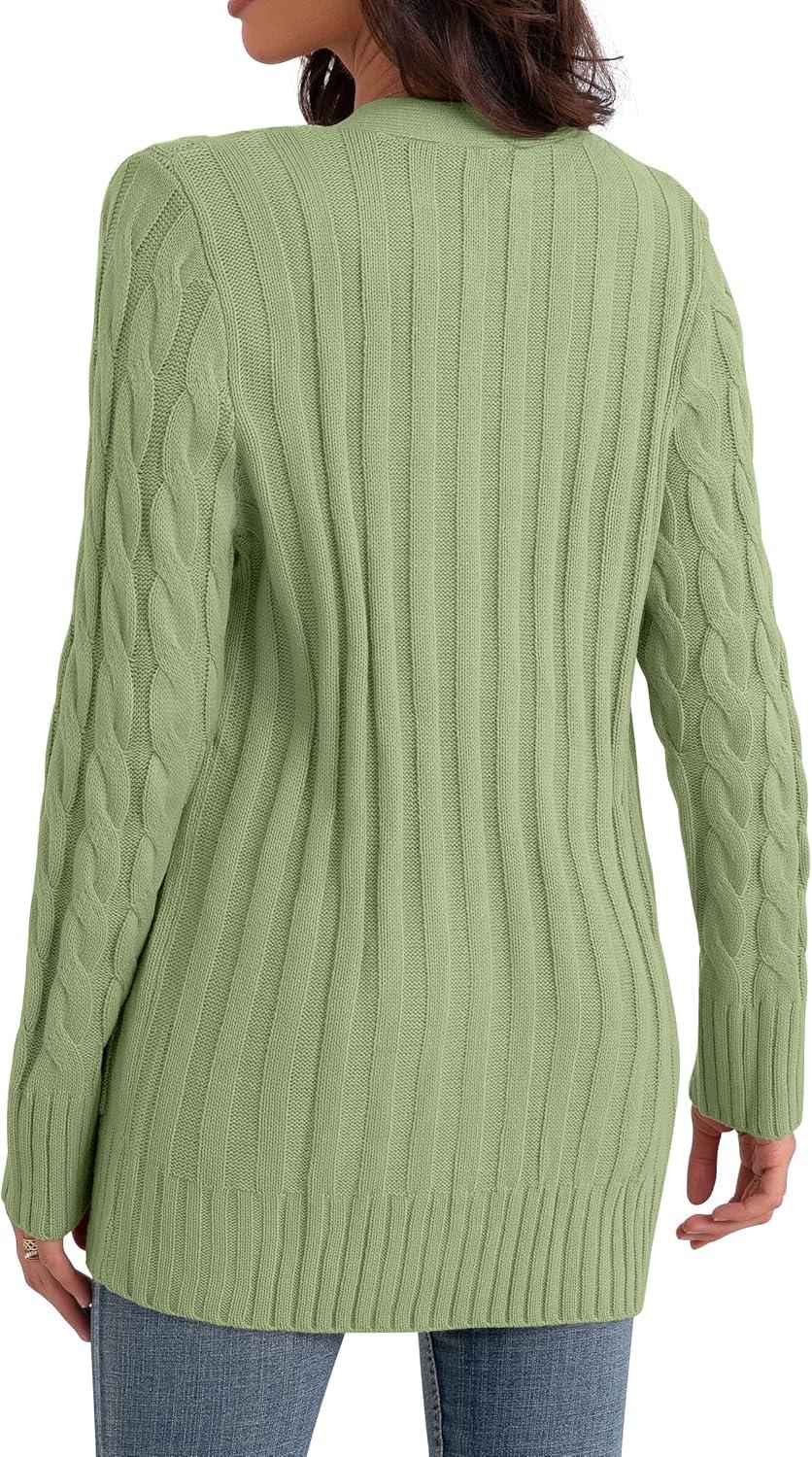 GRECERELLE Women’s Long Sleeve Loose Knit Cable Open Front Button Down Cardigan Sweater Outerwear Coat with Pockets(Light Green)