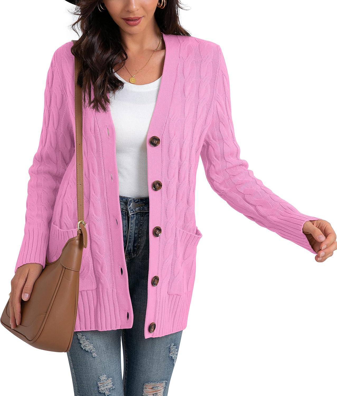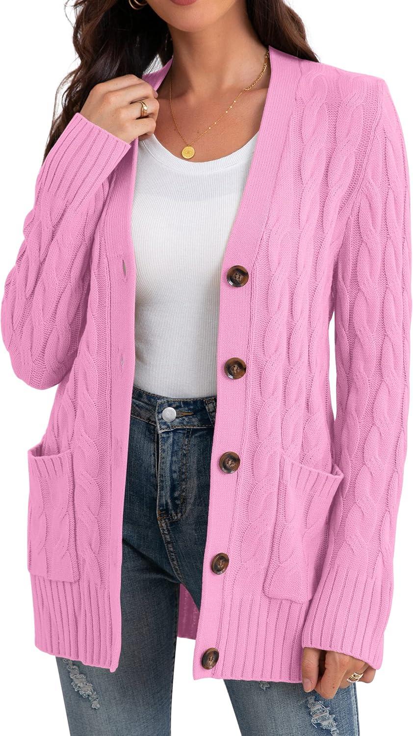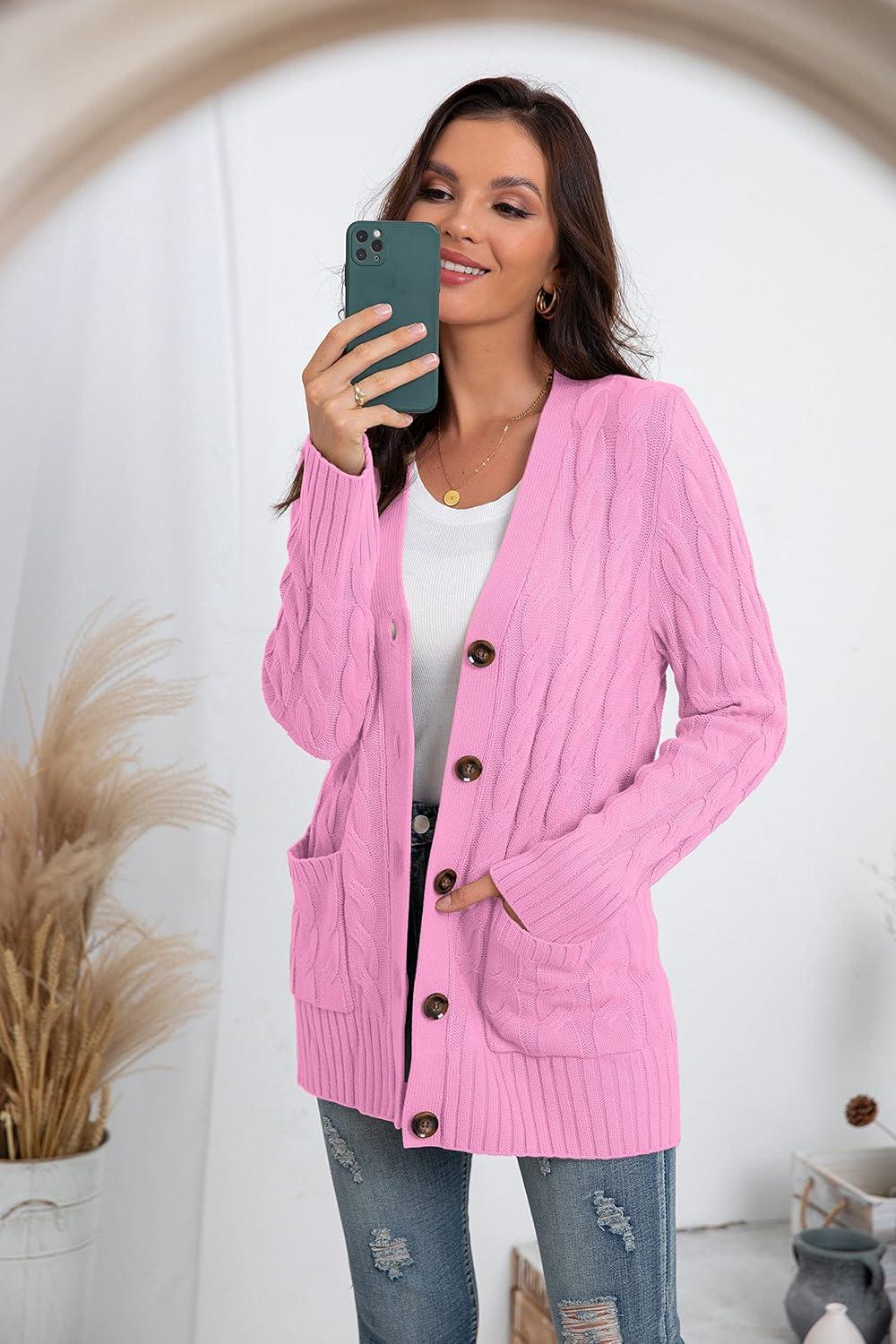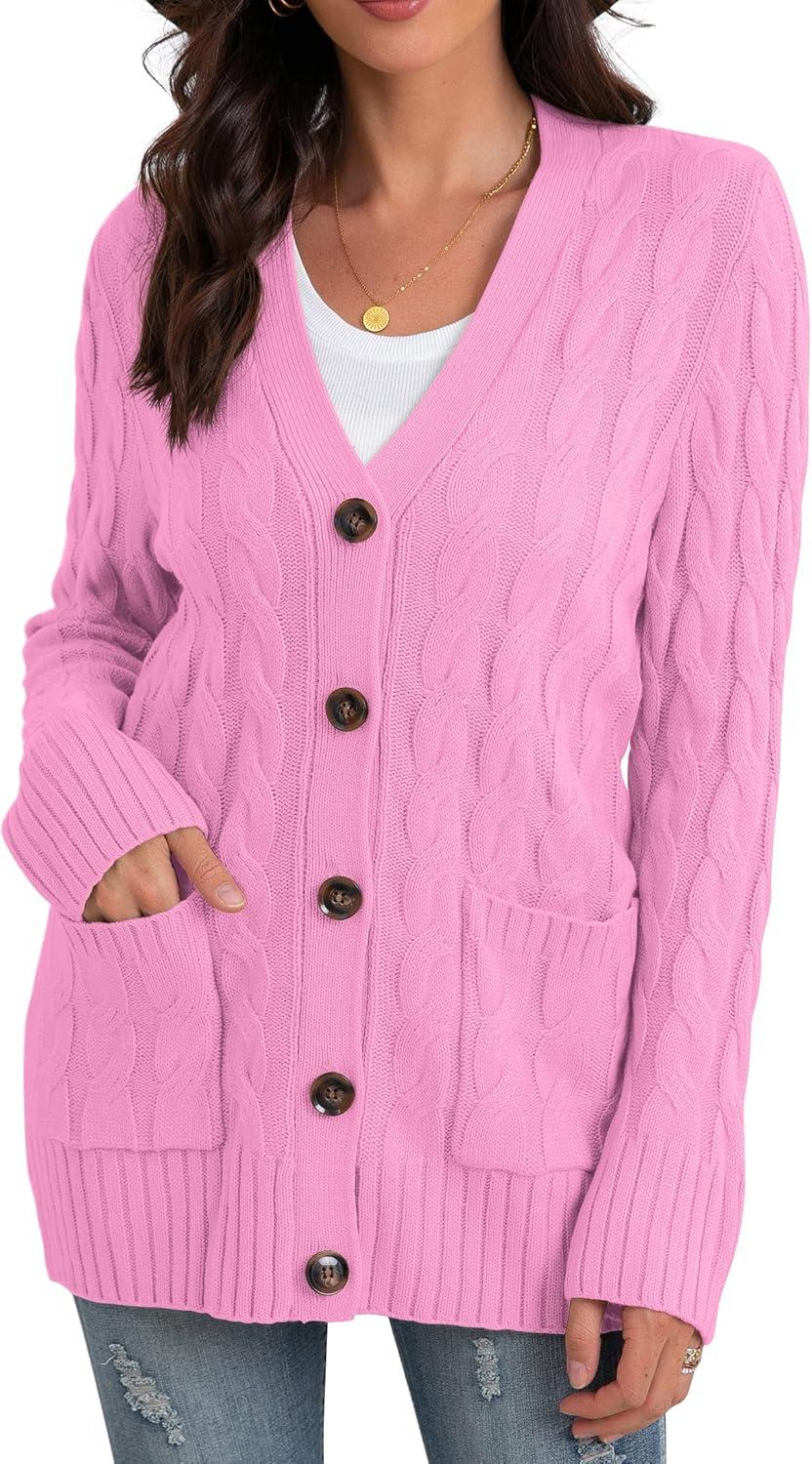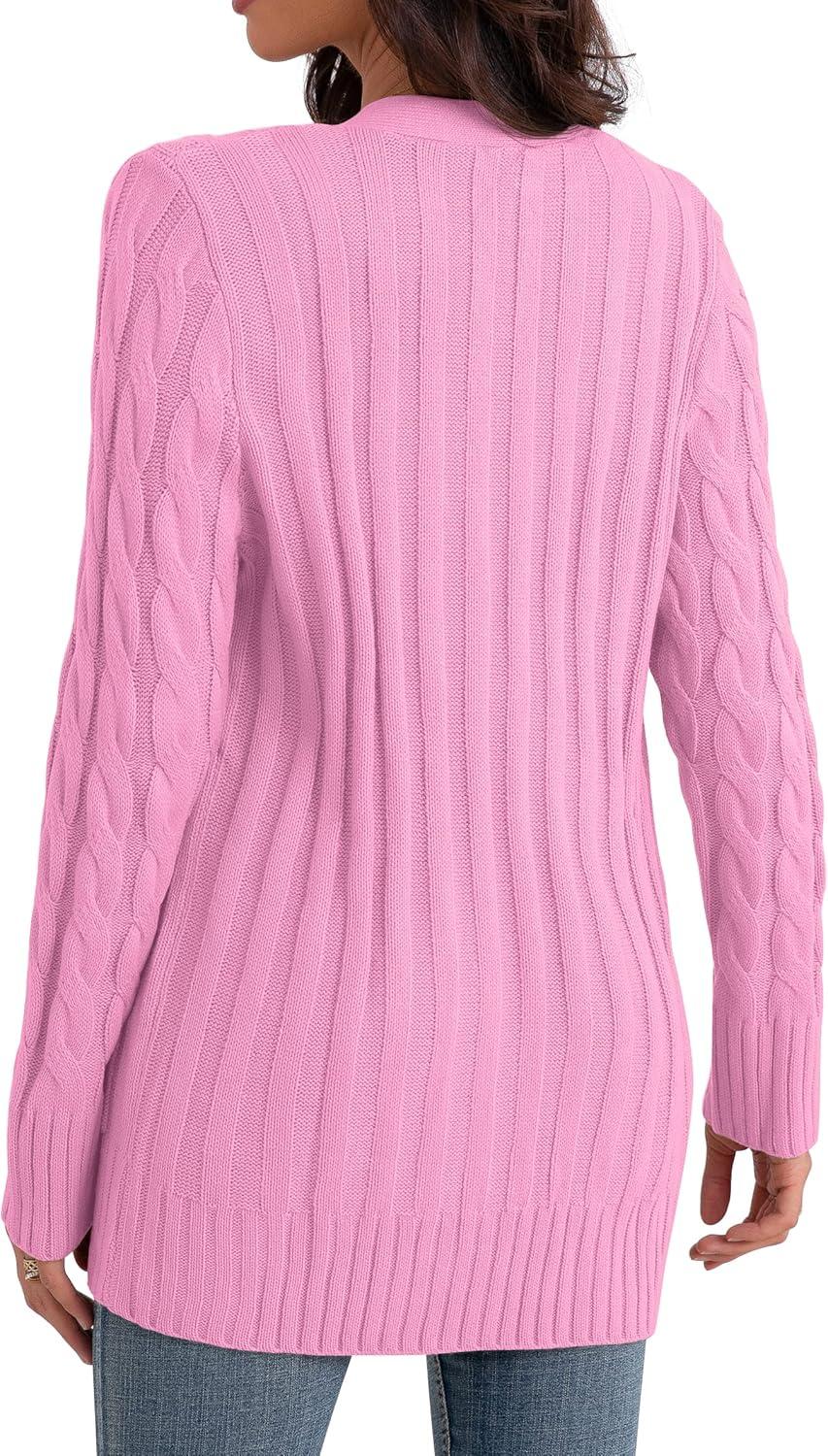 GRECERELLE Women's Long Sleeve Loose Knit Cable Open Front Button Down Cardigan Sweater Outerwear Coat with Pockets(Pink)