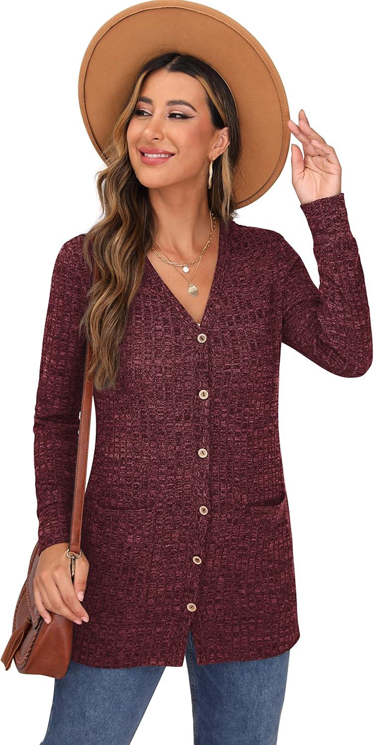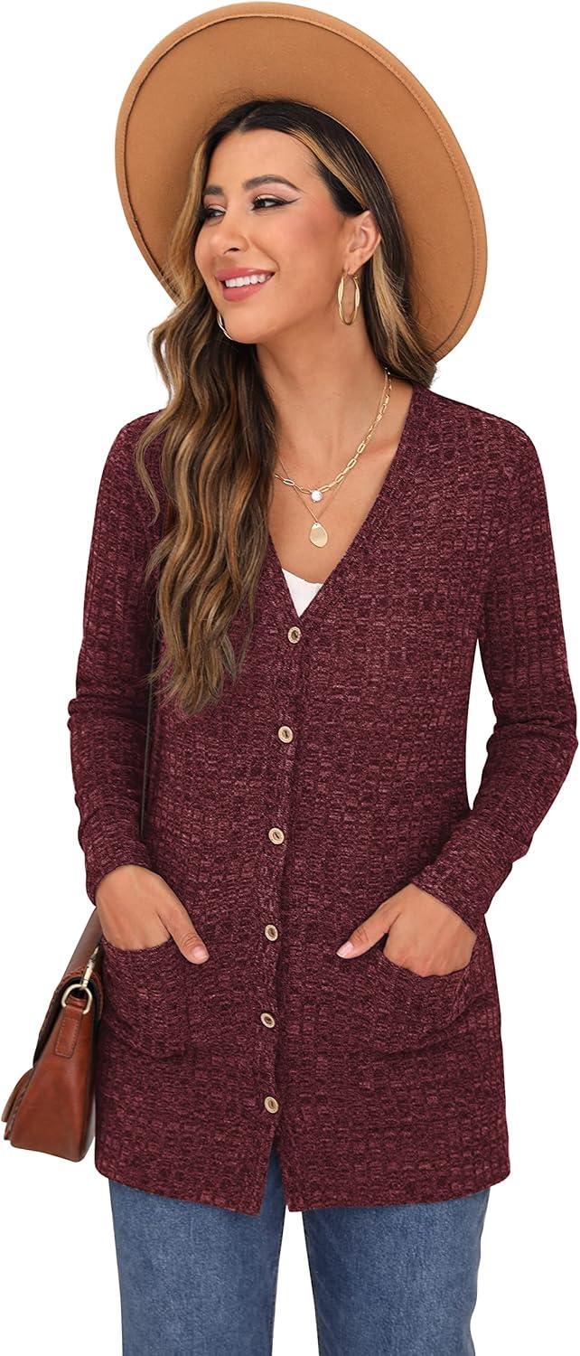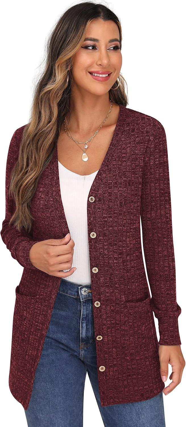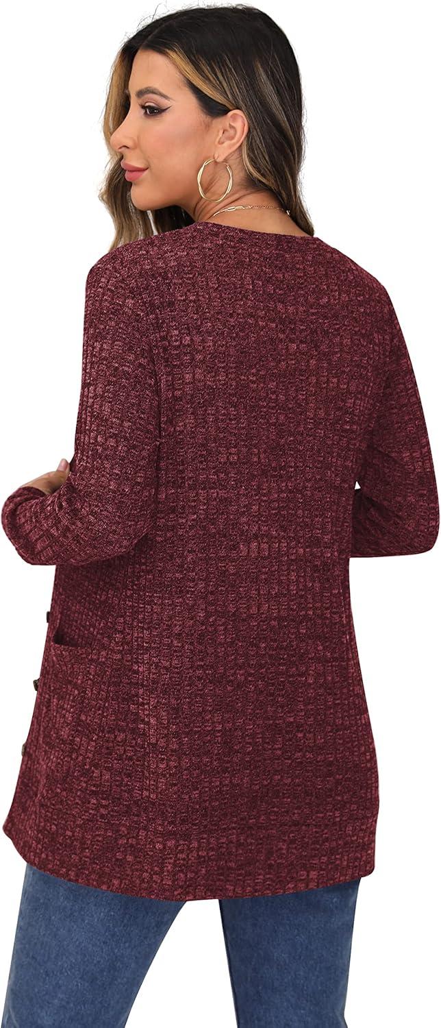 GRECERELLE Women’s Long Sleeve Open Front Cardigan Button Down Ribbed Lightweight Knit Outerwear with Pocket(03 Wine Red)