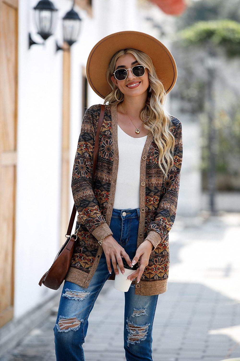 GRECERELLE Women’s Long Sleeve Open Front Cardigan Button Down Ribbed Lightweight Knit Outerwear with Pocket(A-round Flower Brown)