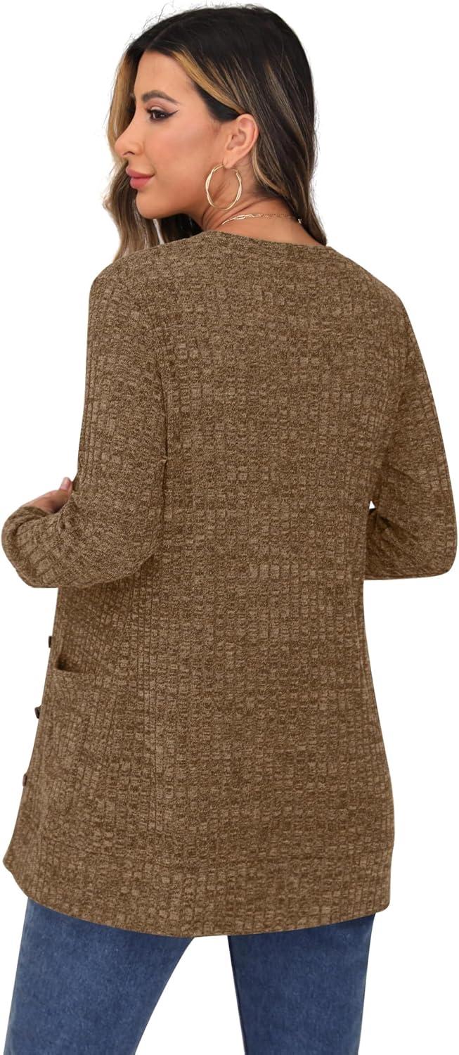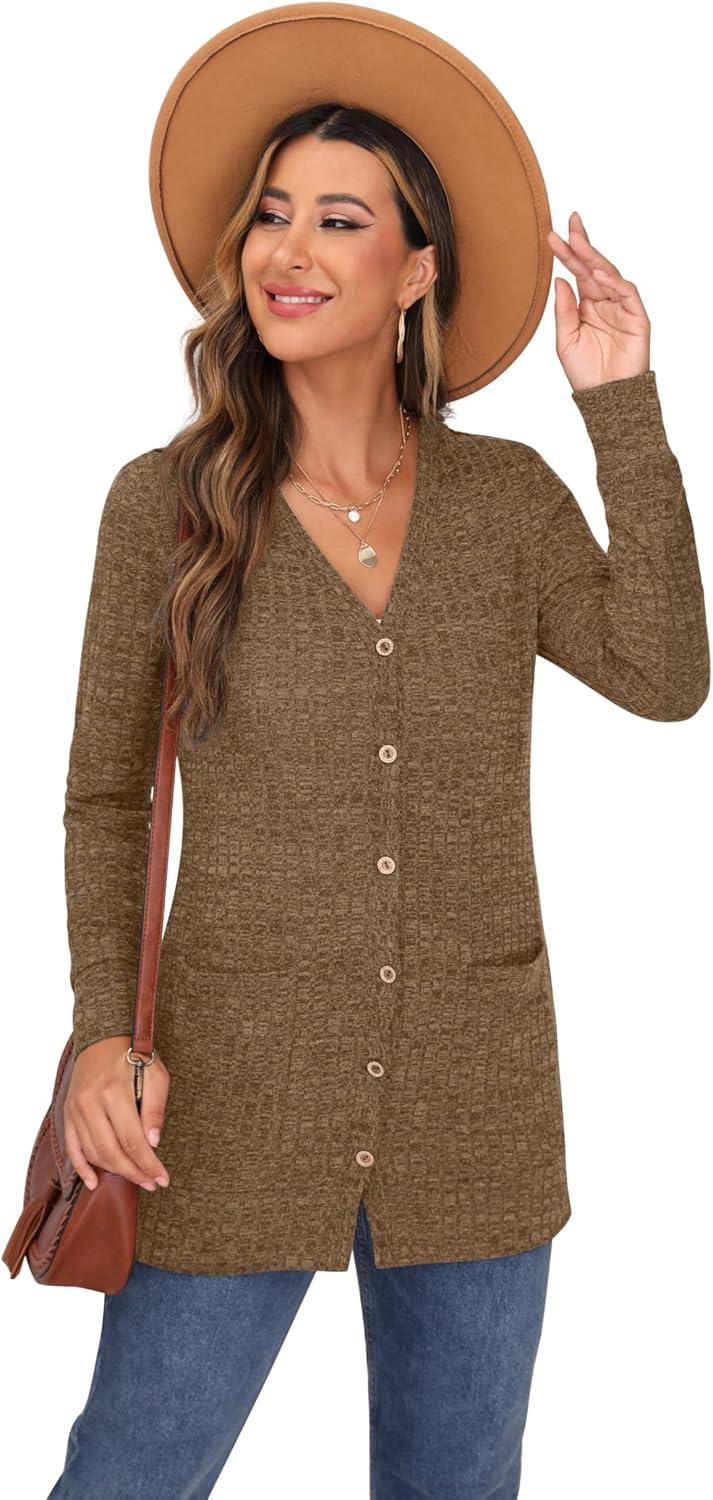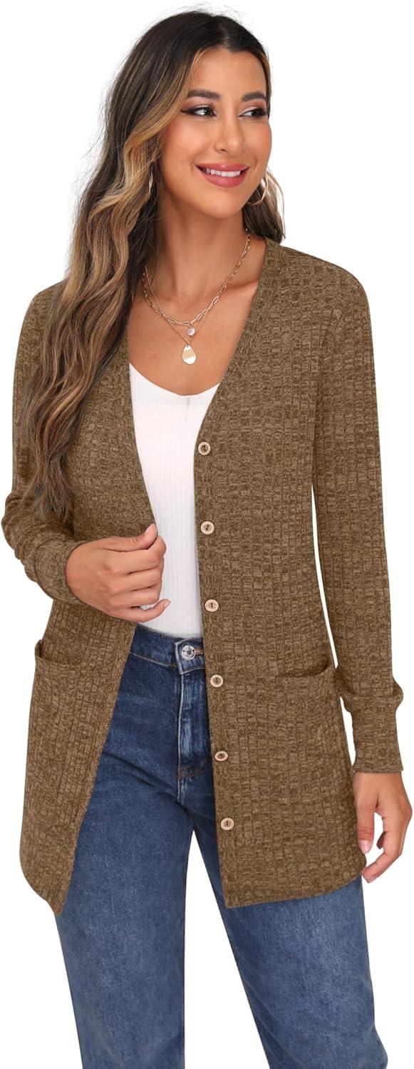 GRECERELLE Women’s Long Sleeve Open Front Cardigan Button Down Ribbed Lightweight Knit Outerwear with Pocket(Caramel)