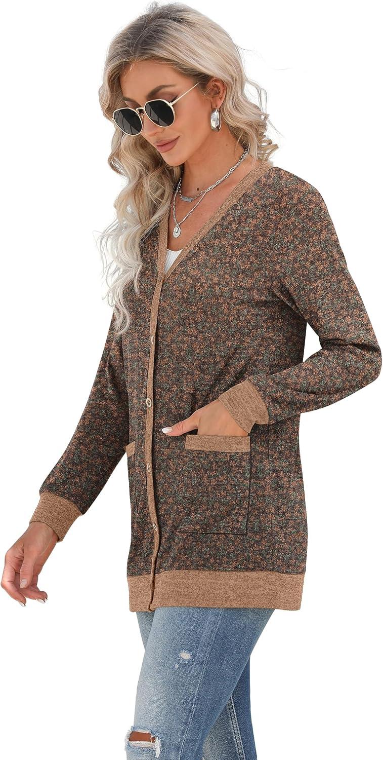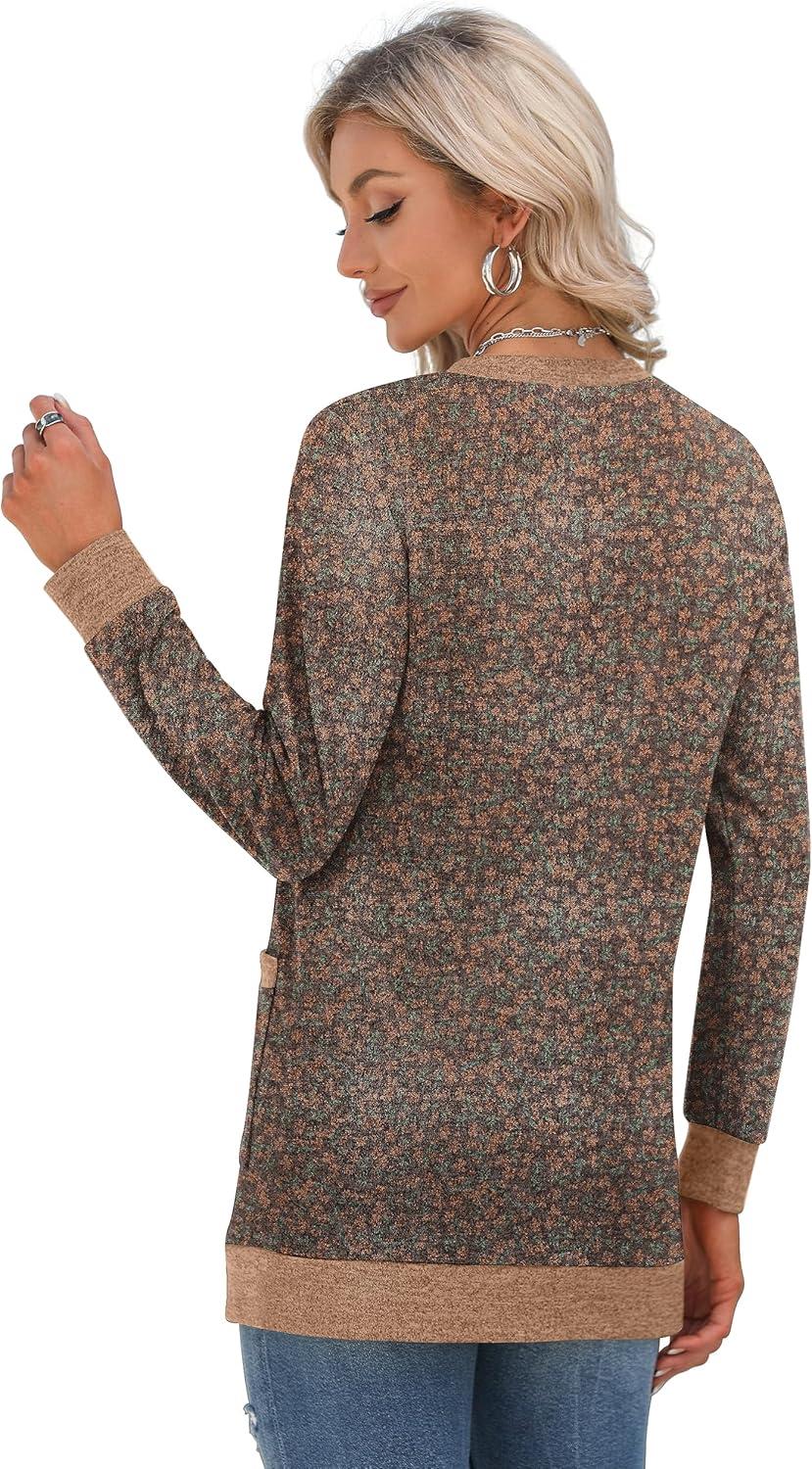 GRECERELLE Women's Long Sleeve Open Front Cardigan Button Down Ribbed Lightweight Knit Outerwear with Pocket(Flower Brown)