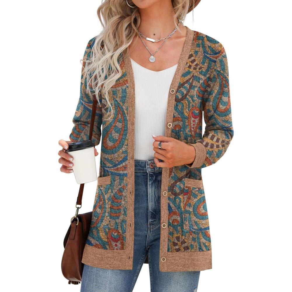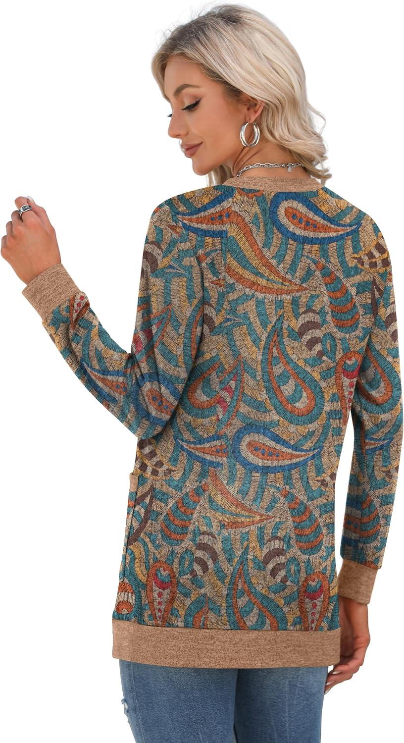 GRECERELLE Women's Long Sleeve Open Front Cardigan Button Down Ribbed Lightweight Knit Outerwear with Pocket(Paisley Blue)