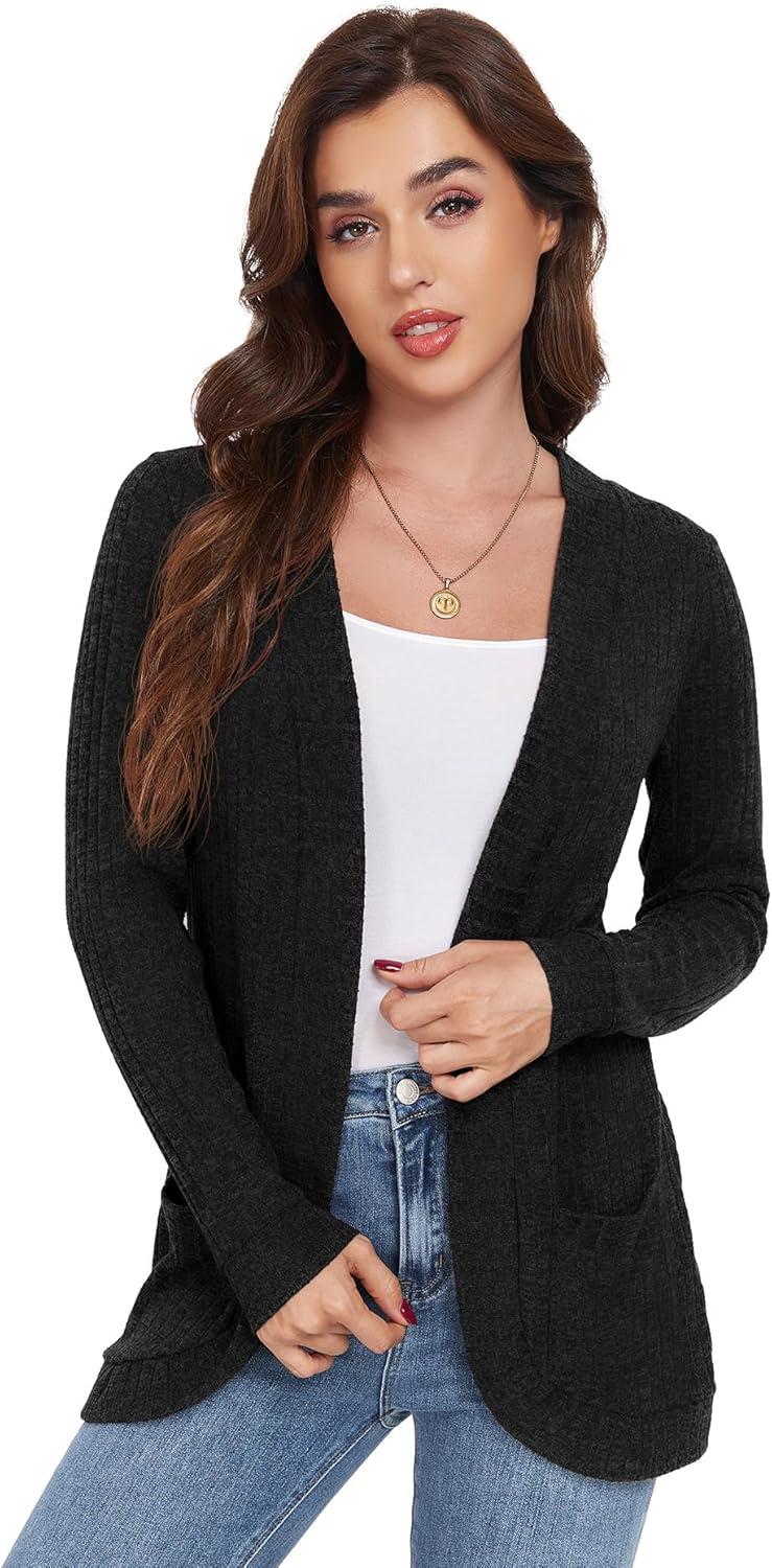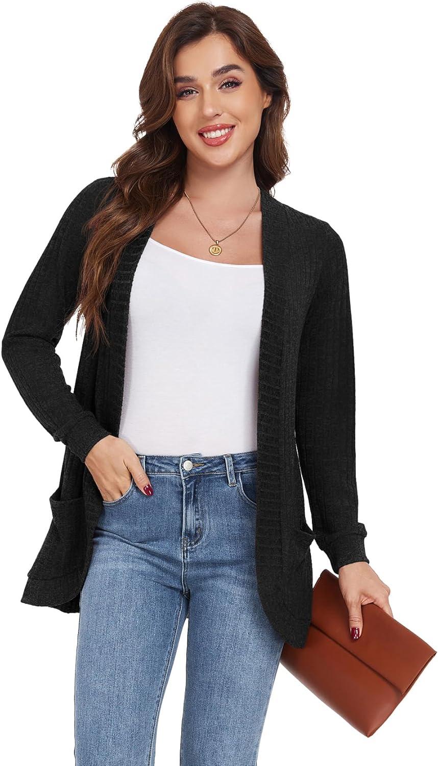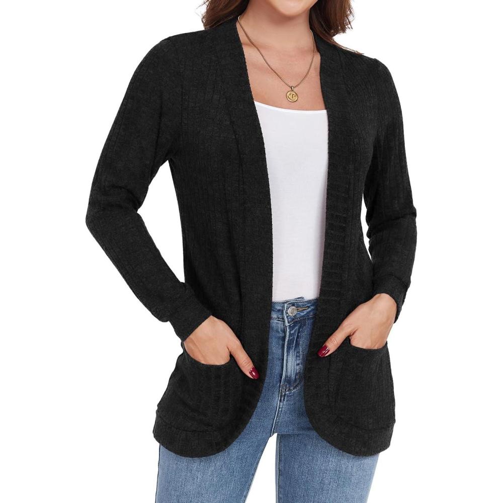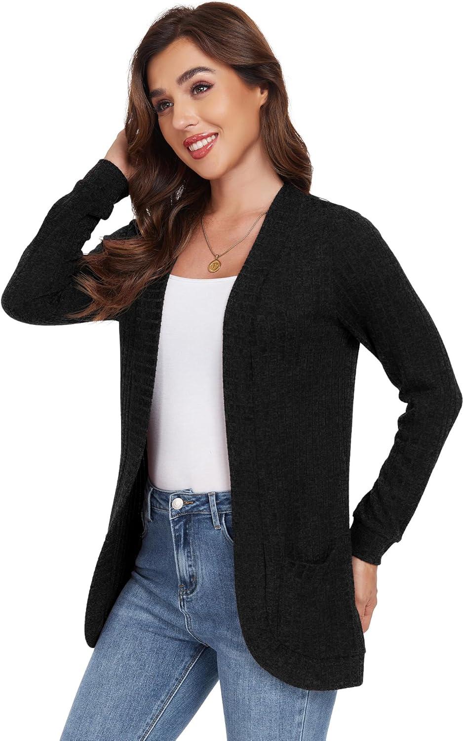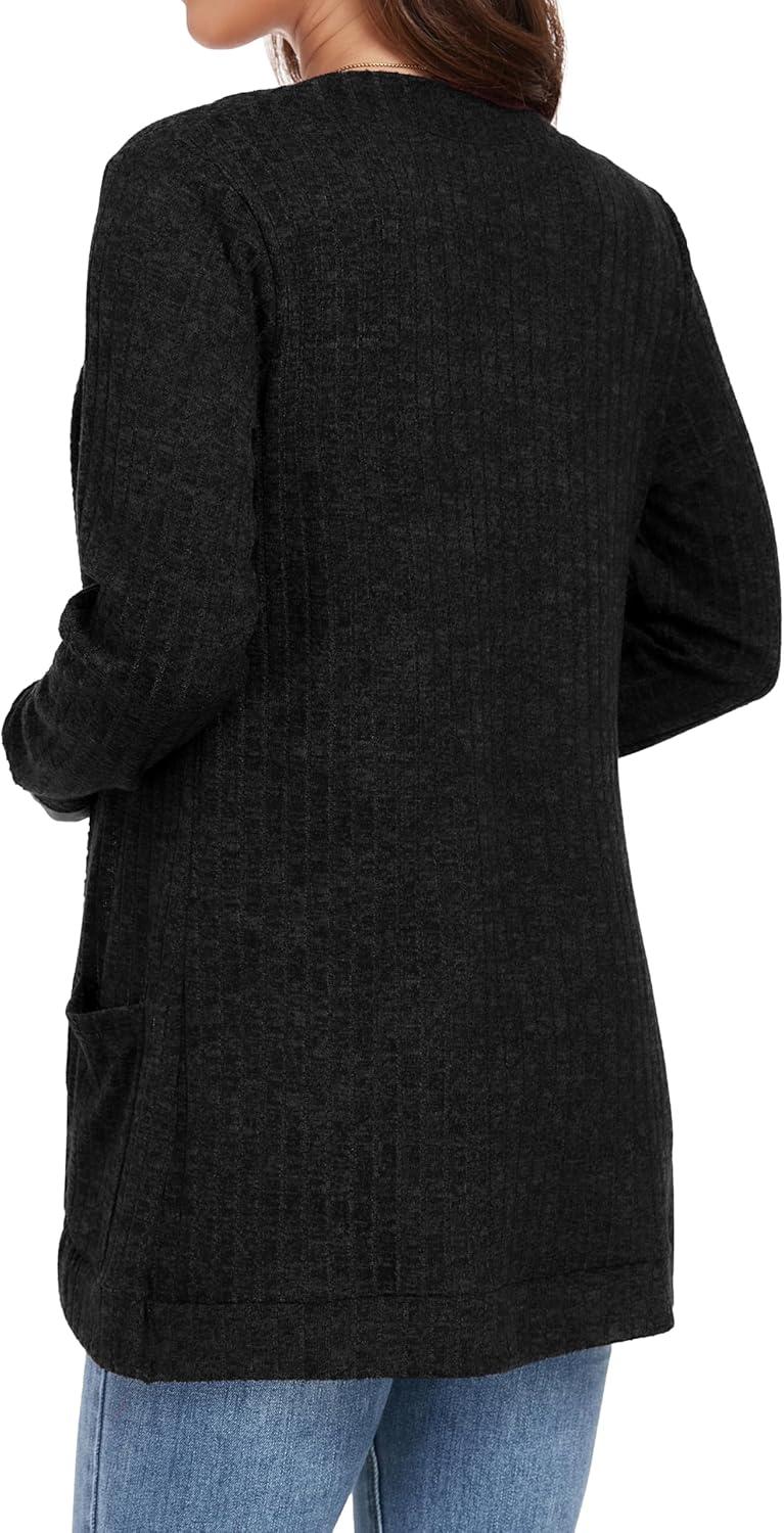 GRECERELLE Womens Long Sleeve Open Front Cardigan Casual V-Neck Curved Hem Ribbed Knit Sweater Outerwear with Pockets(01 Black)