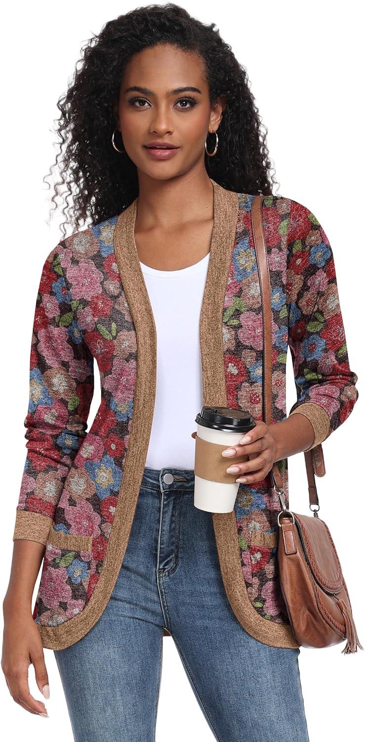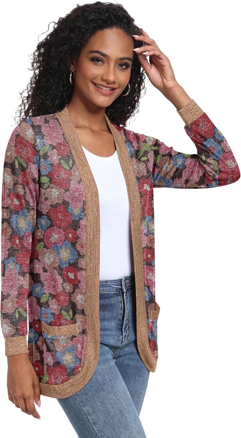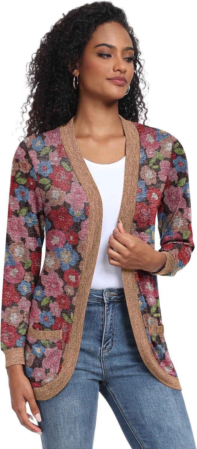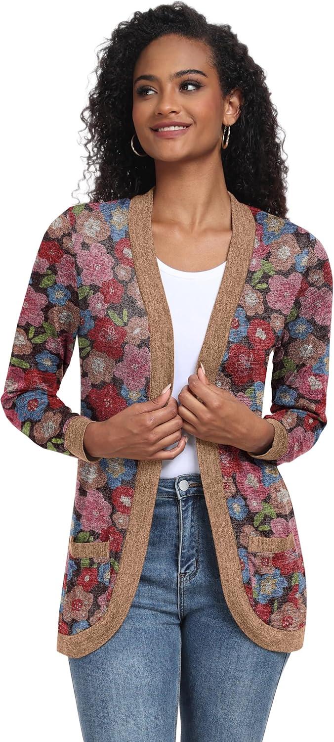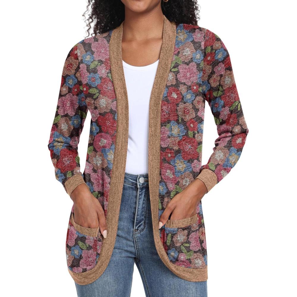 GRECERELLE Womens Long Sleeve Open Front Cardigan Casual V-Neck Curved Hem Ribbed Knit Sweater Outerwear with Pockets(Brown Pink Flower)