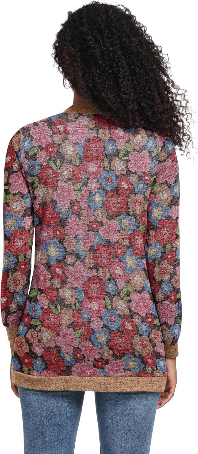 imageGRECERELLE Womens Long Sleeve Open Front Cardigan Casual VNeck Curved Hem Ribbed Knit Sweater Outerwear with PocketsBrown Pink Flower