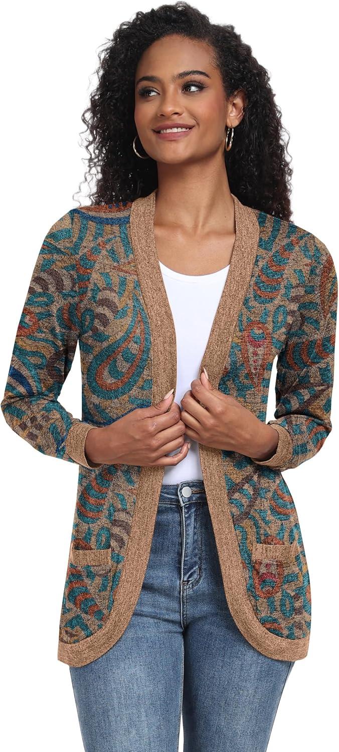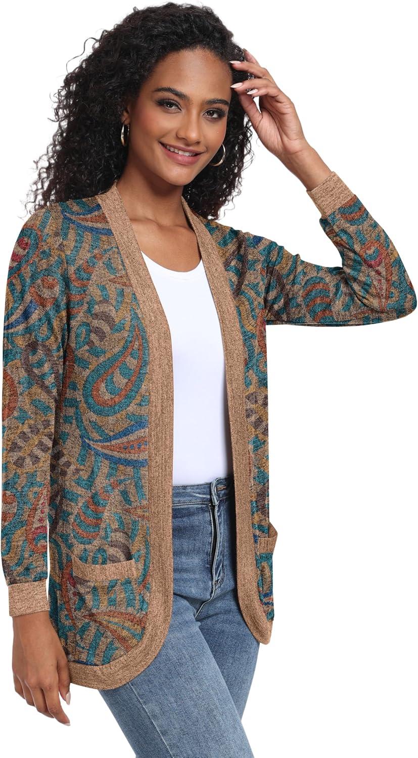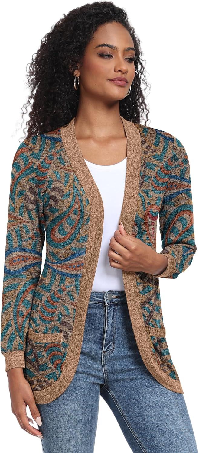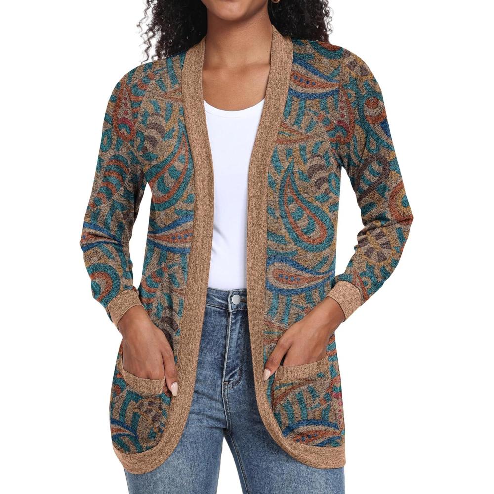 GRECERELLE Womens Long Sleeve Open Front Cardigan Casual V-Neck Curved Hem Ribbed Knit Sweater Outerwear with Pockets(Paisley Blue)