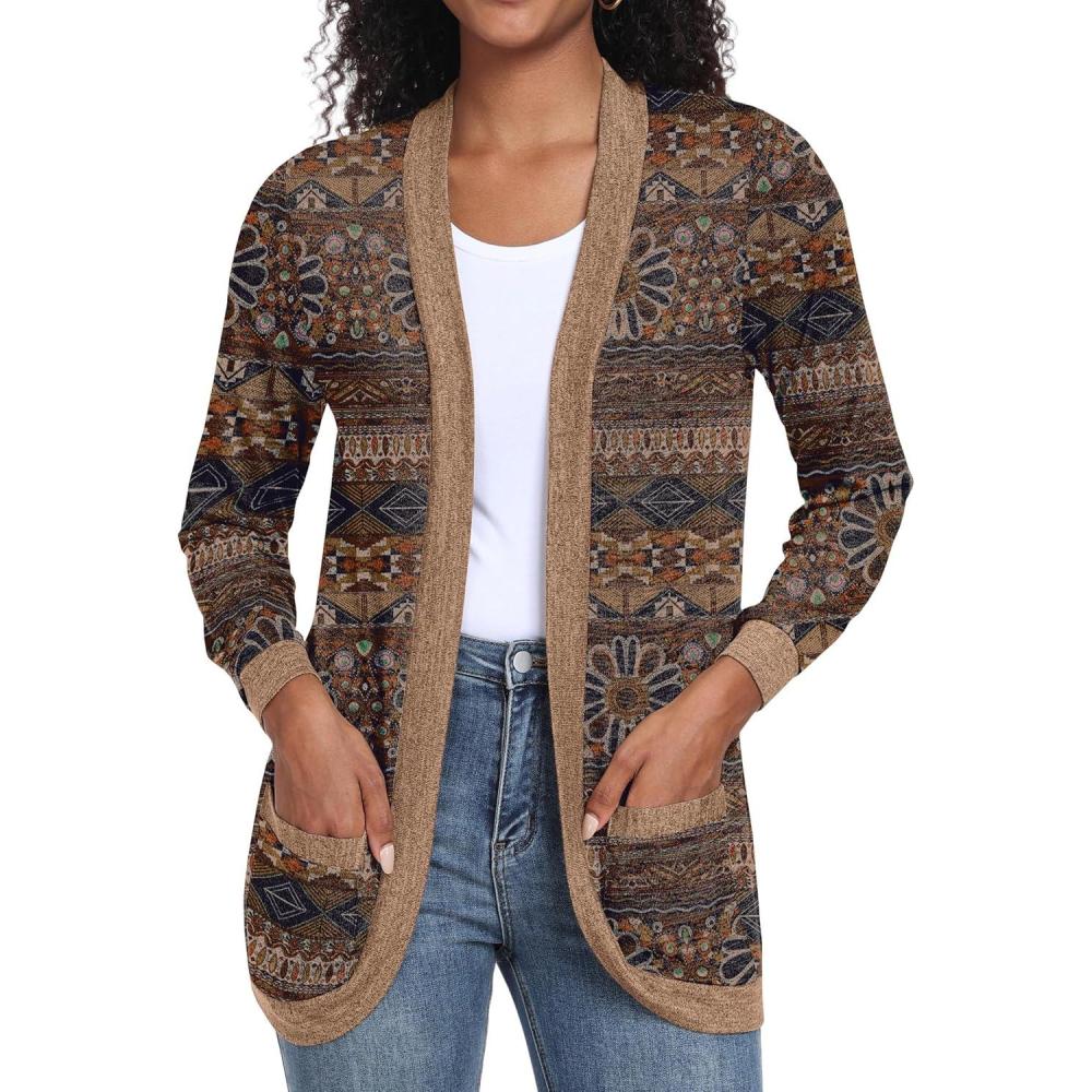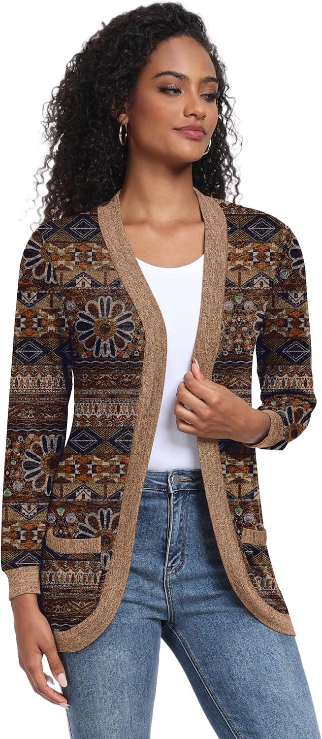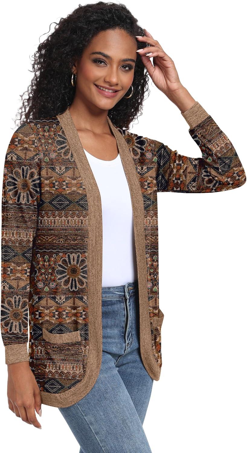 GRECERELLE Womens Long Sleeve Open Front Cardigan Casual V-Neck Curved Hem Ribbed Knit Sweater Outerwear with Pockets(Round Flower Brown)