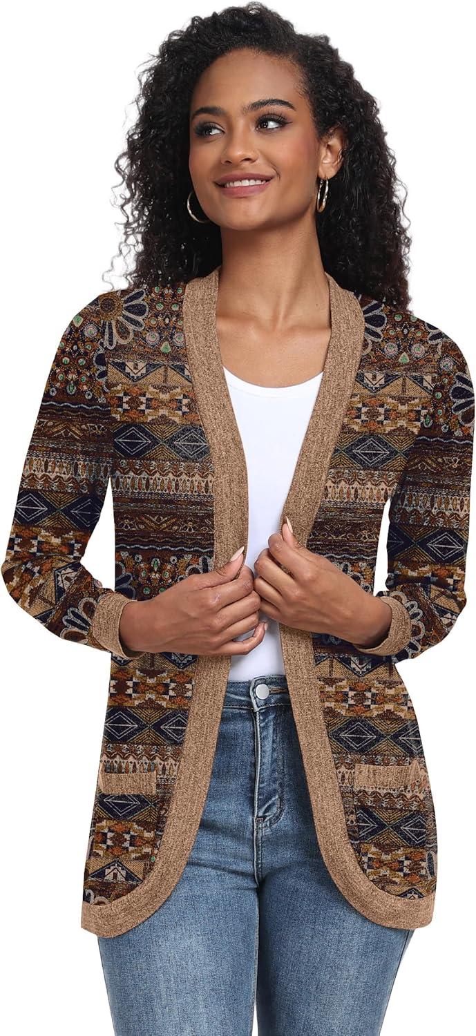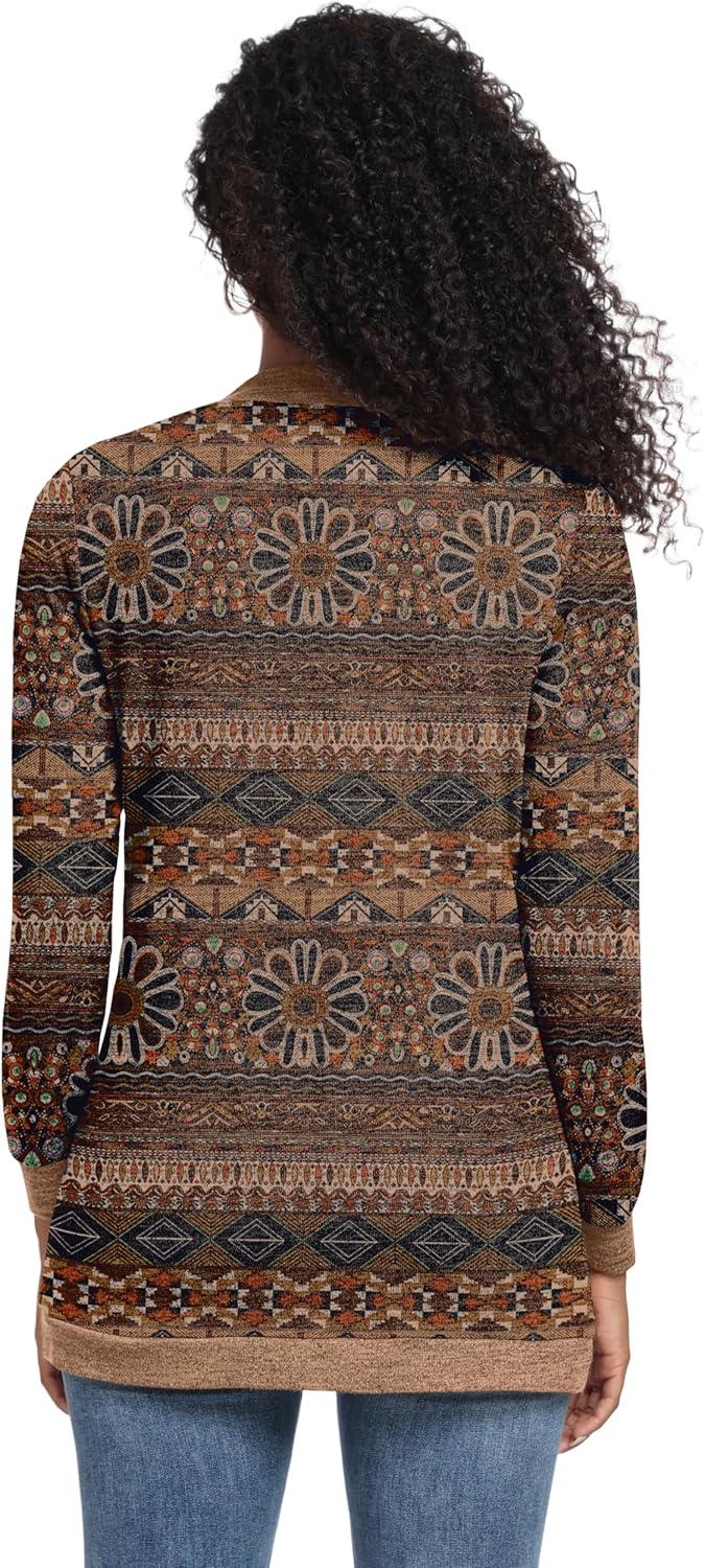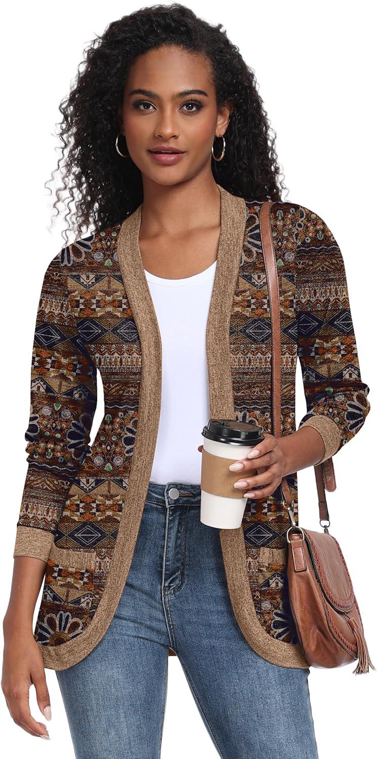GRECERELLE Womens Long Sleeve Open Front Cardigan Casual V-Neck Curved Hem Ribbed Knit Sweater Outerwear with Pockets(Round Flower Brown)