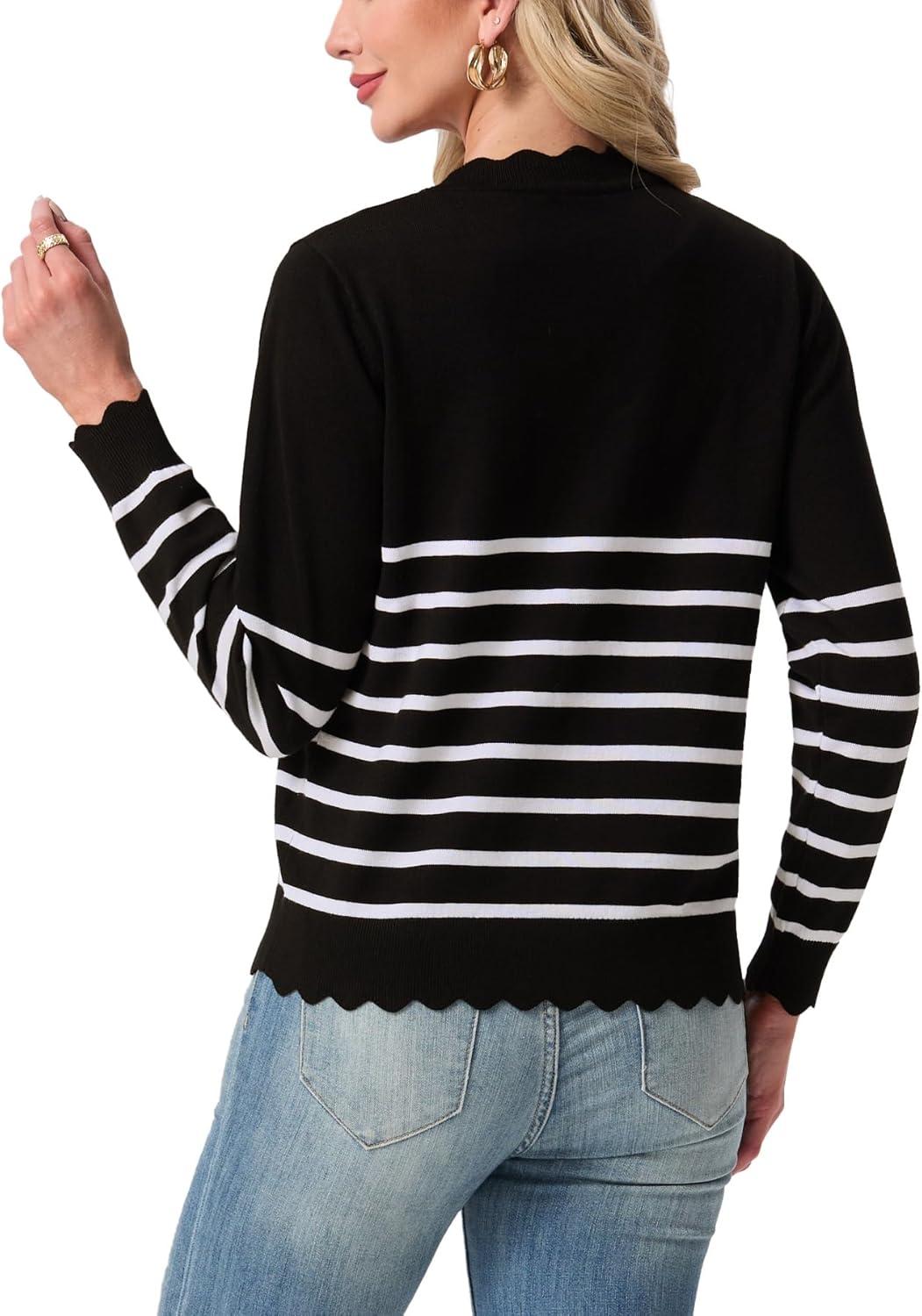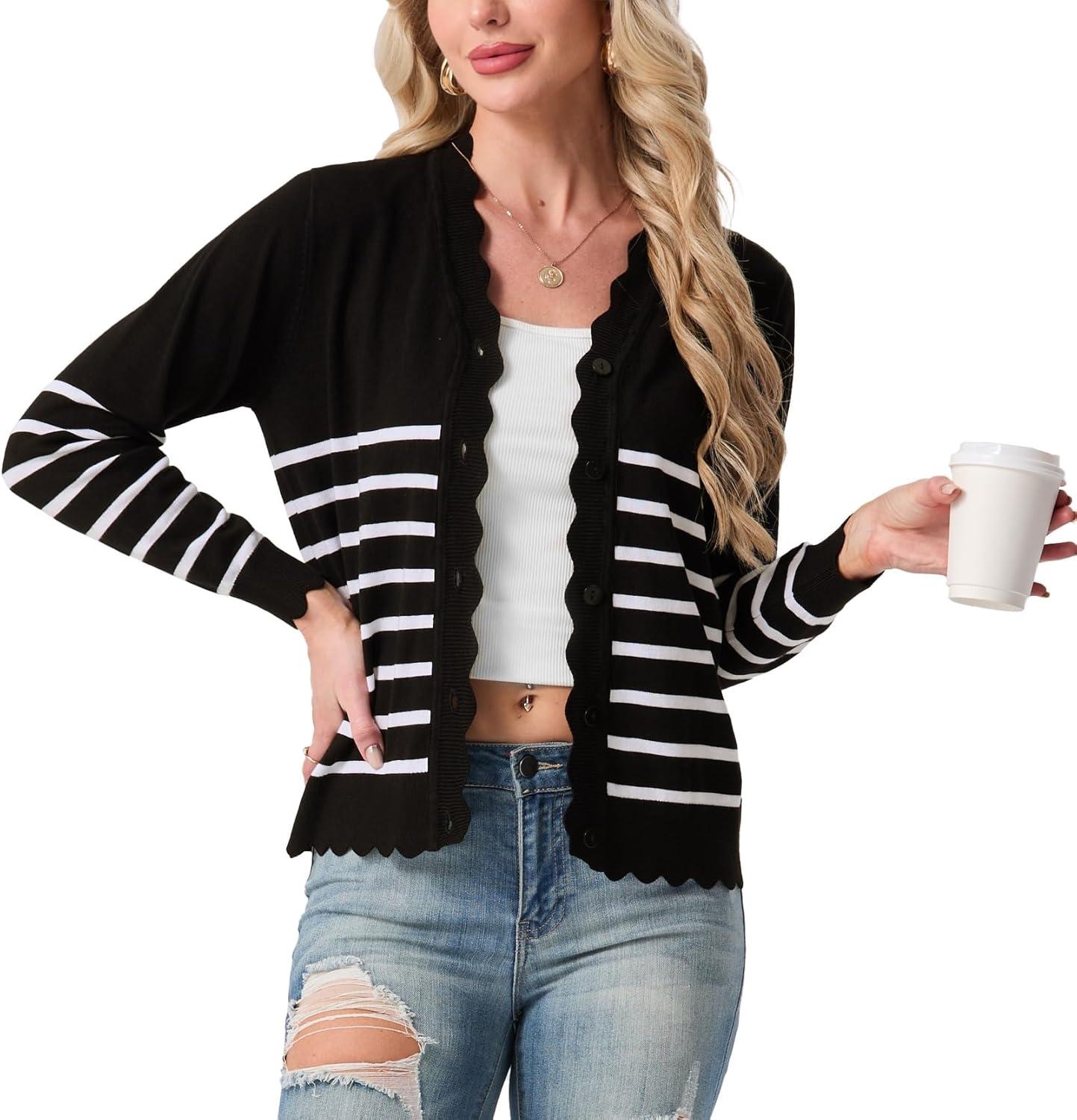 GRECERELLE Women's Long Sleeve V-Neck Button Down Cardigan Knit Shrugs Sweater(Striped Black White)