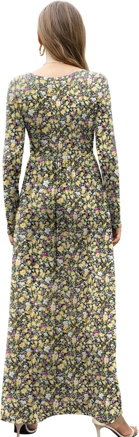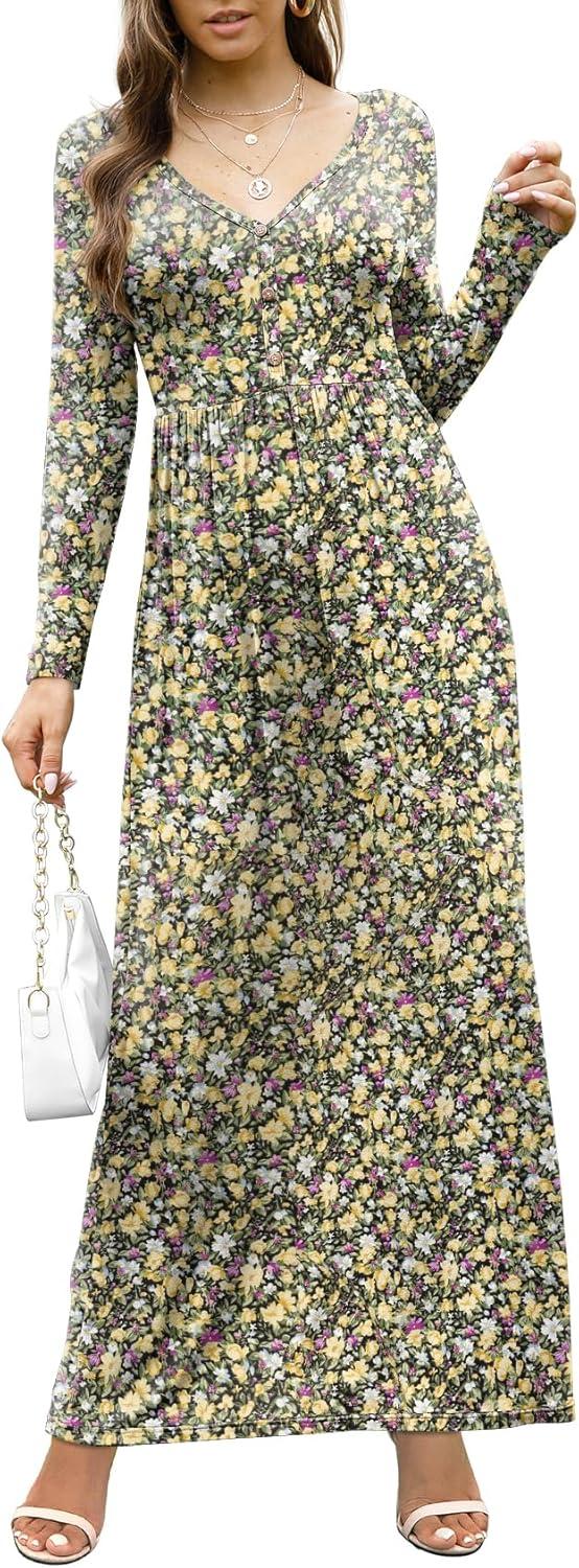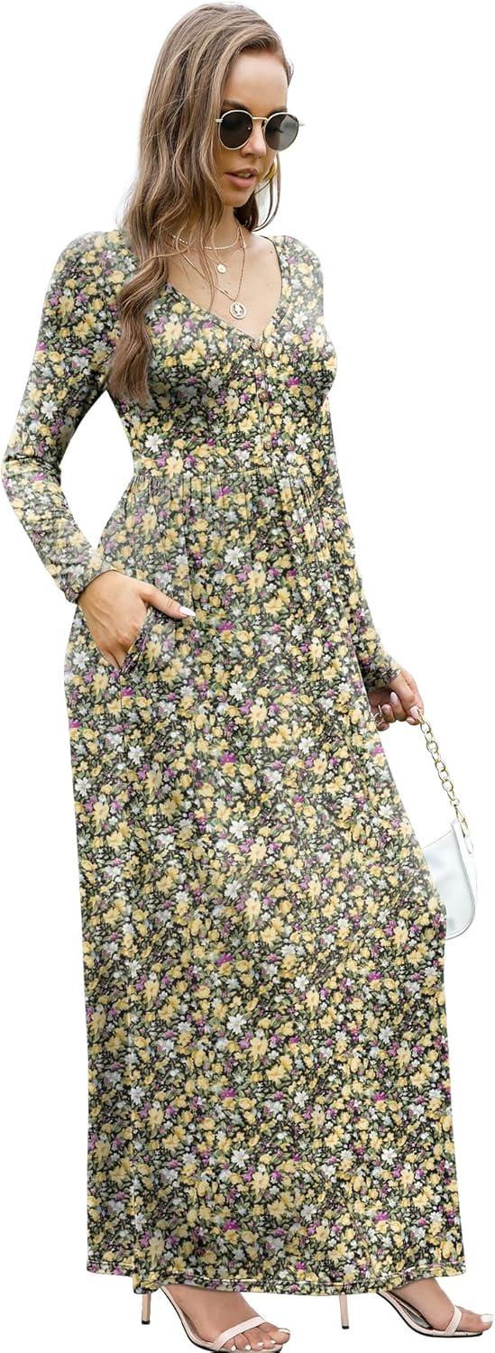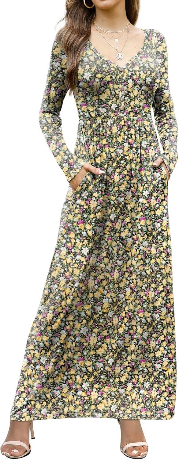 GRECERELLE Womens Long Sleeve V Neck Casual Button Maxi Dress 2025 with Pockets(Black Yellow)