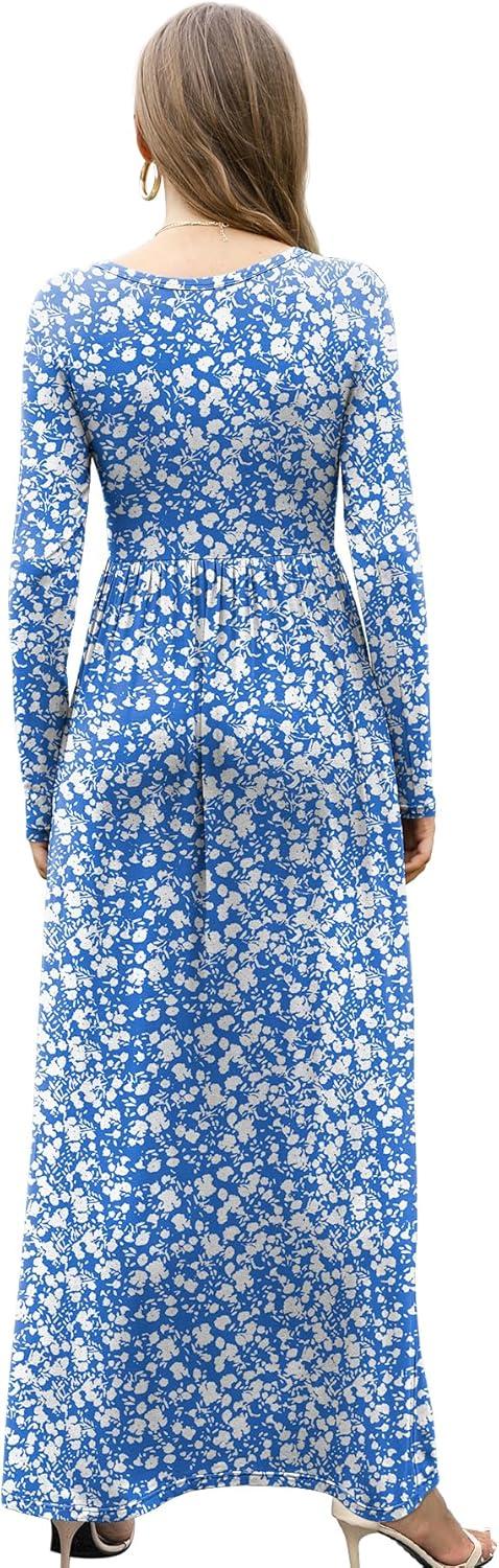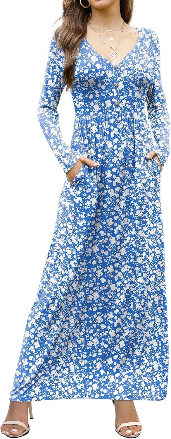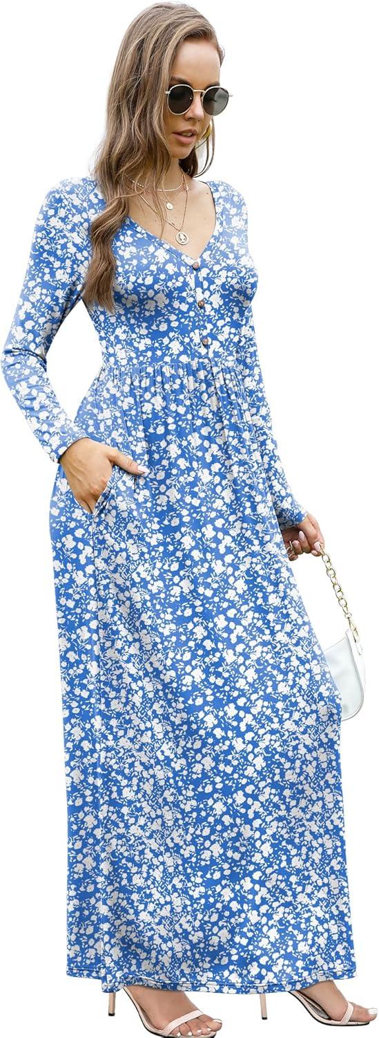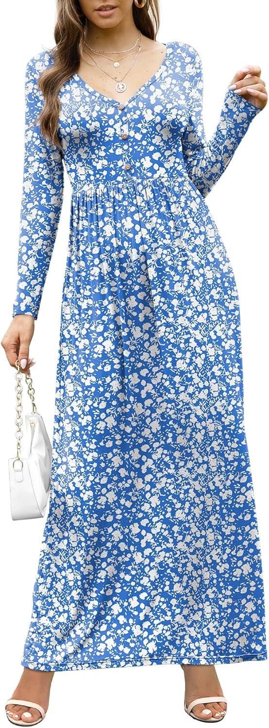 GRECERELLE Womens Long Sleeve V Neck Casual Button Maxi Dress 2025 with Pockets(Blue Flowers White)