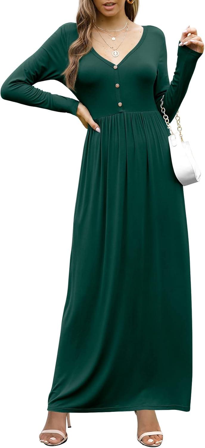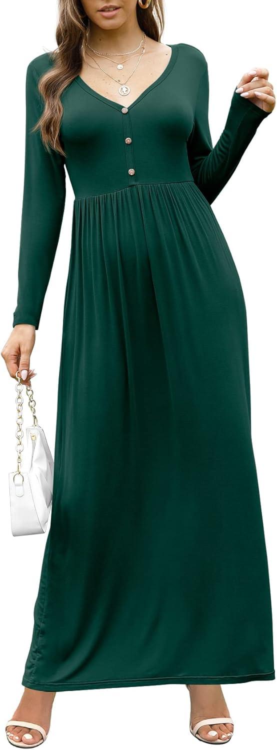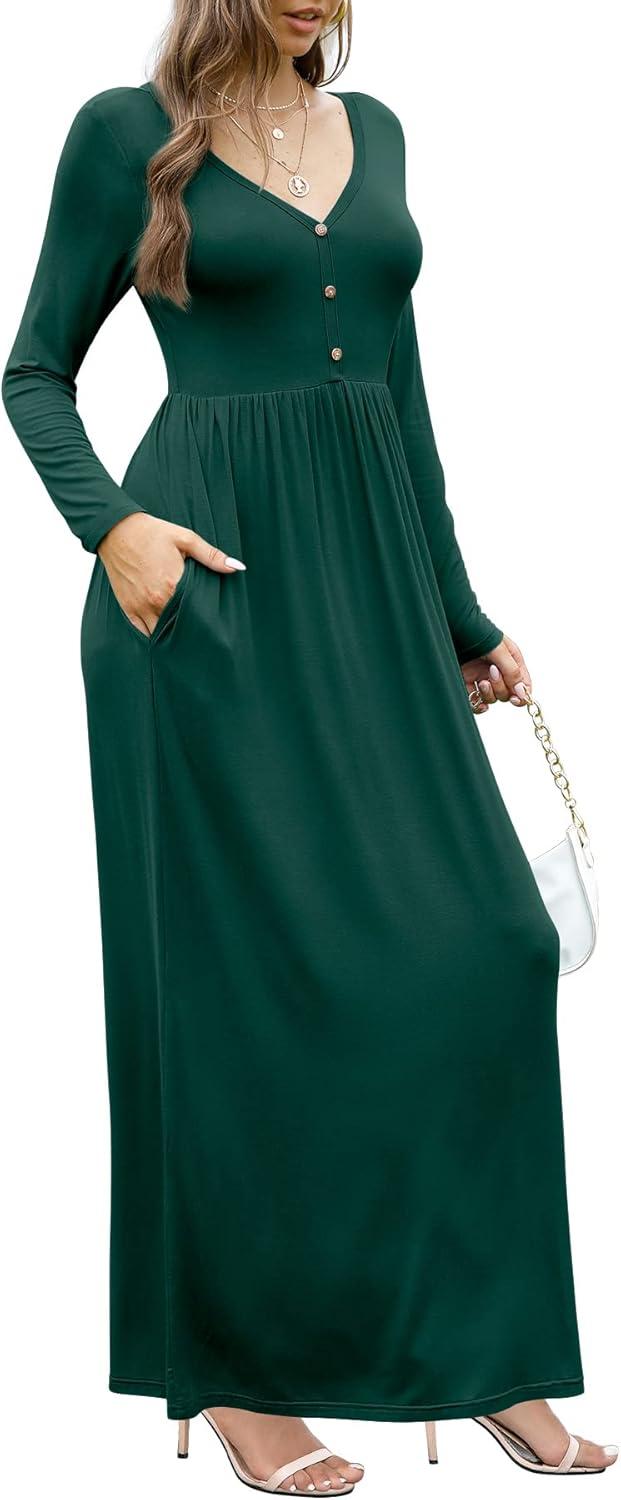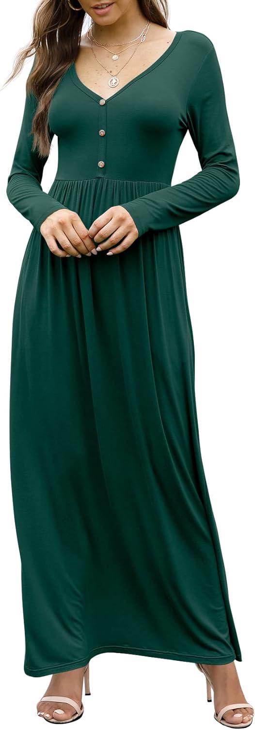 GRECERELLE Womens Long Sleeve V Neck Casual Button Maxi Dress 2025 with Pockets(Dark Green)