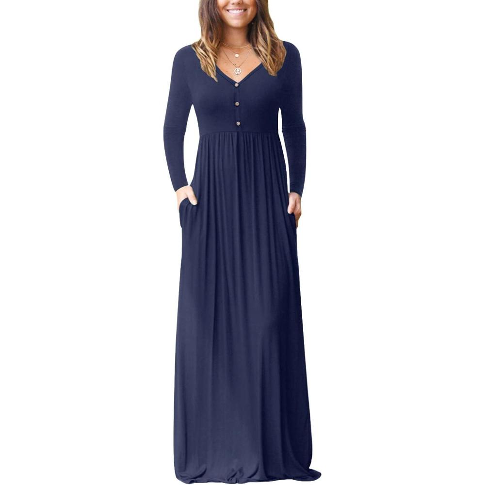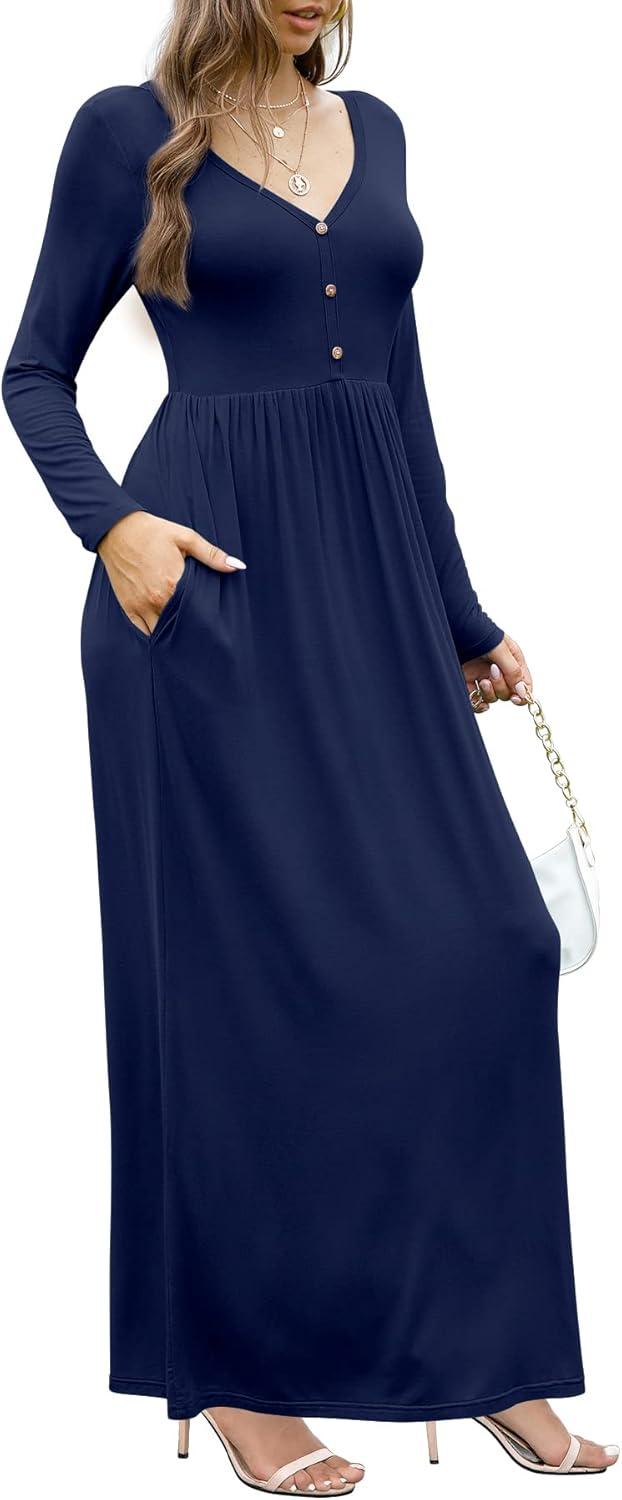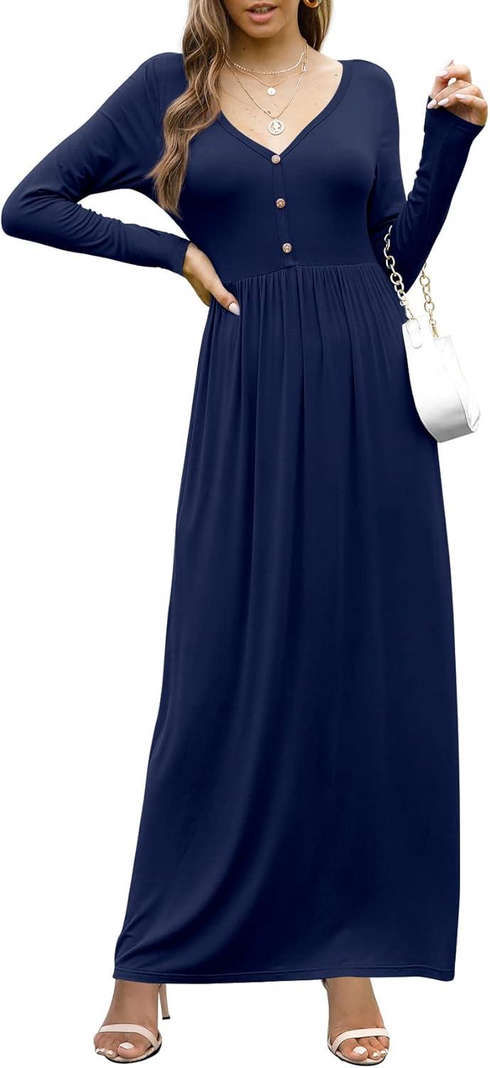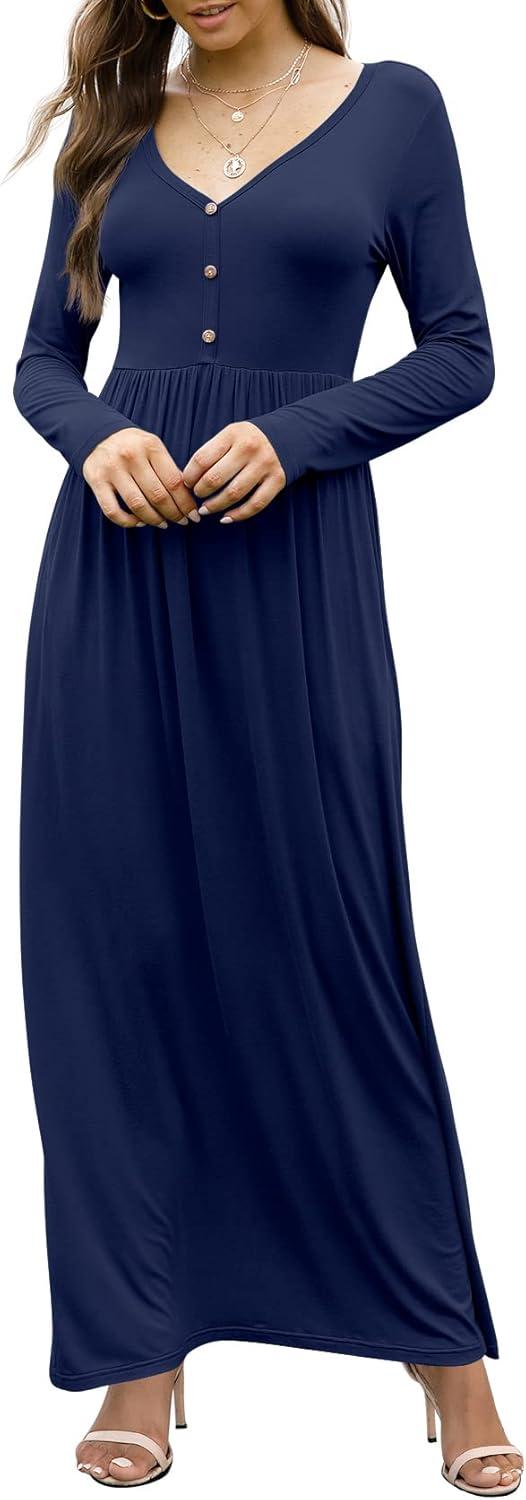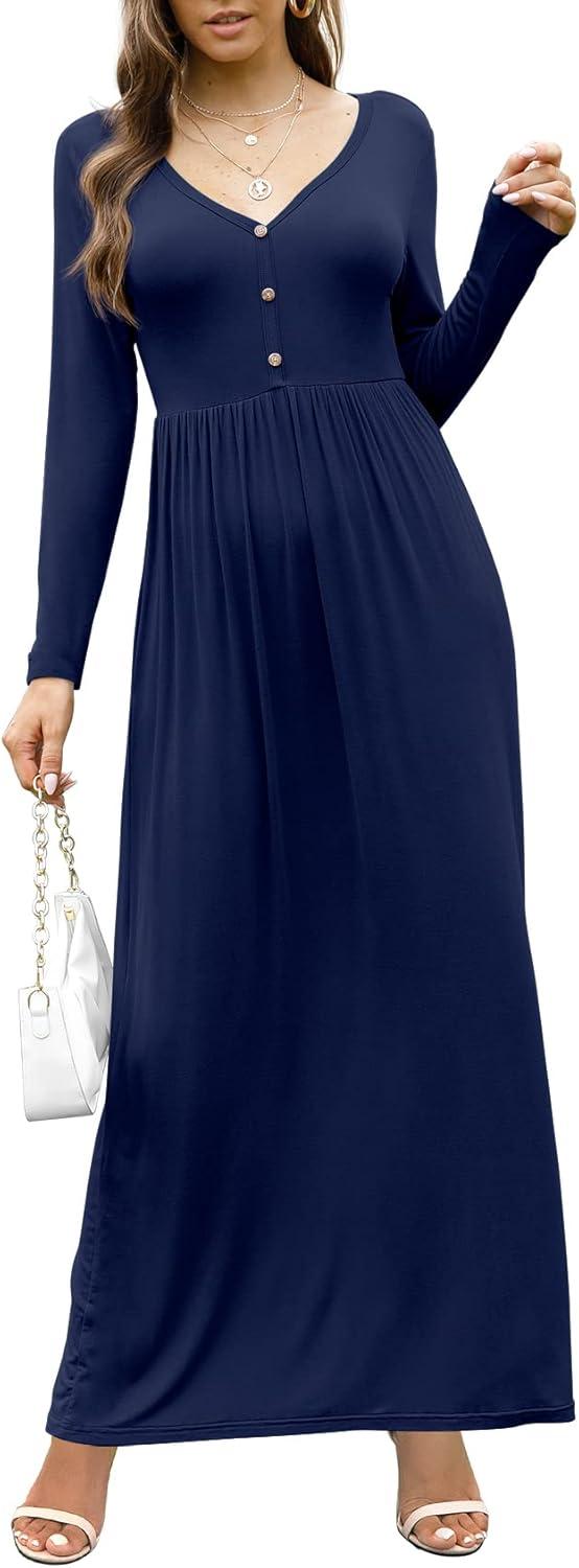 GRECERELLE Womens Long Sleeve V Neck Casual Button Maxi Dress 2025 with Pockets(Navy Blue)