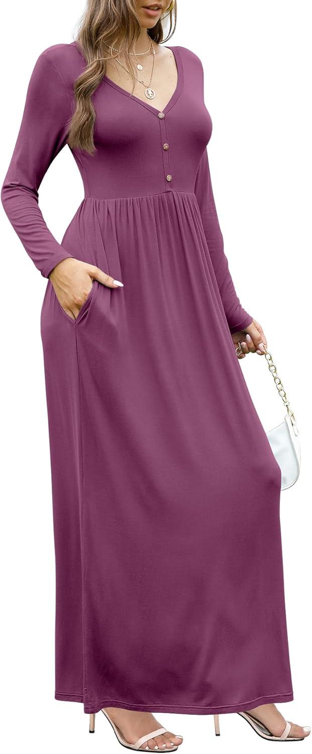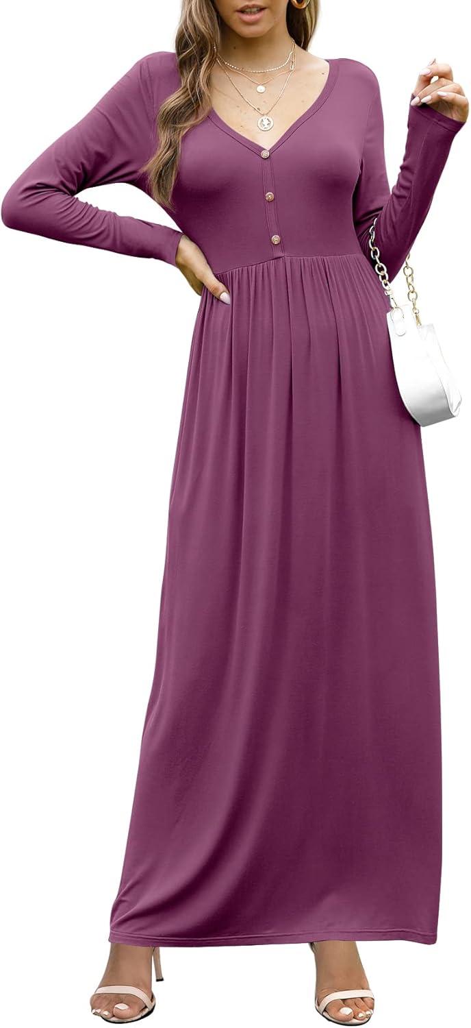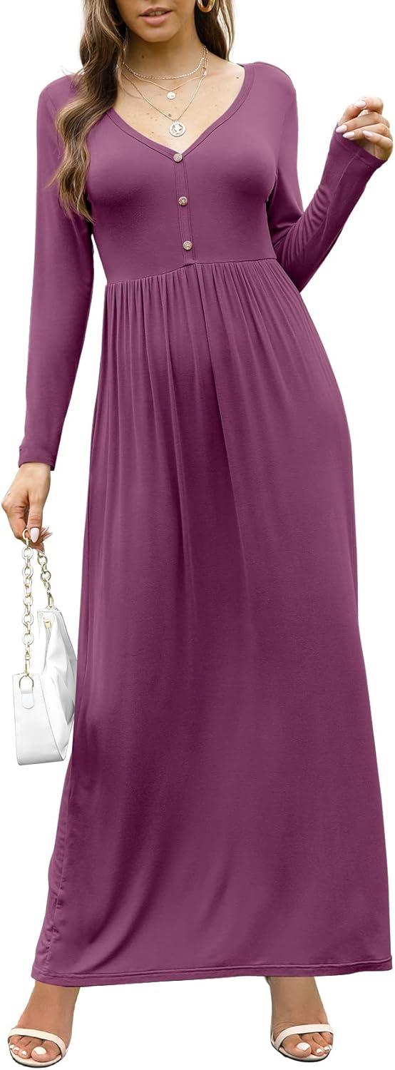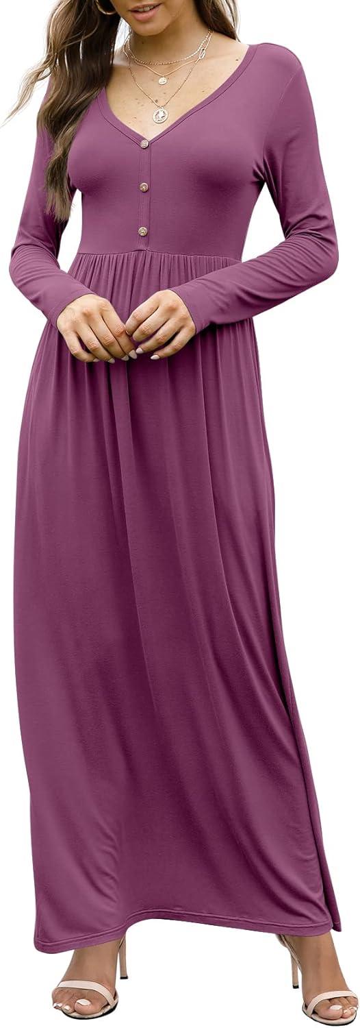 GRECERELLE Womens Long Sleeve V Neck Casual Button Maxi Dress 2025 with Pockets(Red Gray)