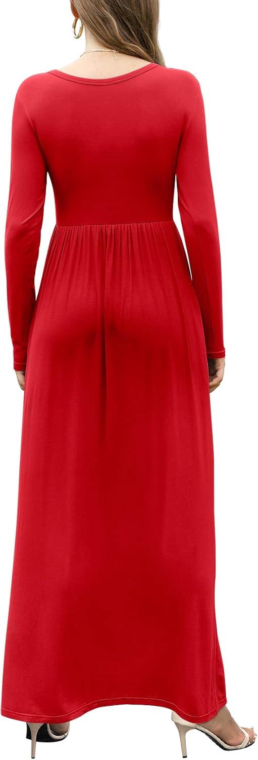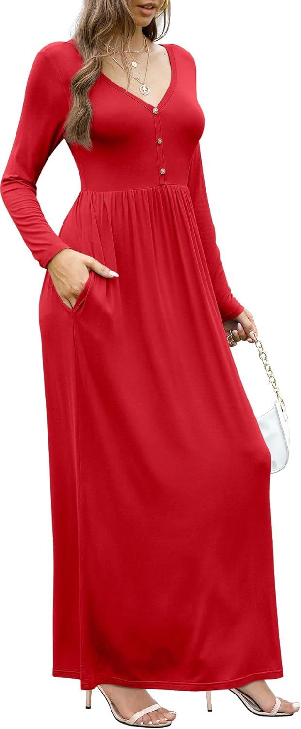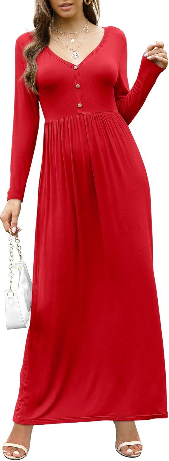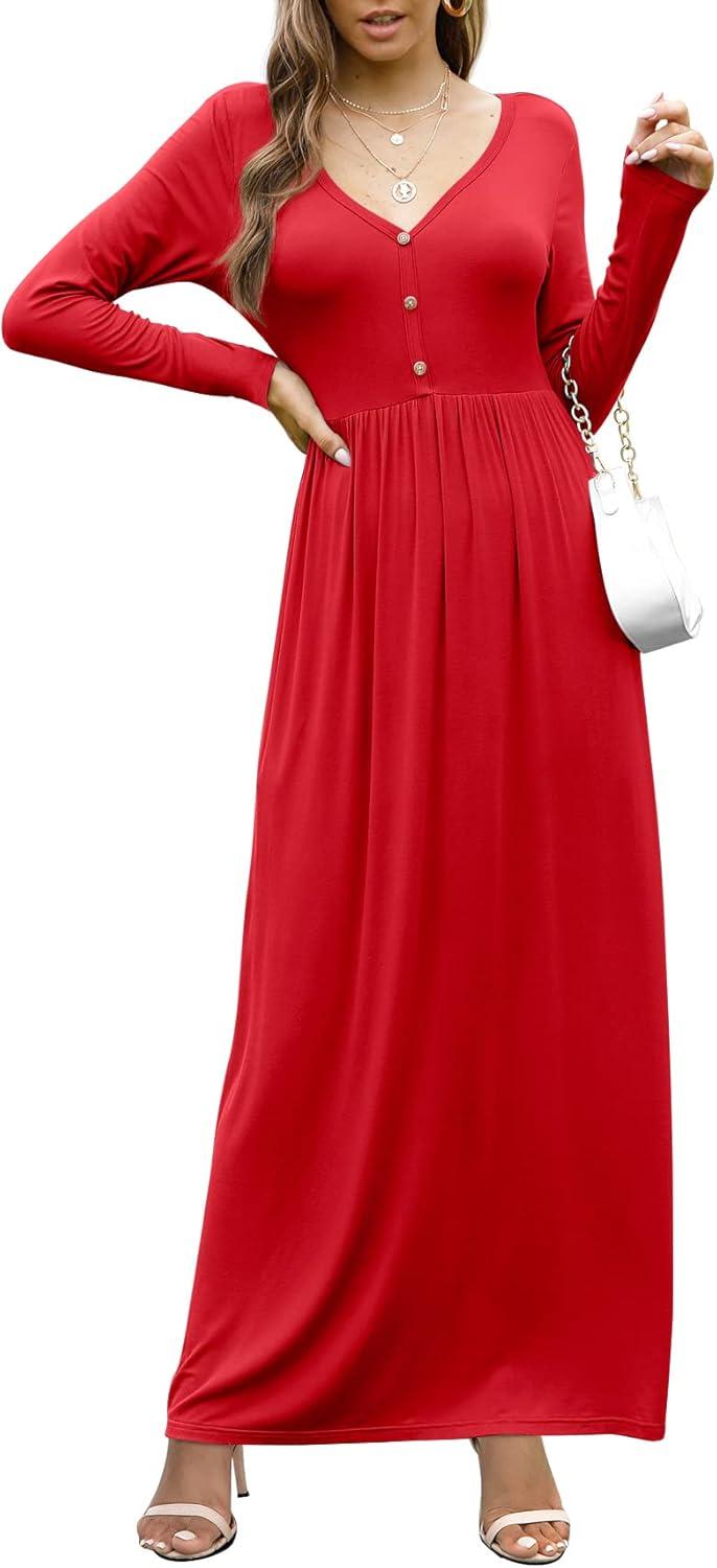 GRECERELLE Womens Long Sleeve V Neck Casual Button Maxi Dress 2025 with Pockets(Red)
