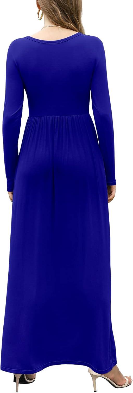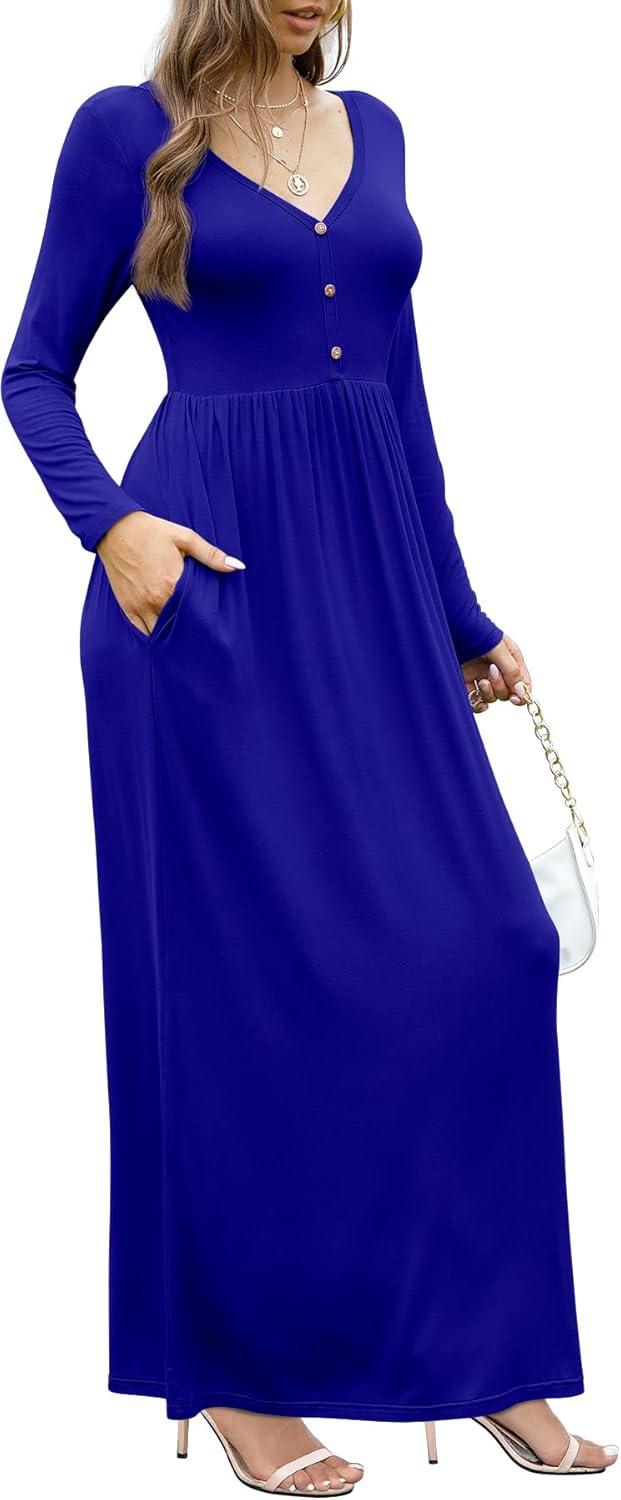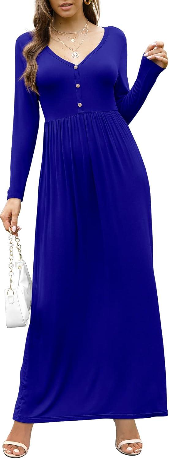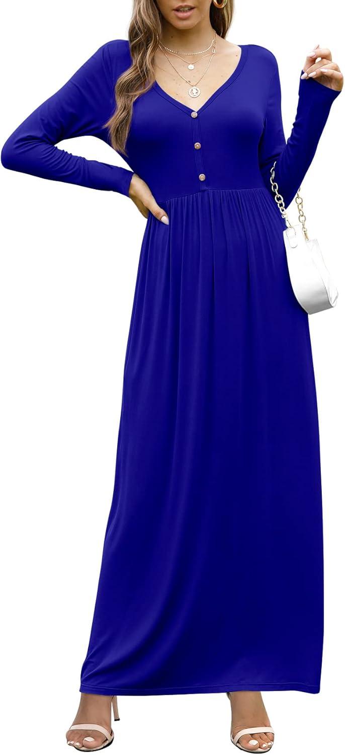 GRECERELLE Womens Long Sleeve V Neck Casual Button Maxi Dress 2025 with Pockets(Royal Blue)