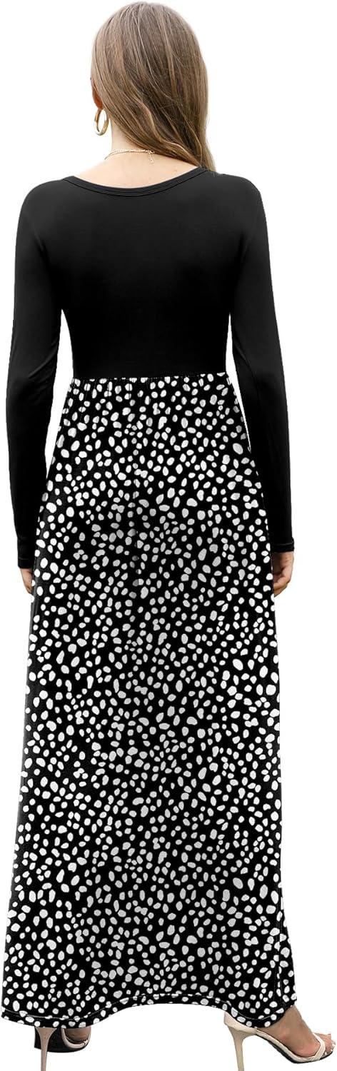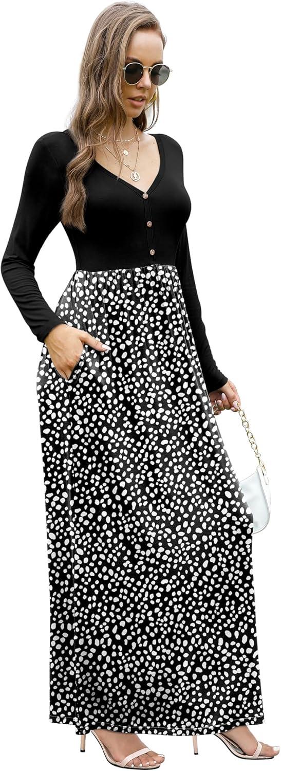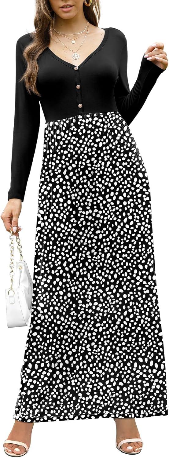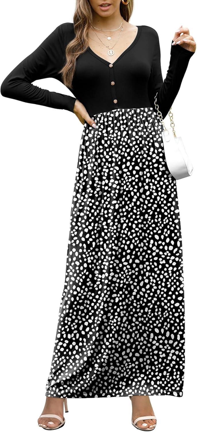 GRECERELLE Womens Long Sleeve V Neck Casual Button Maxi Dress 2025 with Pockets(Spotted Black)